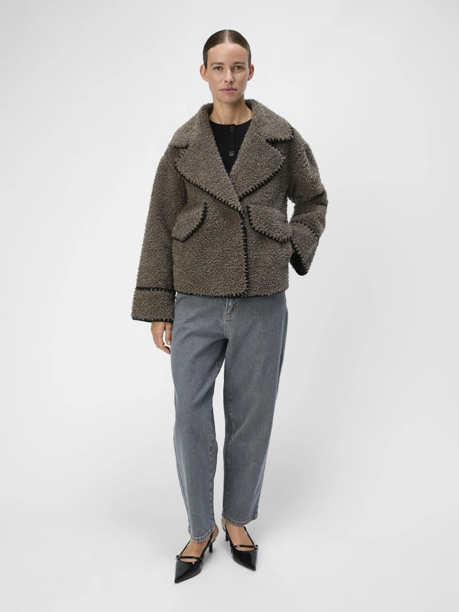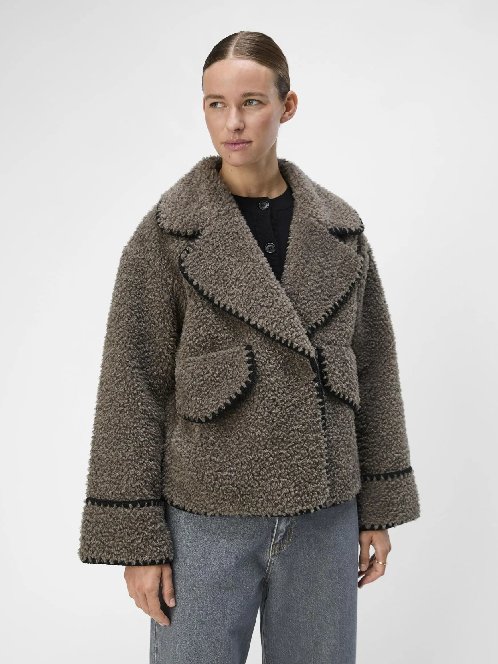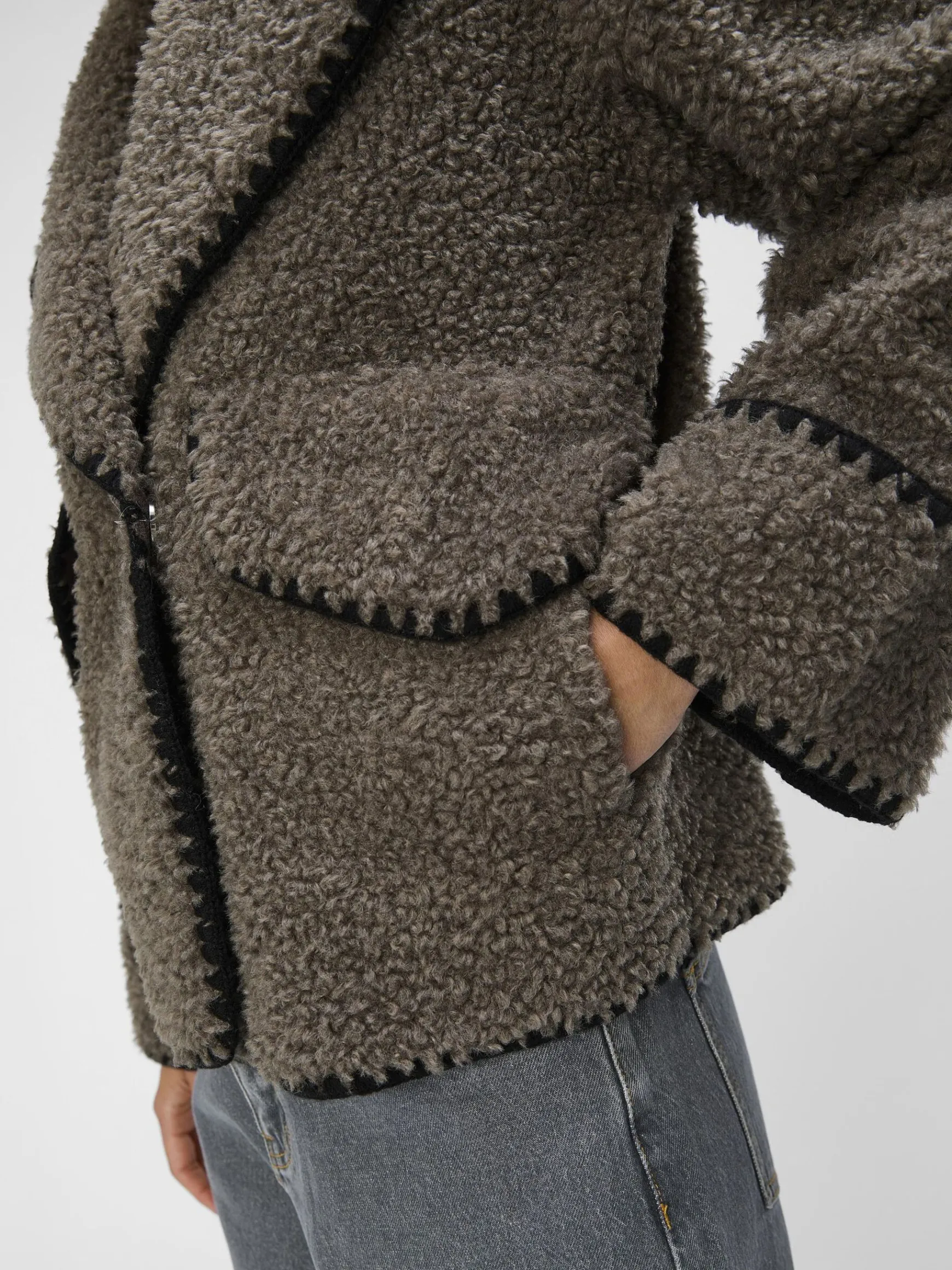 – Kort teddyjakke- Oversized krave med runde kanter- Syninger i kontrast i kanterne- Forlommer med klapper- Lange ærmer…