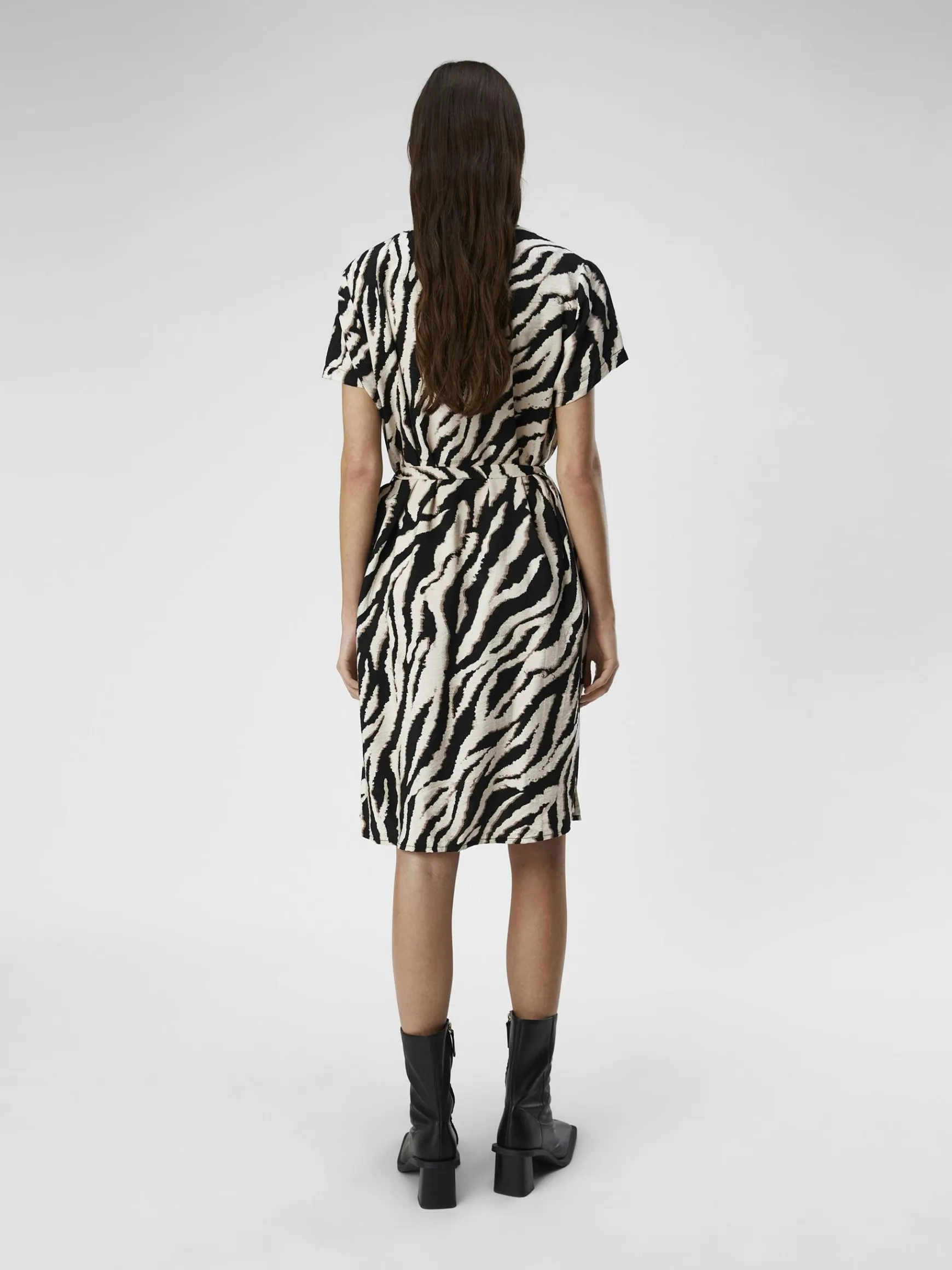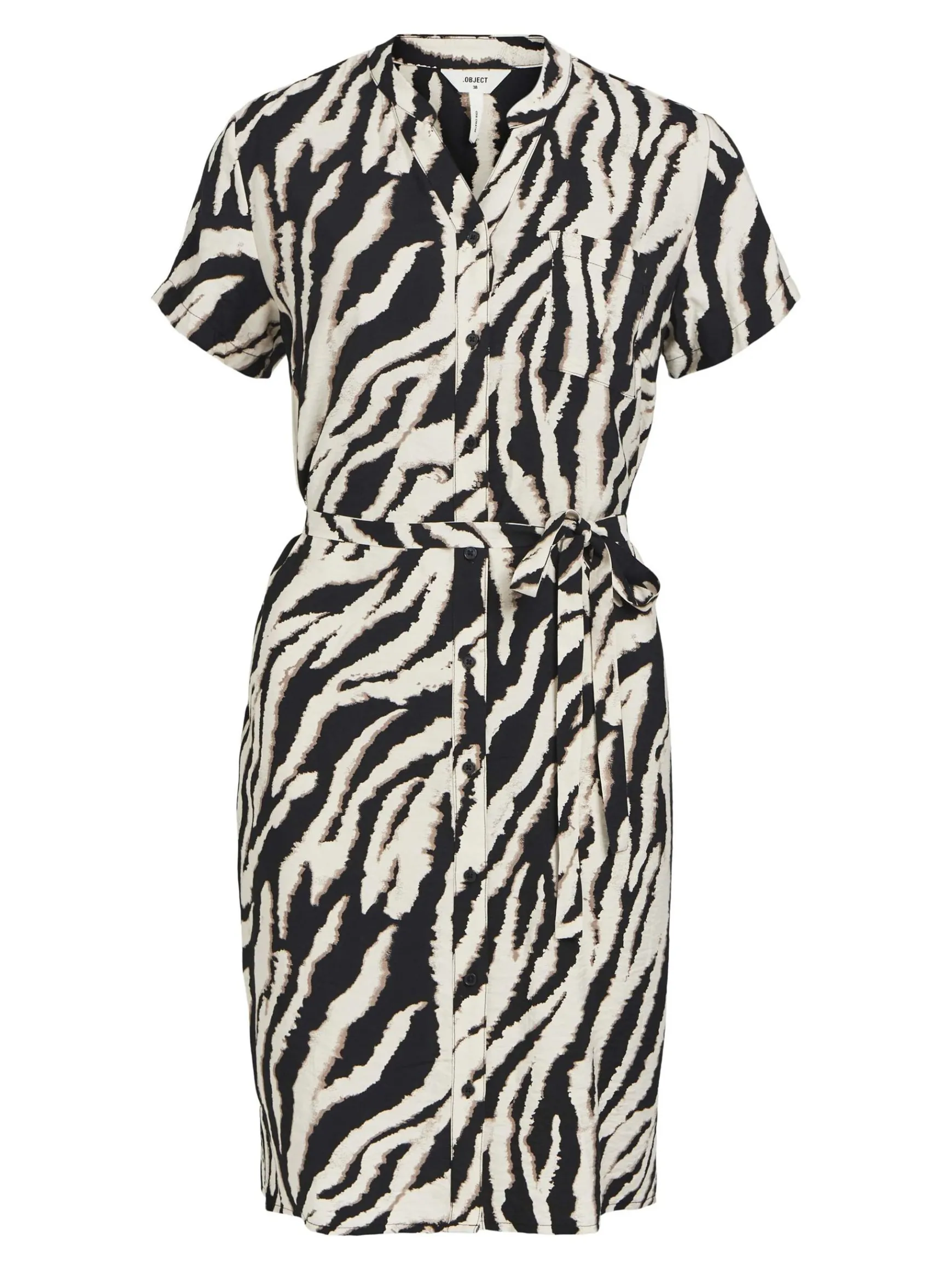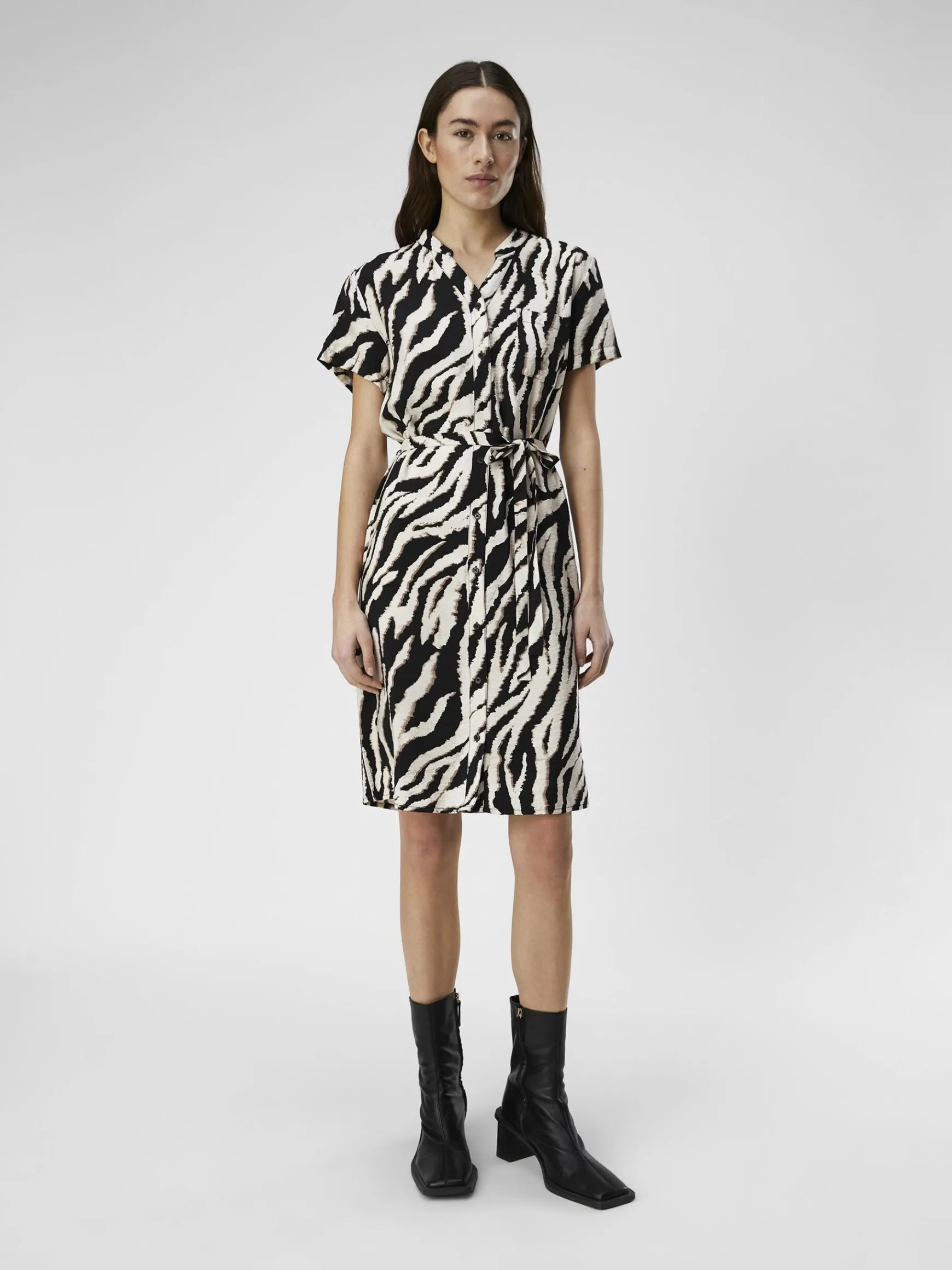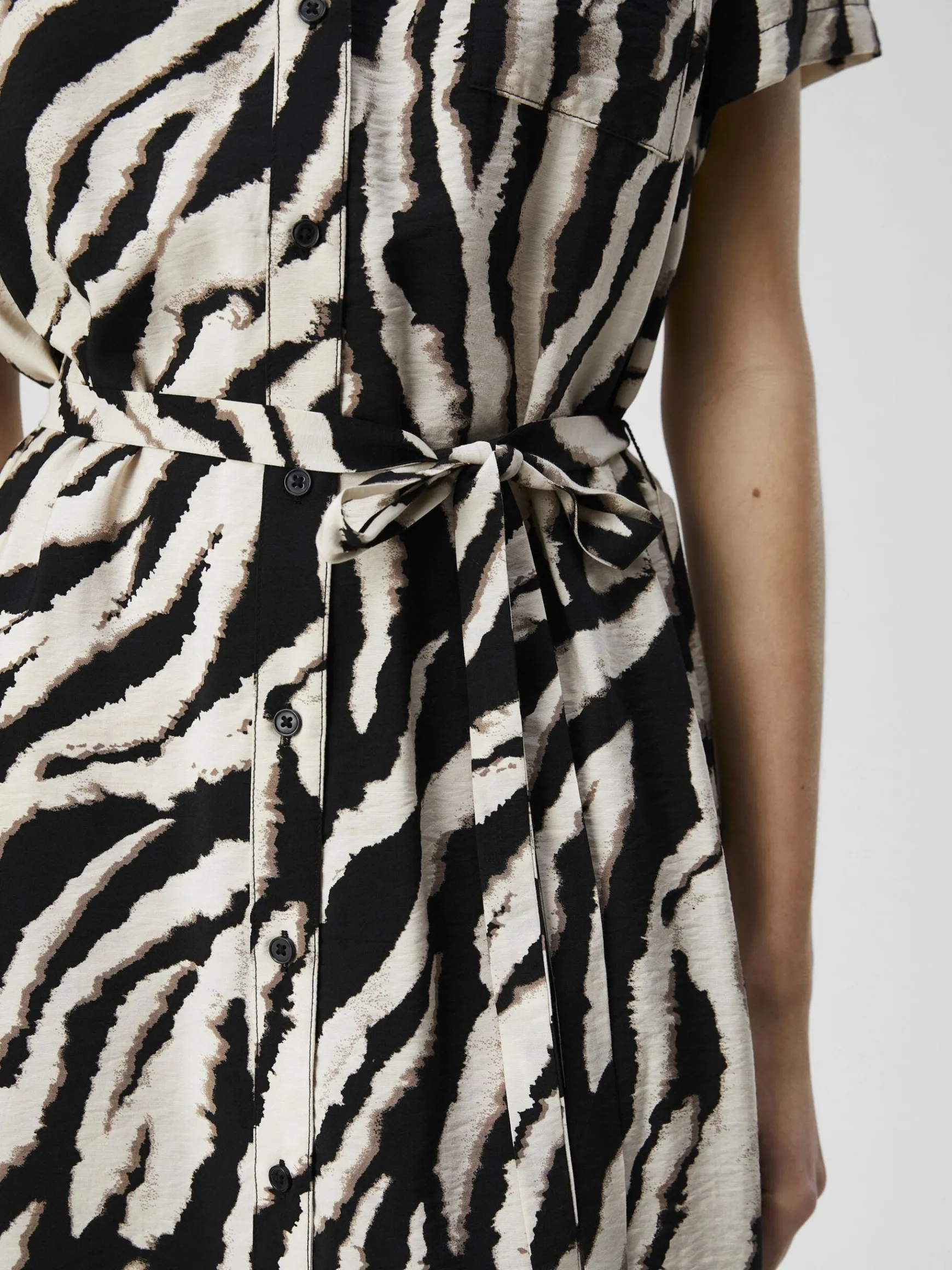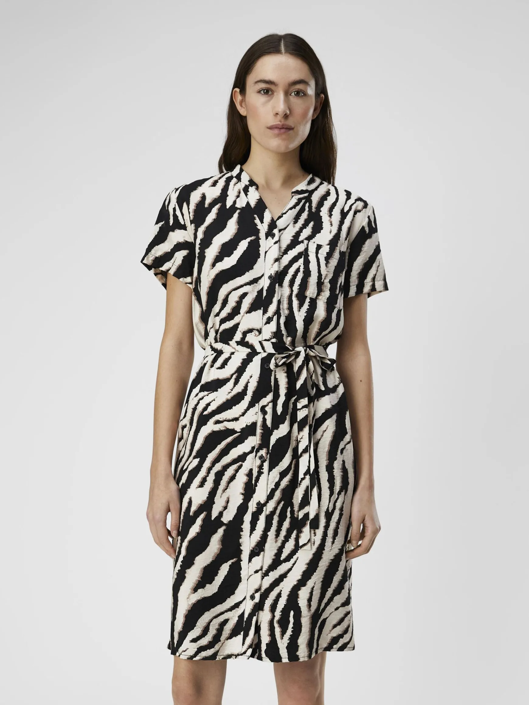 -Printet mini-skjortekjole-V-udskæring med båndet krave-Knappet foran-Bindebælte i taljen-Korte ærmer-Regular fit-Lavet med mere ansvarlige materialer-Modellen er iført størrelse 36