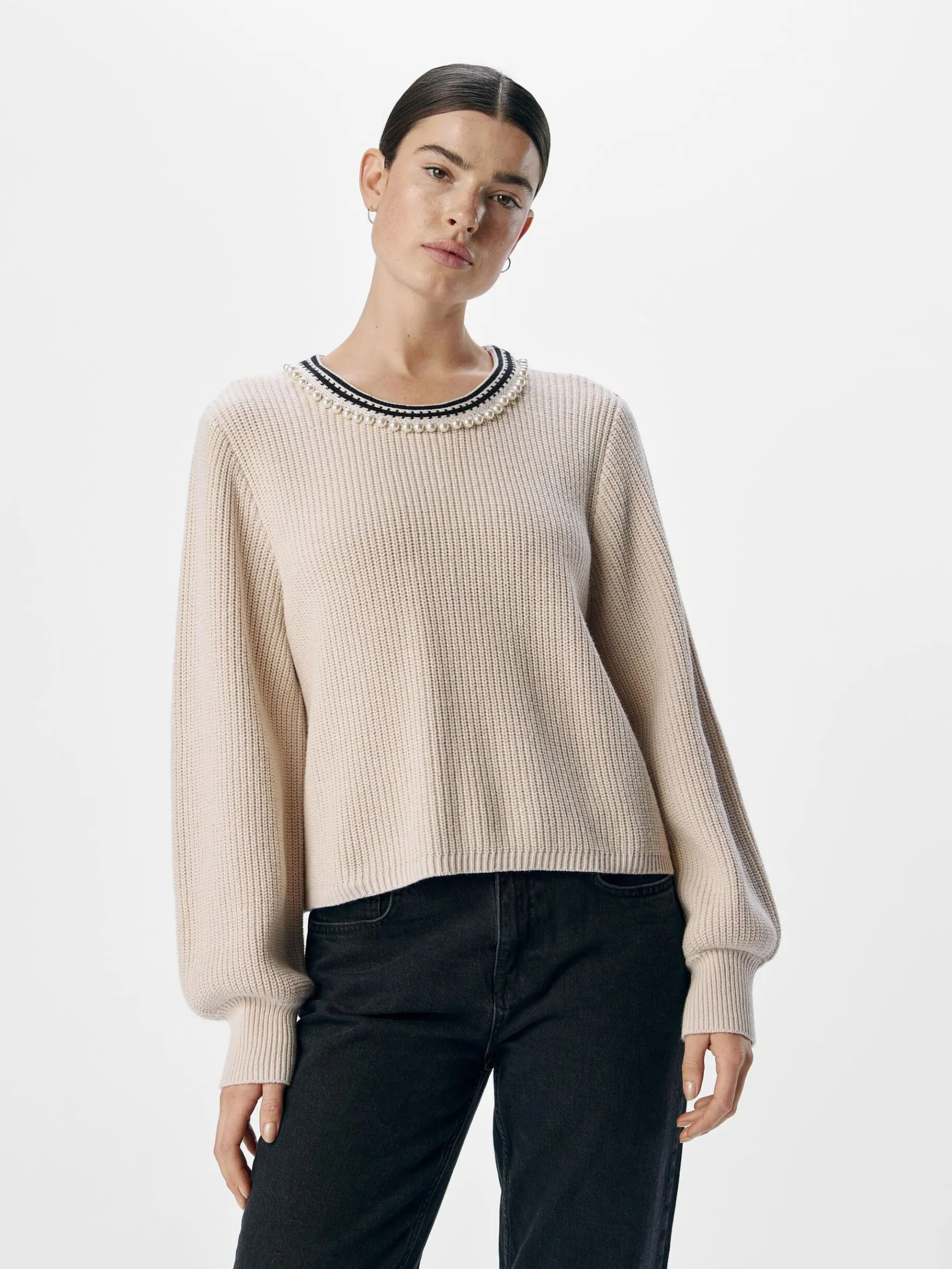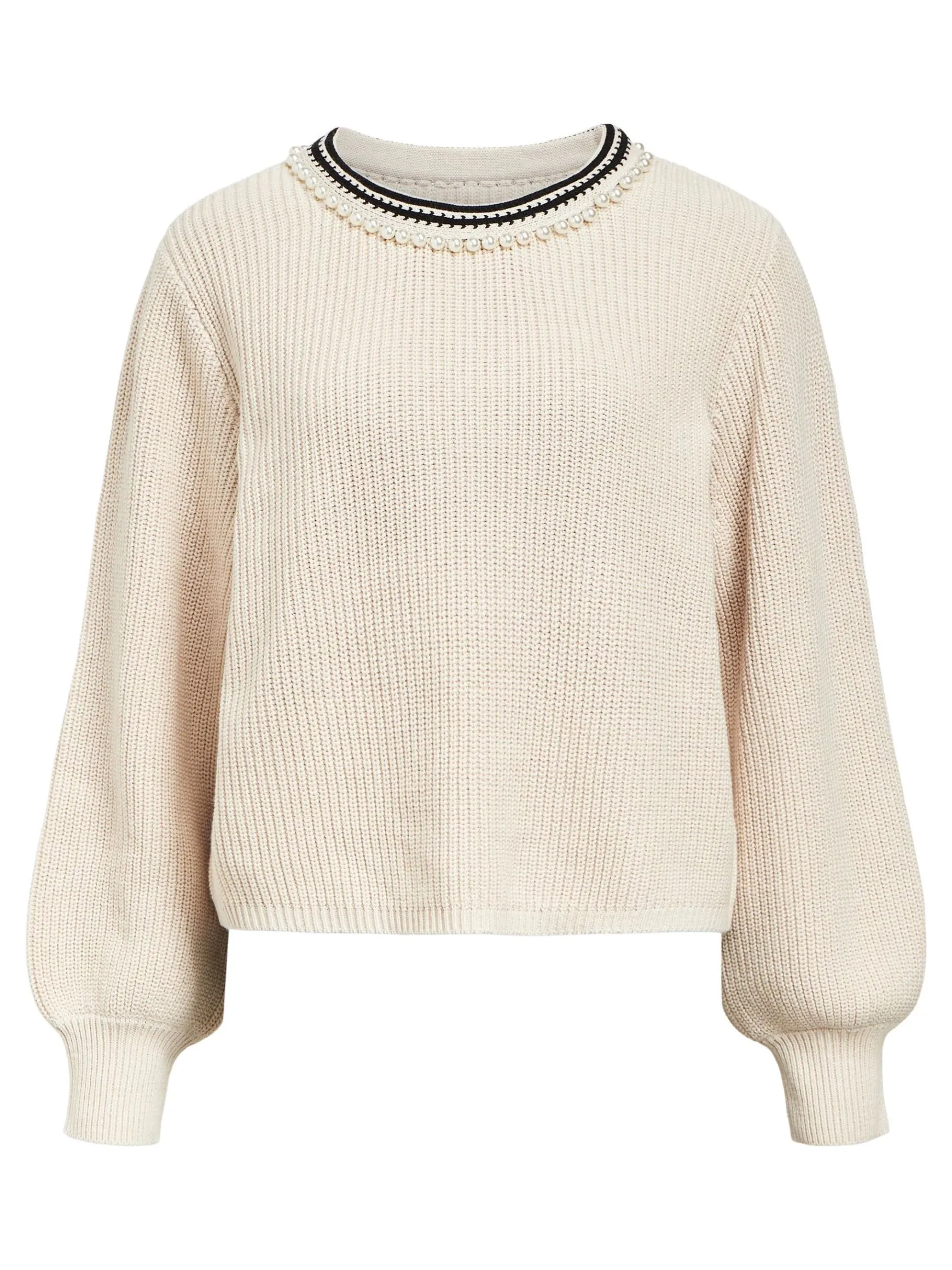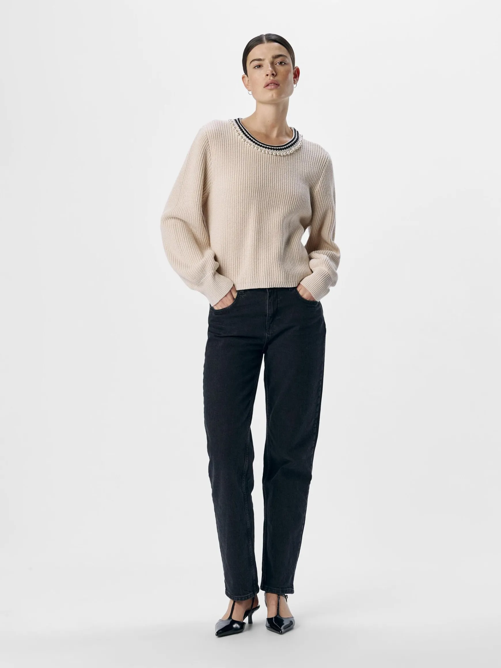 – Ribstrikket trøje- Rund hals med kontraststribe- Sænkede skuldre- Lange voluminøse ærmer med tætsiddende ærmekanter- Løs pasform