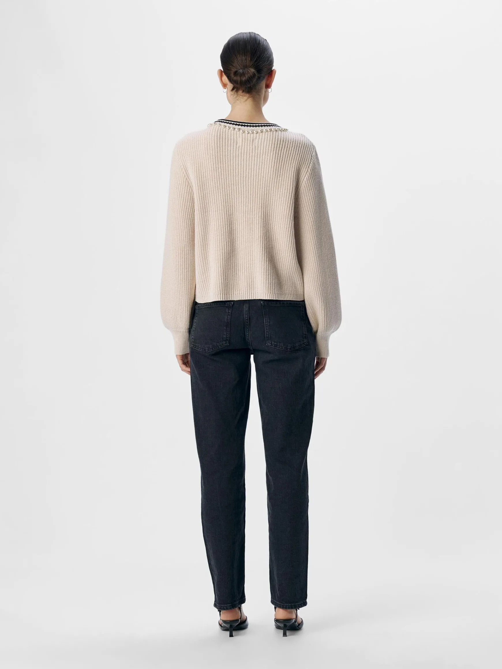 – Ribstrikket trøje- Rund hals med kontraststribe- Sænkede skuldre- Lange voluminøse ærmer med tætsiddende ærmekan…