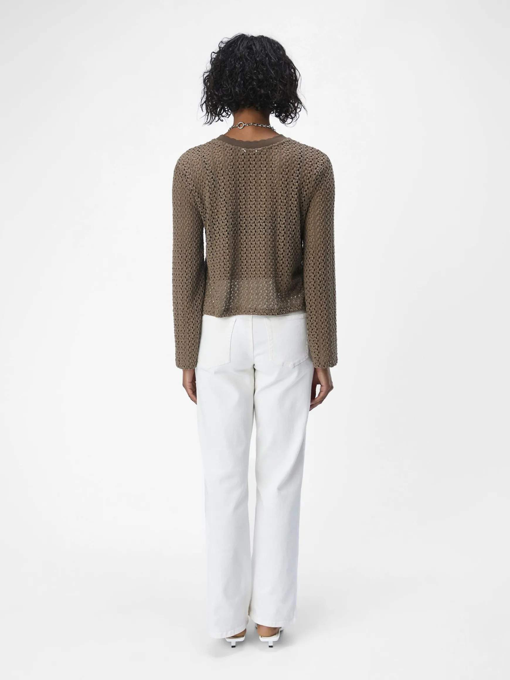 – Langærmet strikket cardigan- Rund hals med flæsekant- Knapper foran- Åbenvævet design- Almindelig pasformStylenavn…