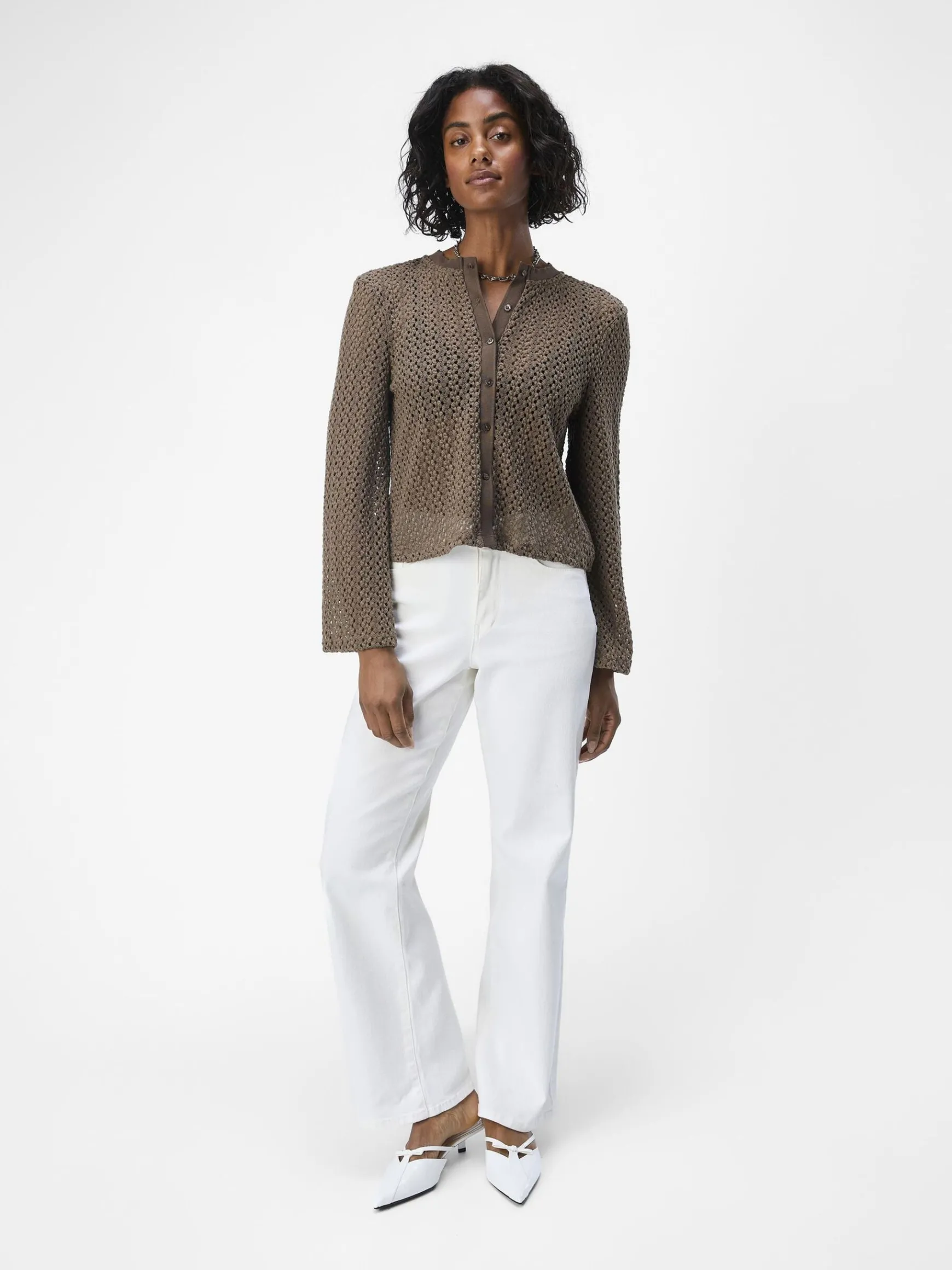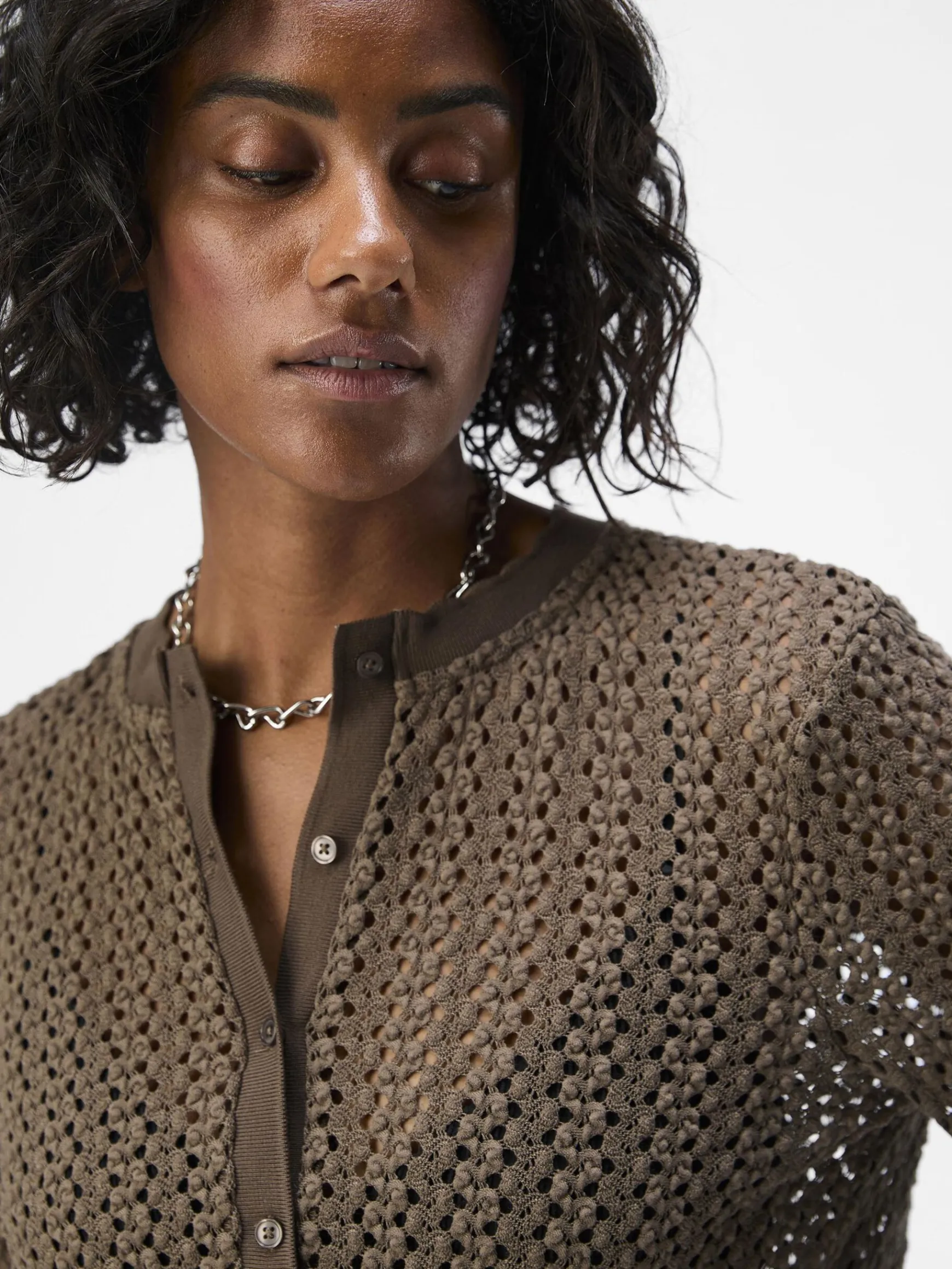 – Langærmet strikket cardigan- Rund hals med flæsekant- Knapper foran- Åbenvævet design- Almindelig pasform