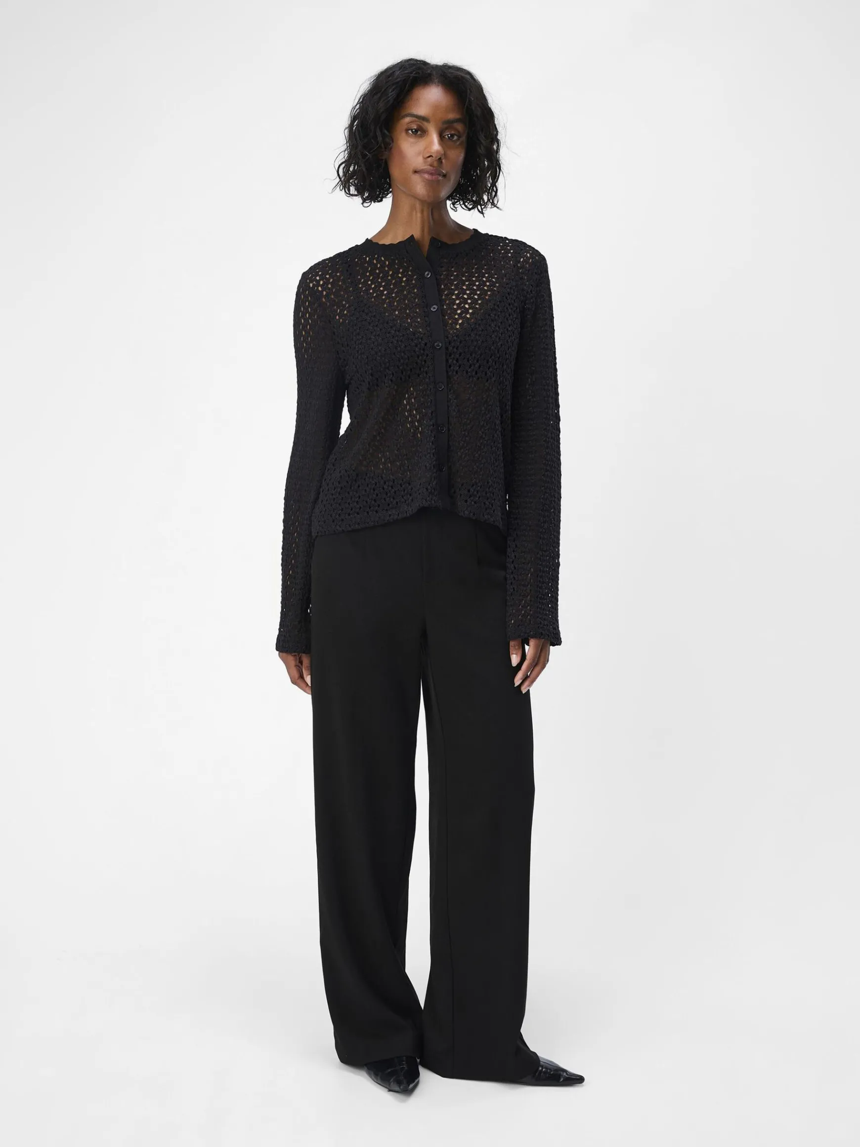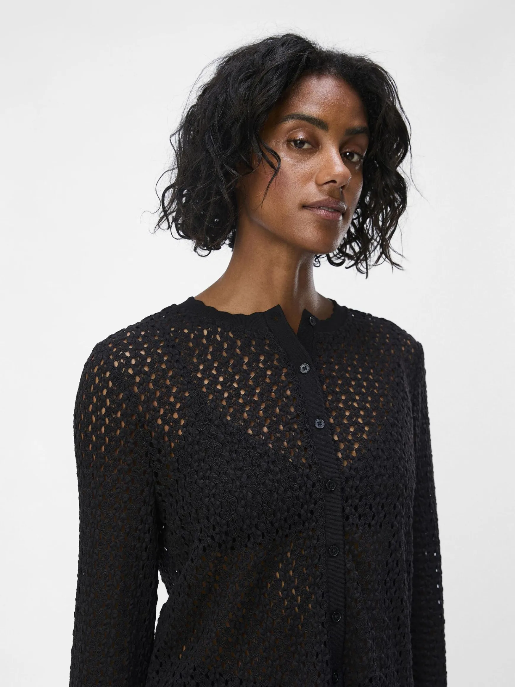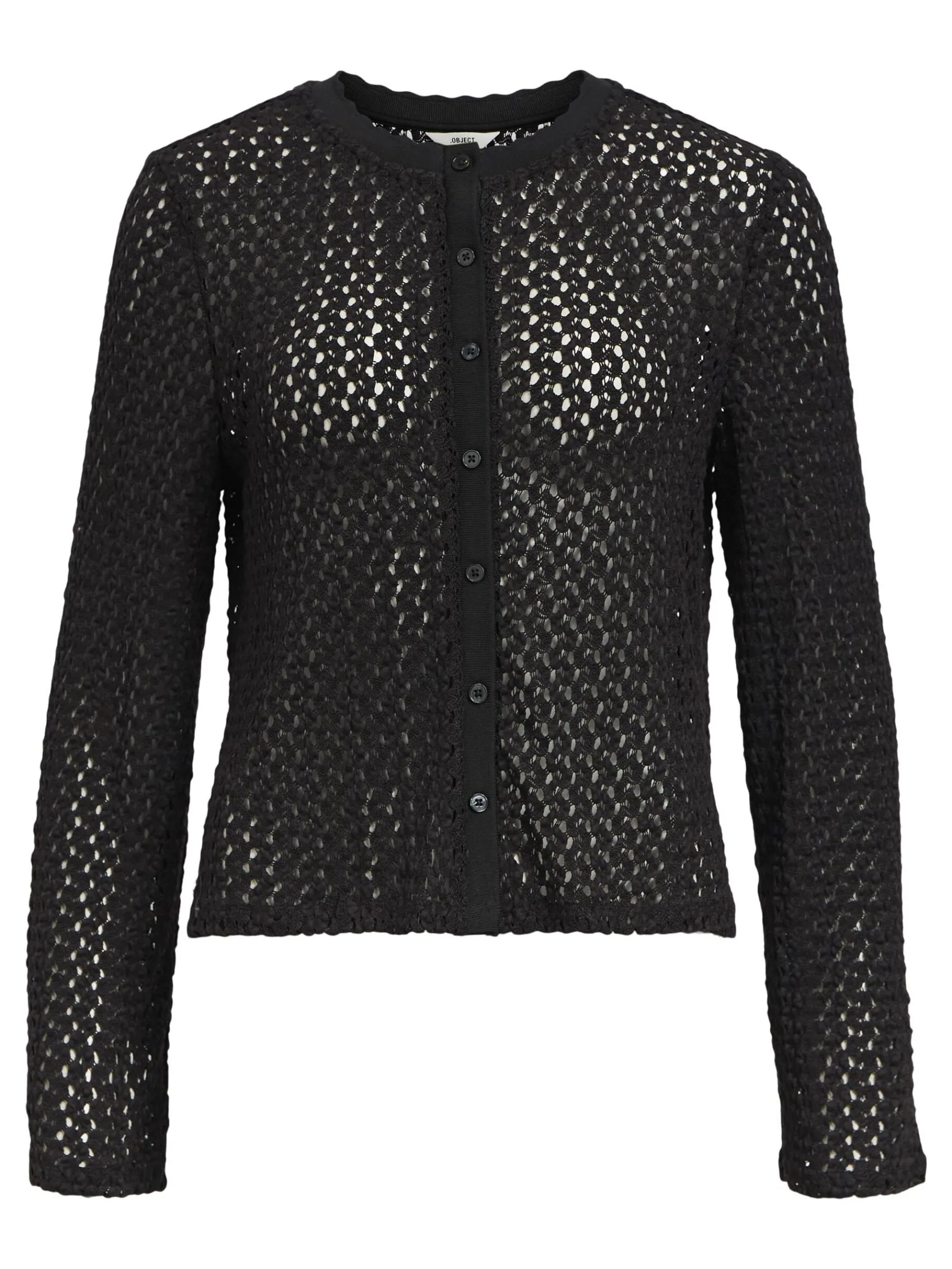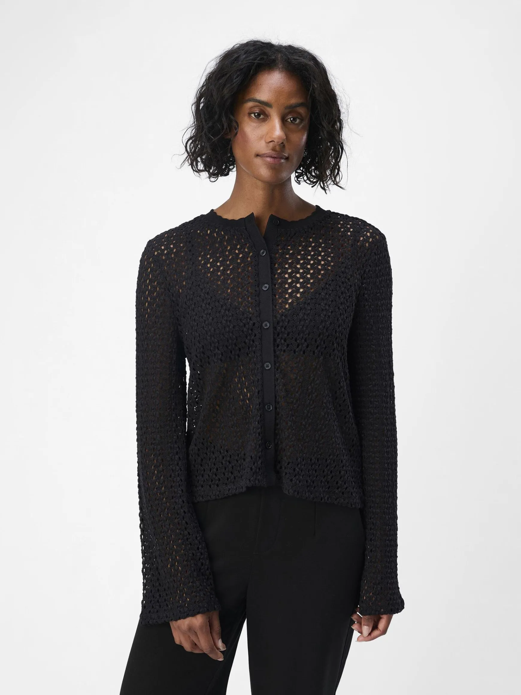 – Langærmet strikket cardigan- Rund hals med flæsekant- Knapper foran- Åbenvævet design- Almindelig pasform