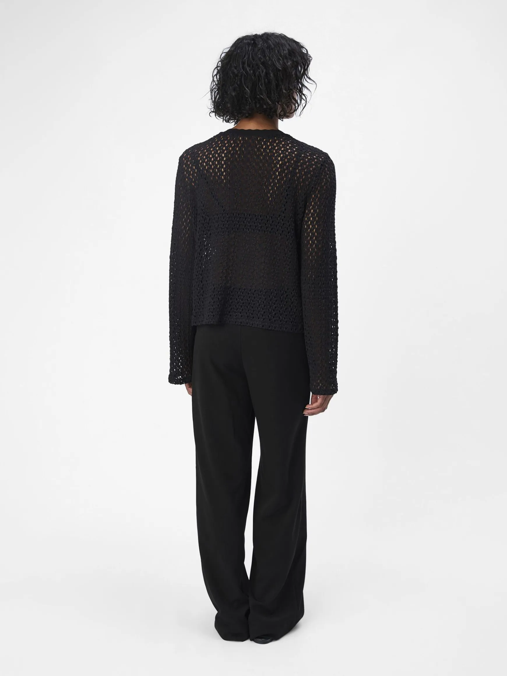 – Langærmet strikket cardigan- Rund hals med flæsekant- Knapper foran- Åbenvævet design- Almindelig pasformStylenavn…