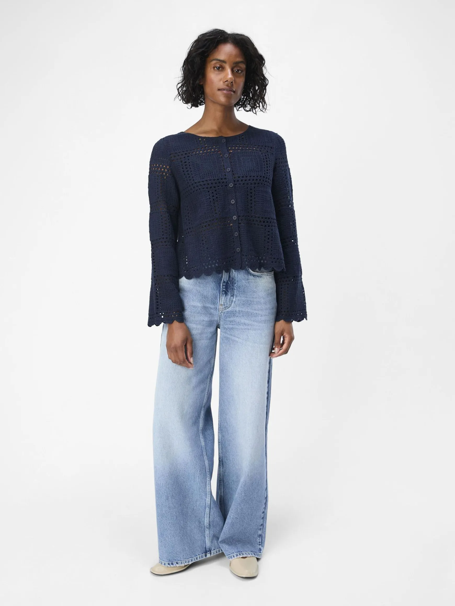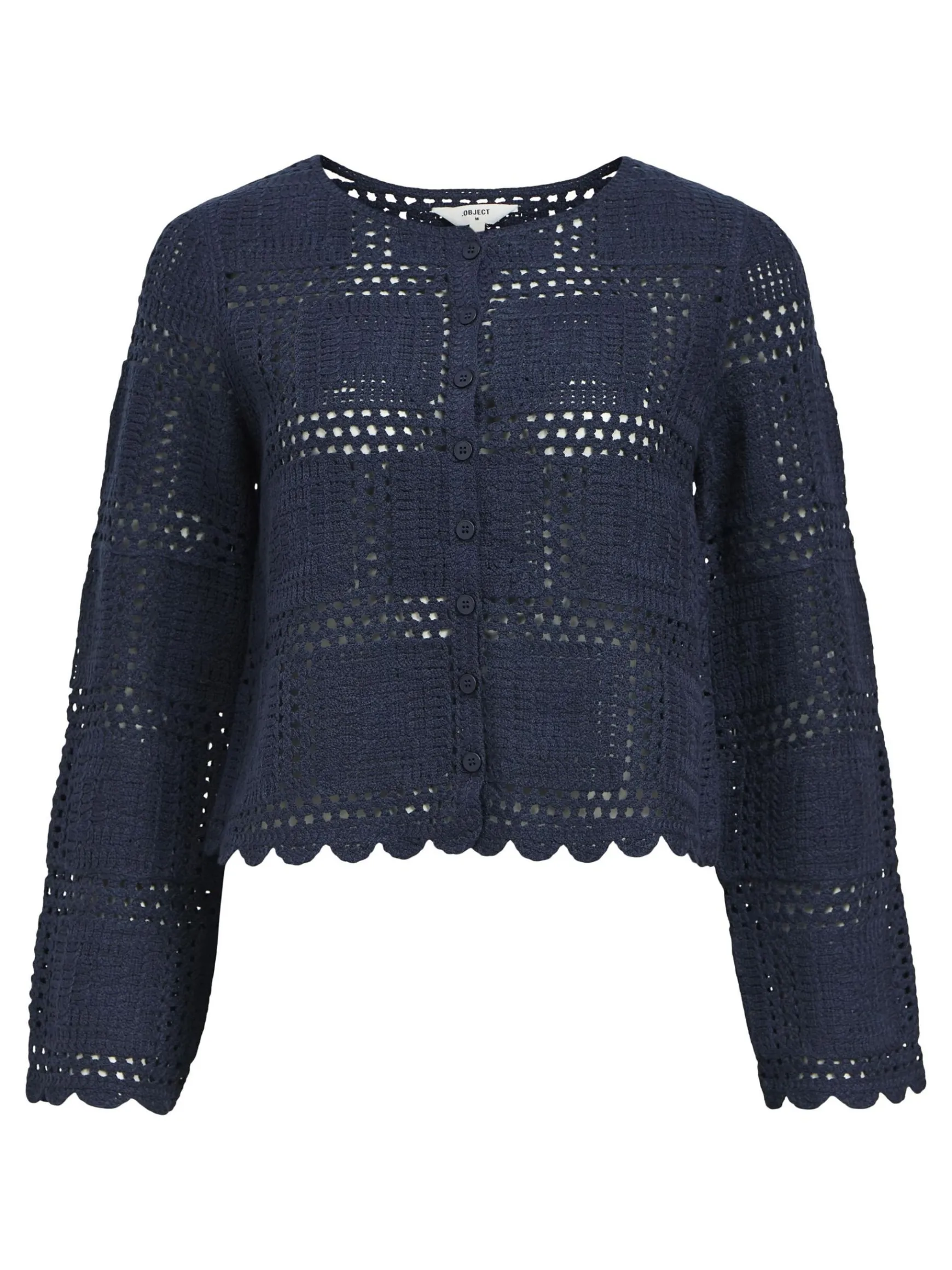 – Cardigan i åbenvævet strik- Bølgekant- Lange ærmer- Knapper foran- Almindelig pasformStylenavn: OBJORELLA