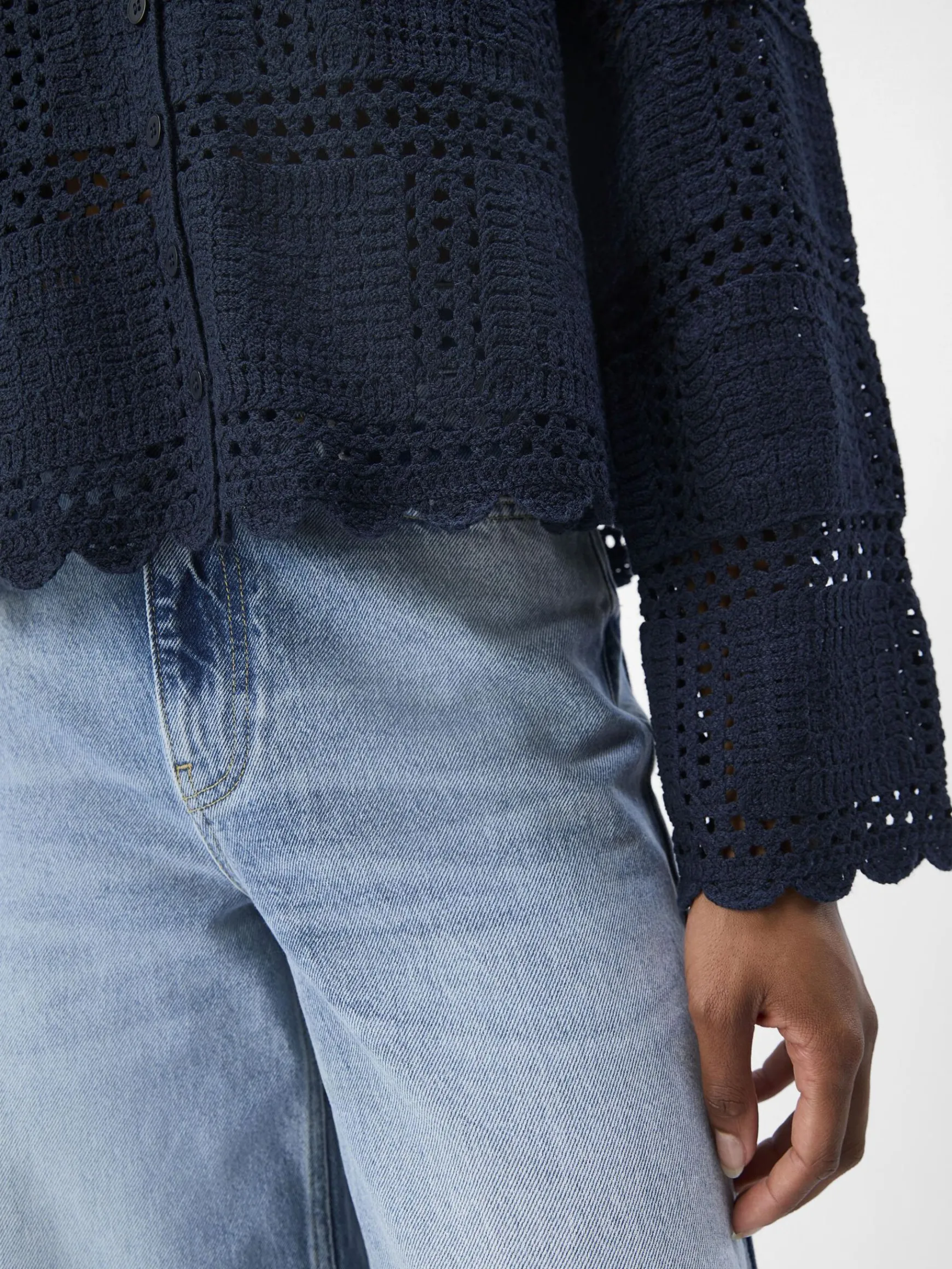 – Cardigan i åbenvævet strik- Bølgekant- Lange ærmer- Knapper foran- Almindelig pasform