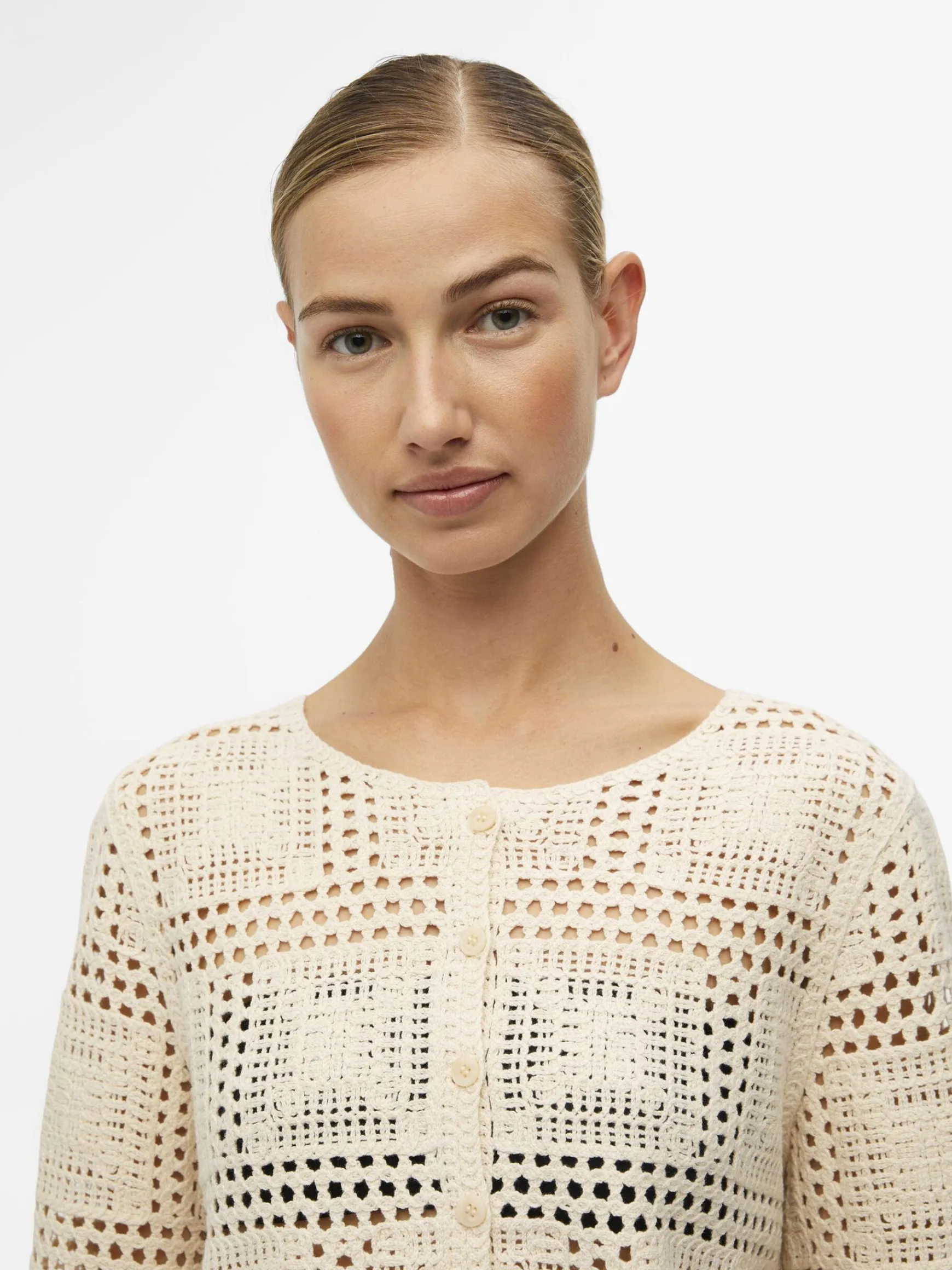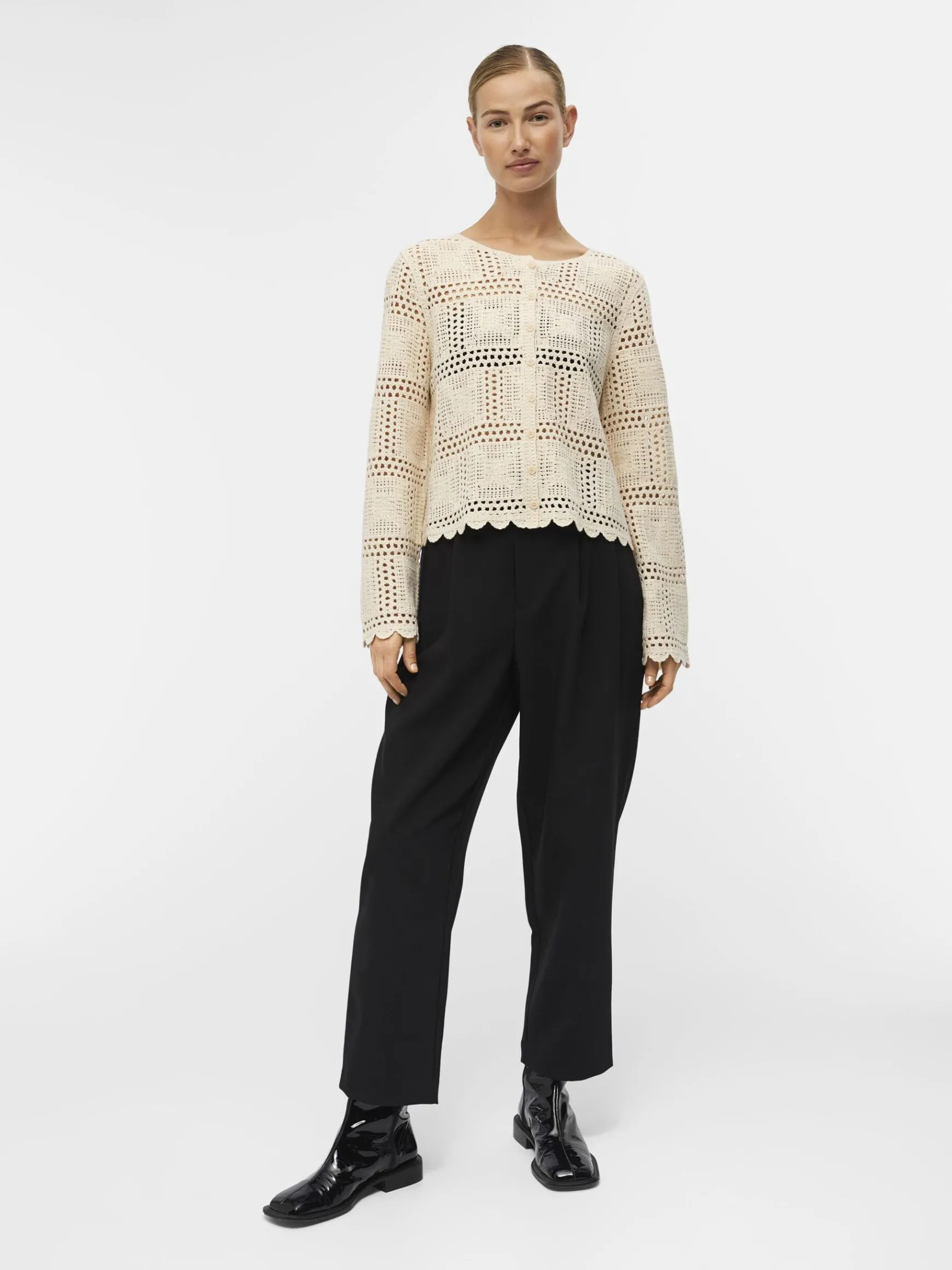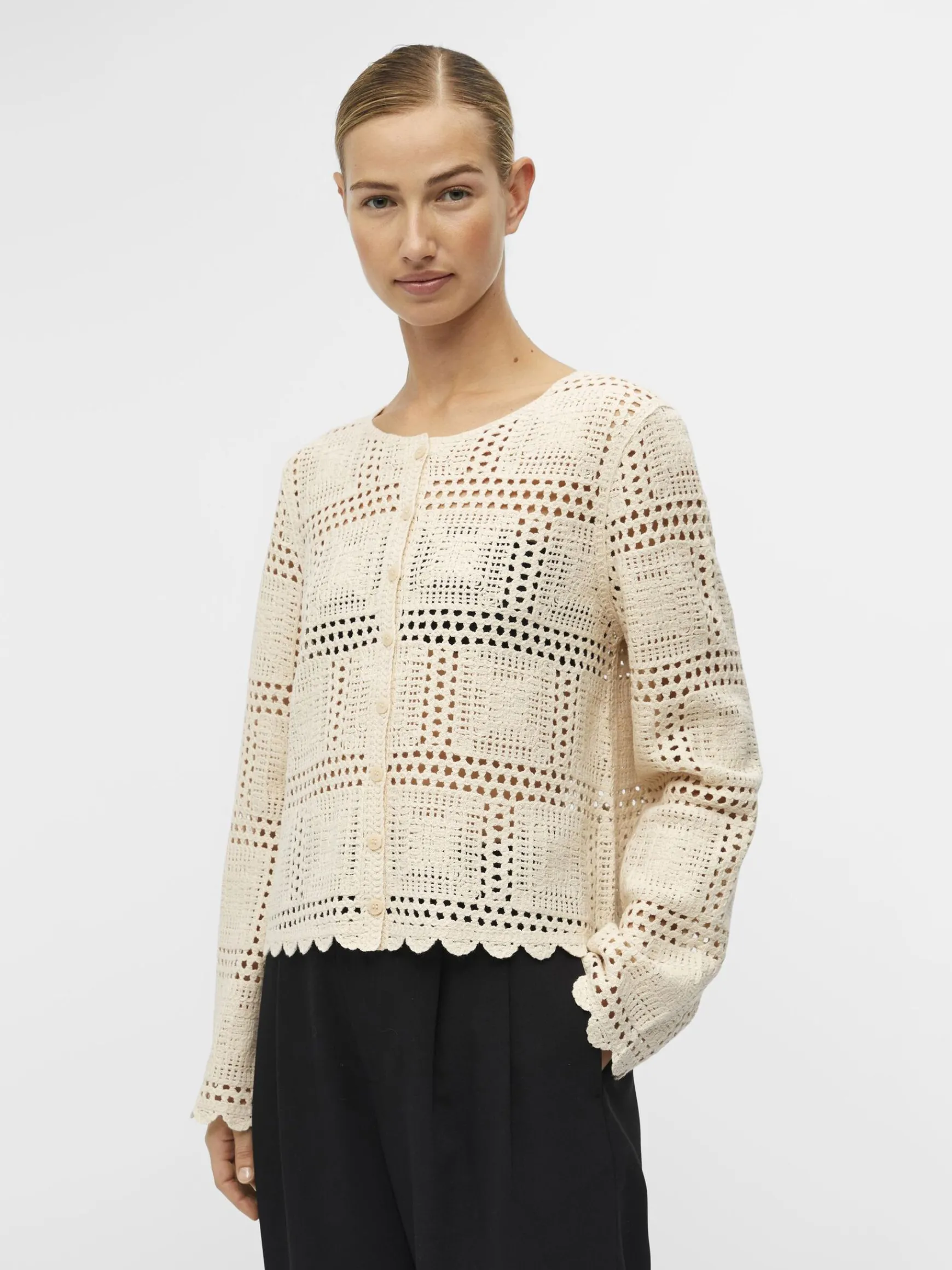 – Cardigan i åbenvævet strik- Bølgekant- Lange ærmer- Knapper foran- Almindelig pasformStylenavn: OBJORELLA