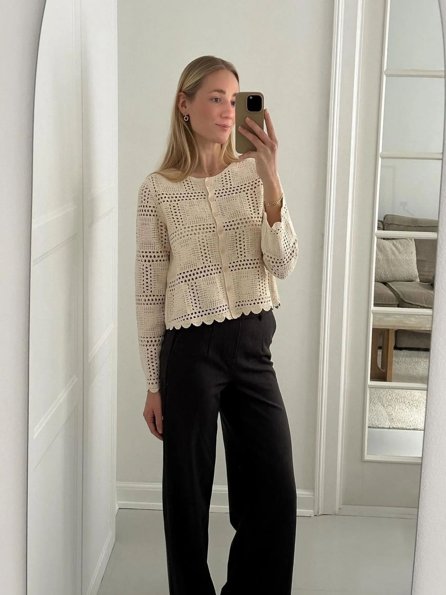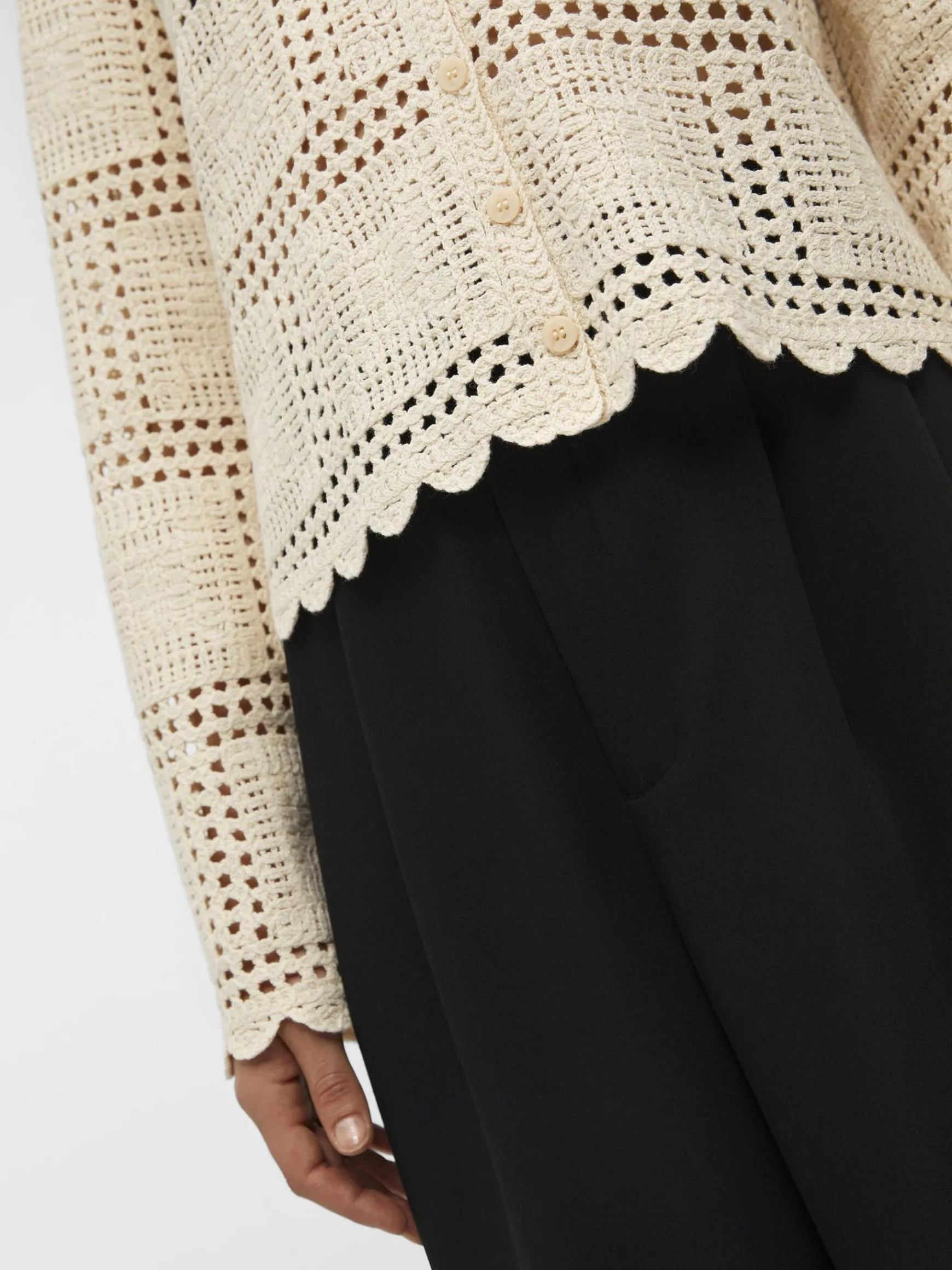 – Cardigan i åbenvævet strik- Bølgekant- Lange ærmer- Knapper foran- Almindelig pasform