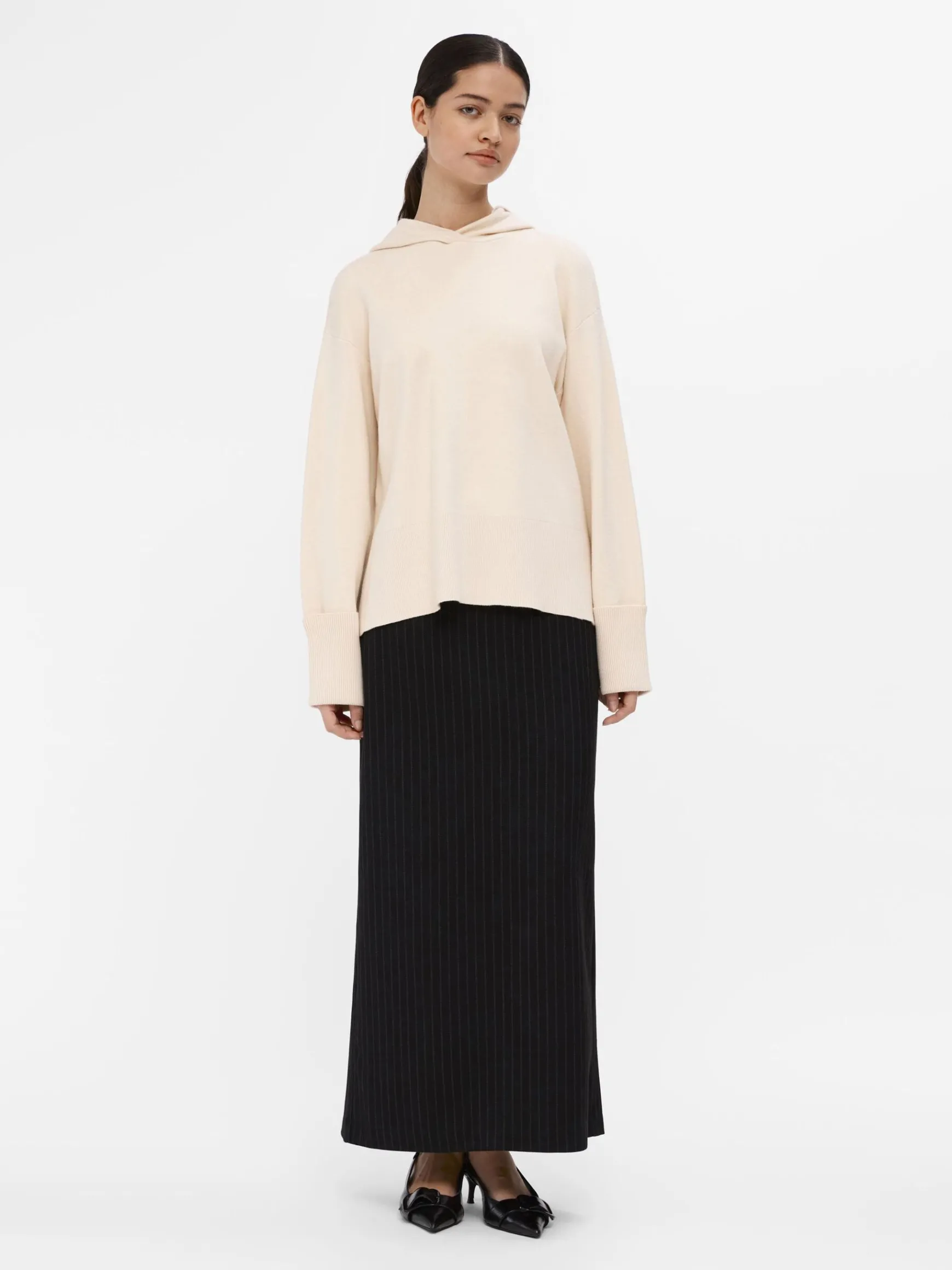 – Langærmet strikket hoodie- Stor fastsyet hætte- Sænkede skuldre- Store ribbede opfoldede ærmekanter- Ribbede kante…
