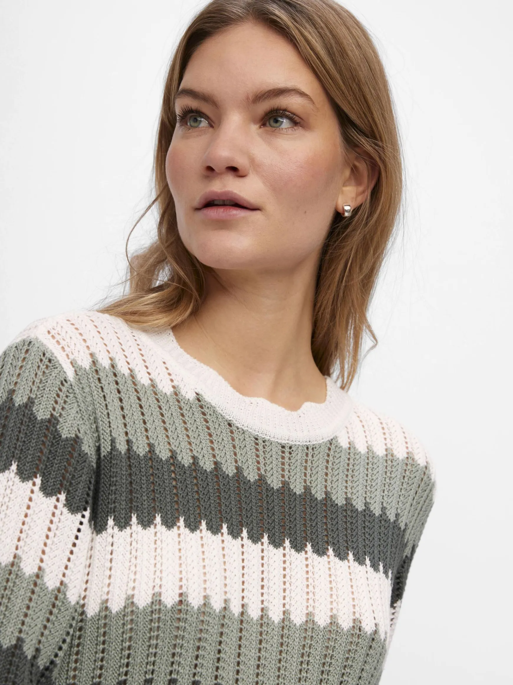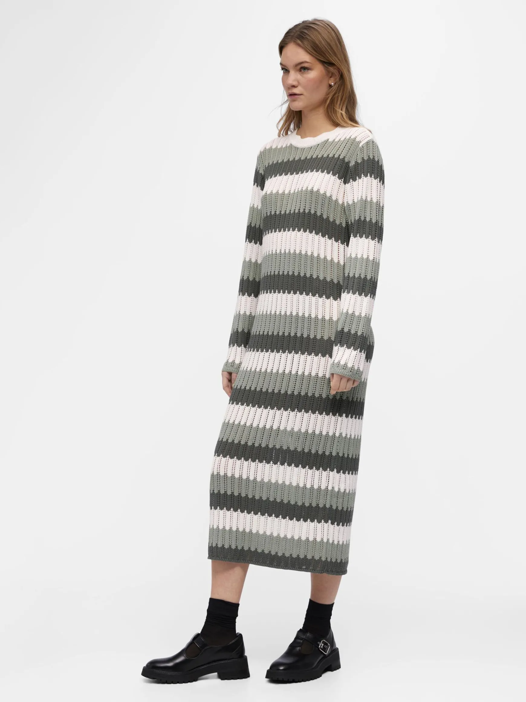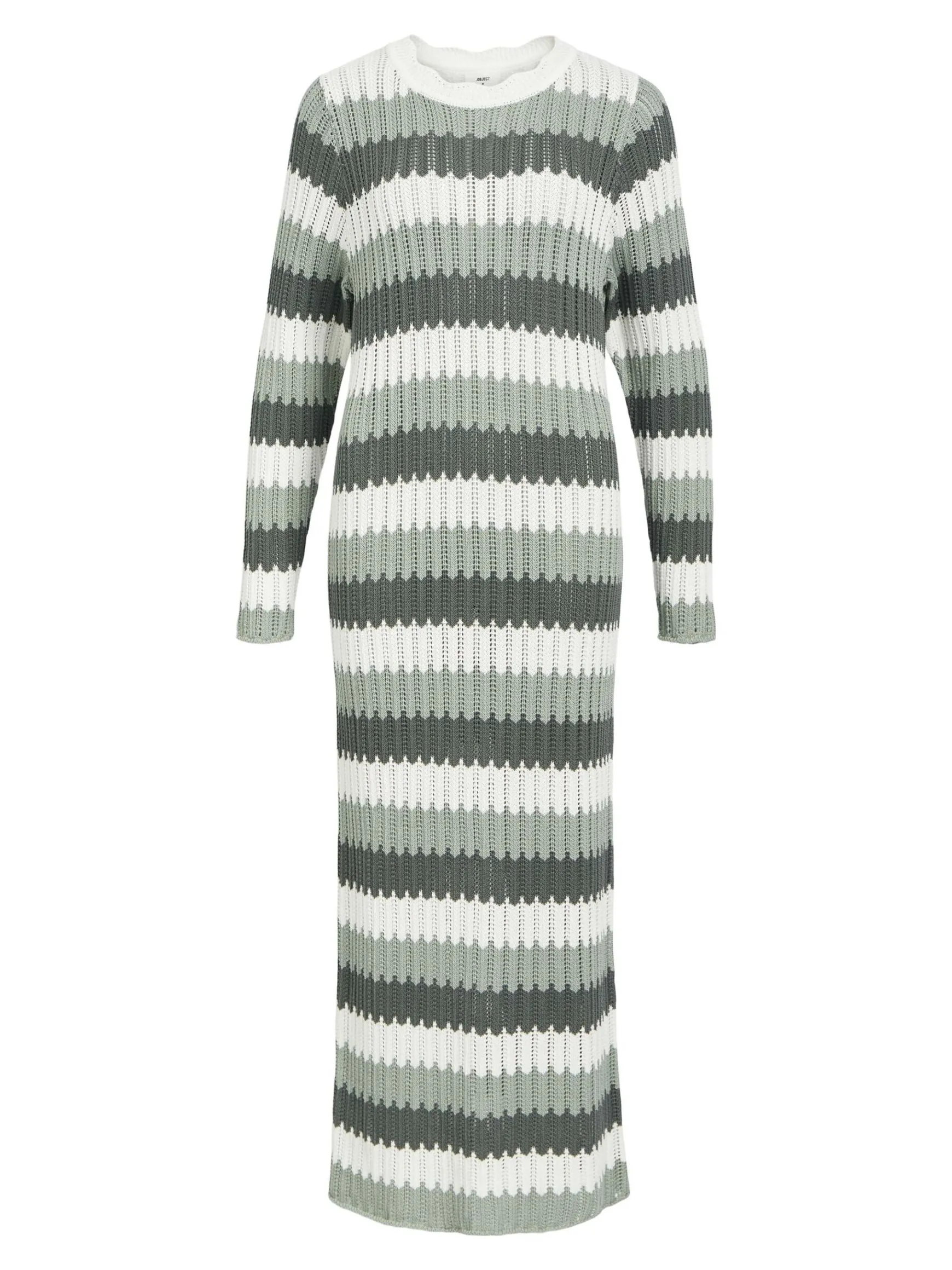 – Stribet strikket maxikjole- Rund hals med bølgekant- Lange ærmer- Slim fit