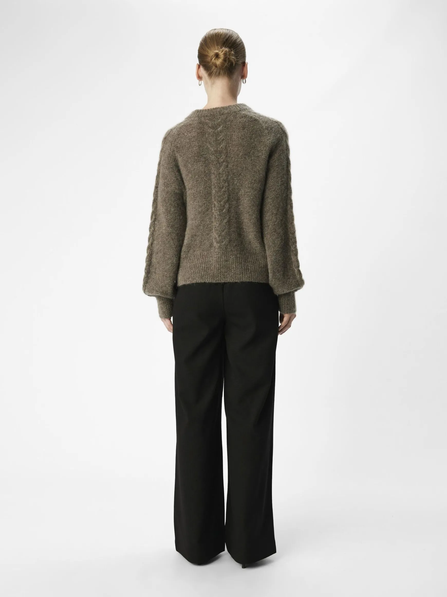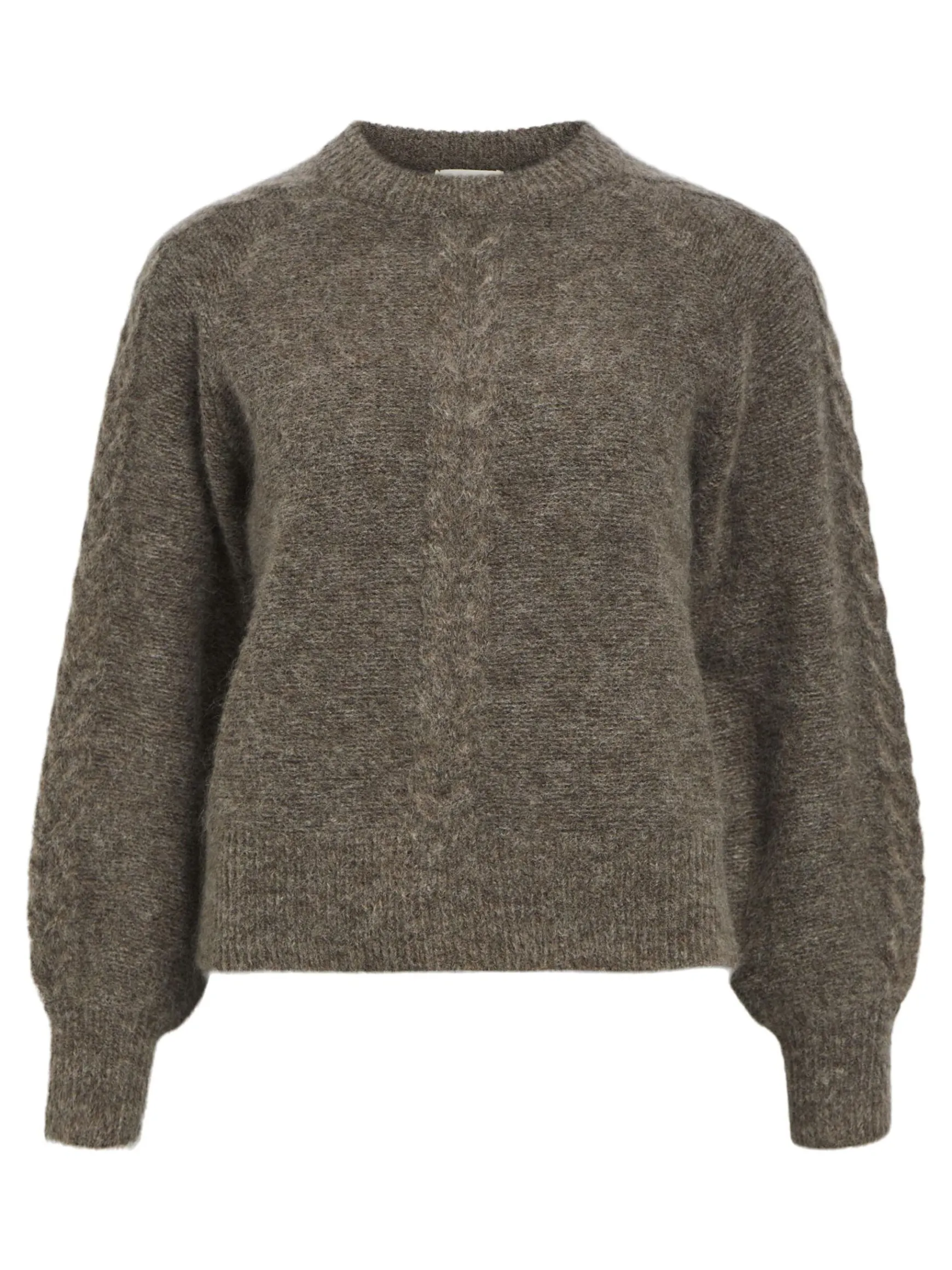 – Kabelstrikket trøje- Uld- og mohairblanding- Rund hals- Raglan-skuldre- Lange voluminøse ærmer- Tætsiddende ærmek…
