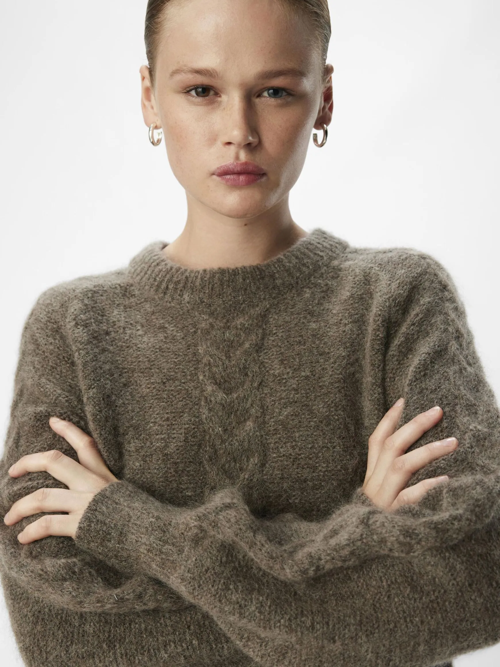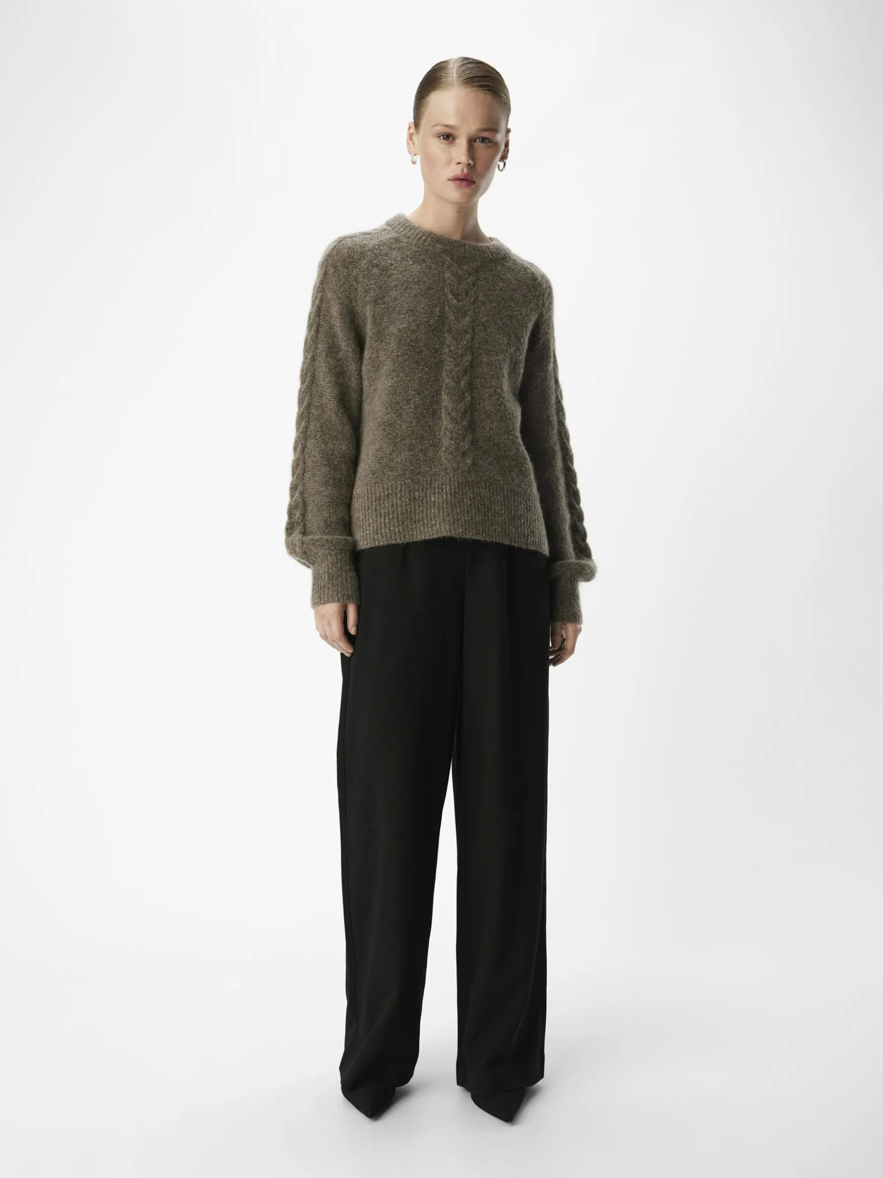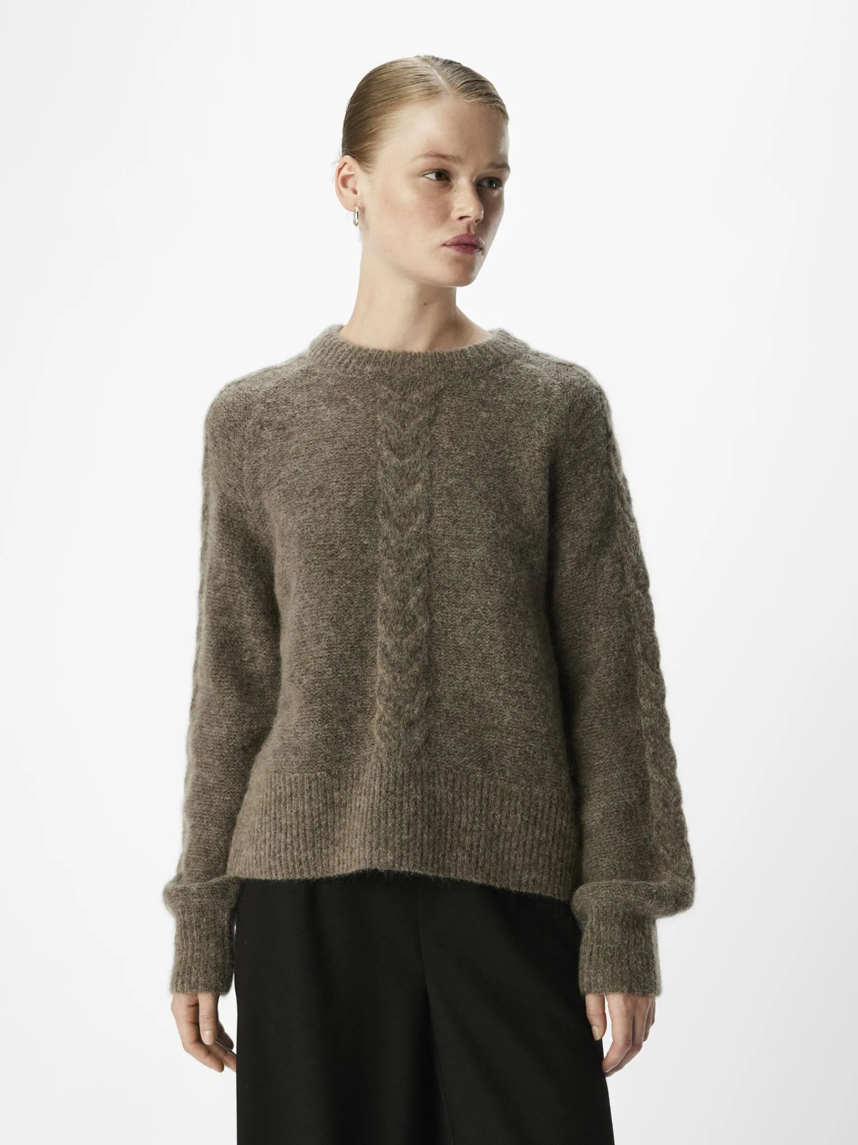 – Kabelstrikket trøje- Uld- og mohairblanding- Rund hals- Raglan-skuldre- Lange voluminøse ærmer- Tætsiddende ærmekanter- Ribbede kanter- Regular fit