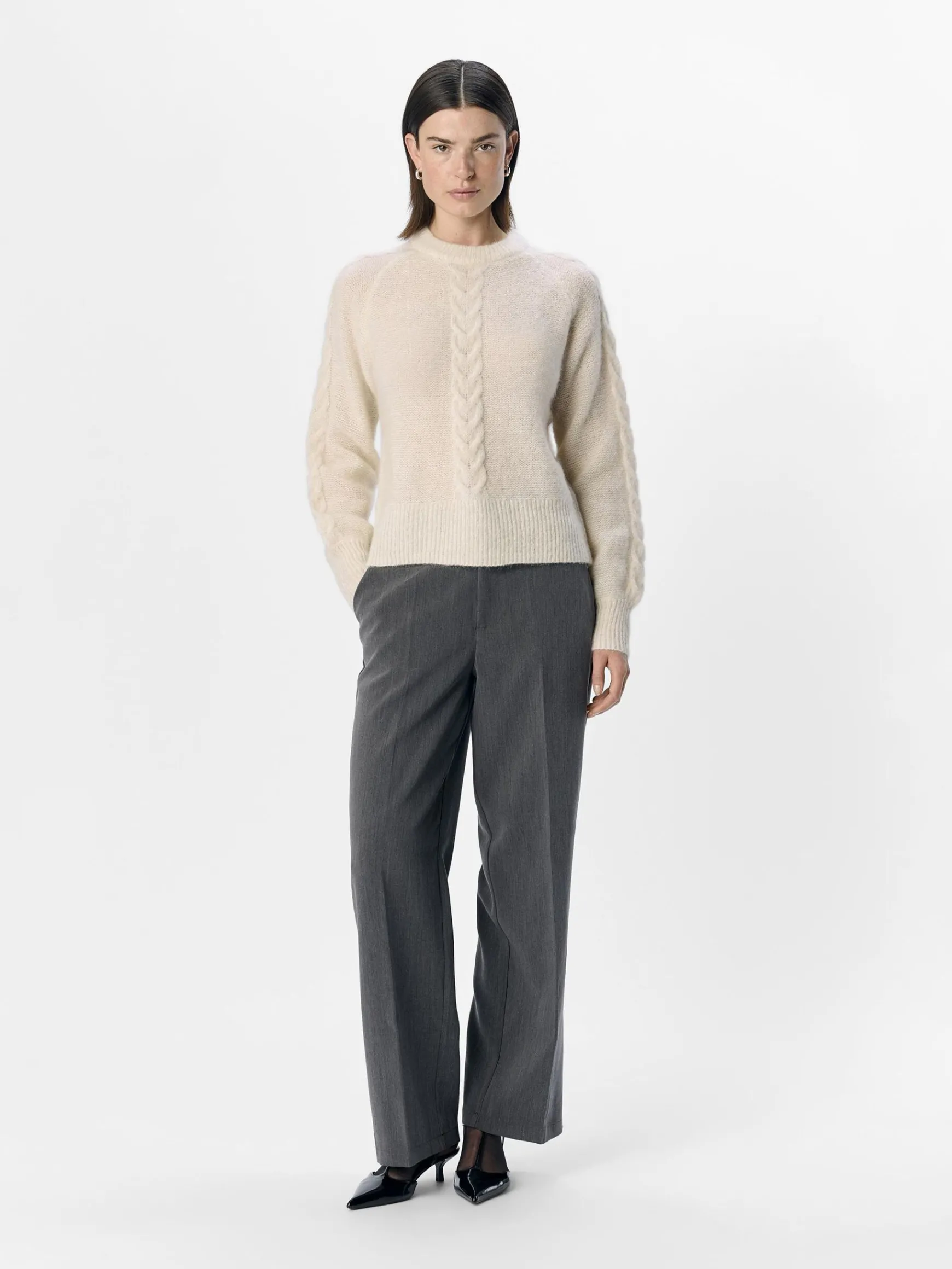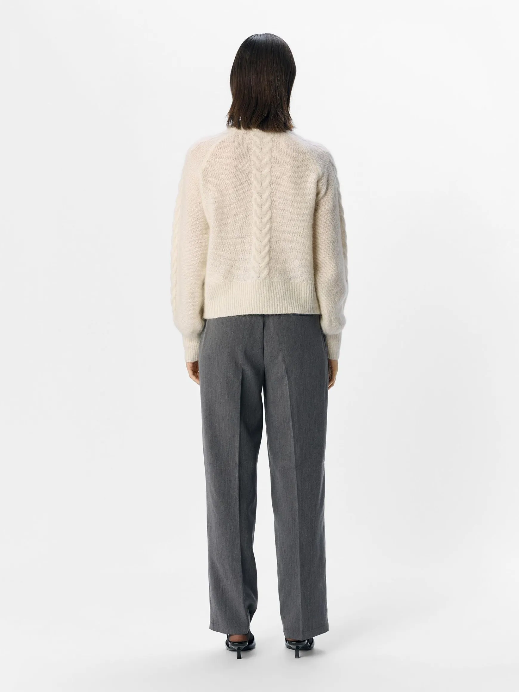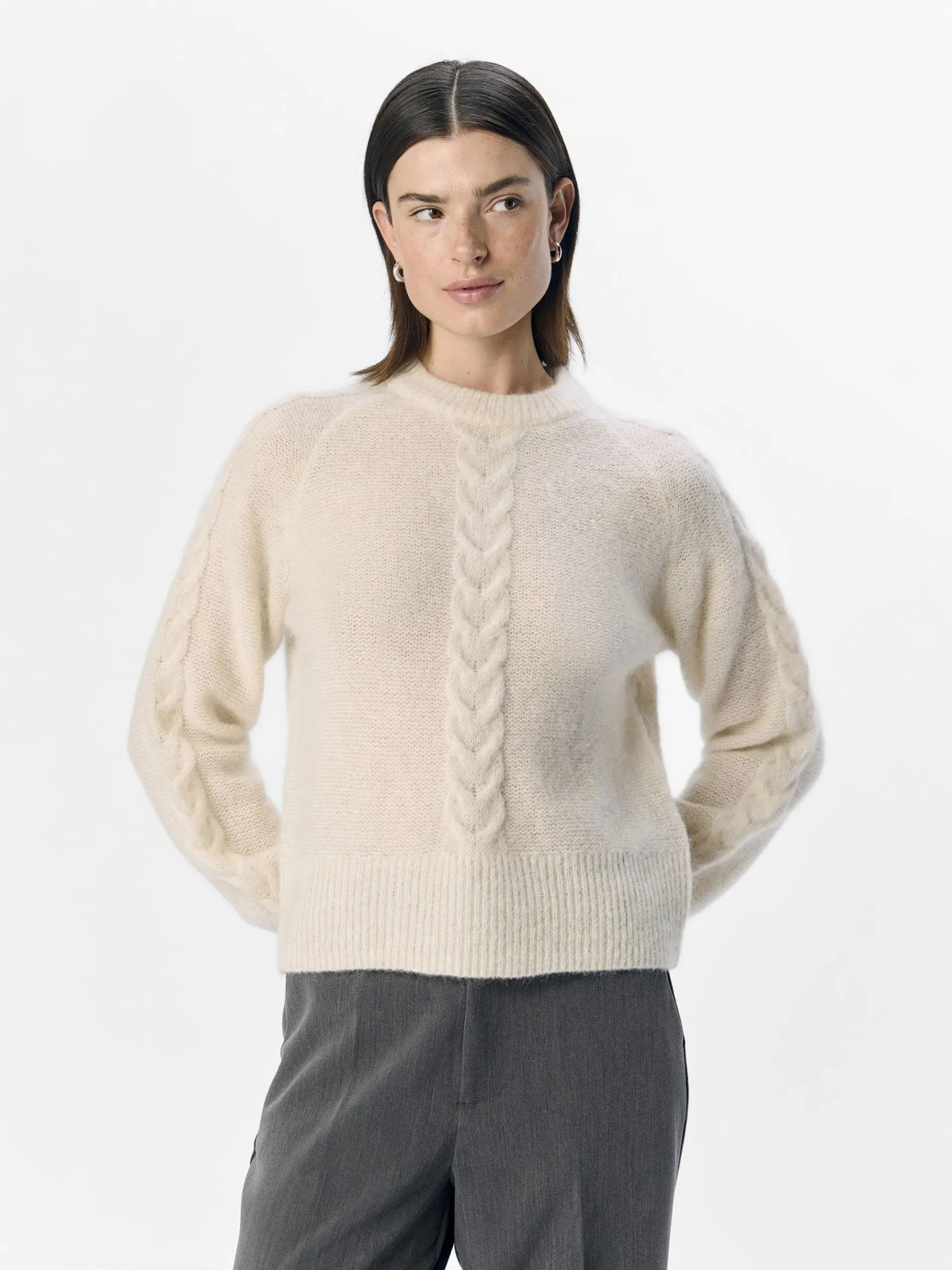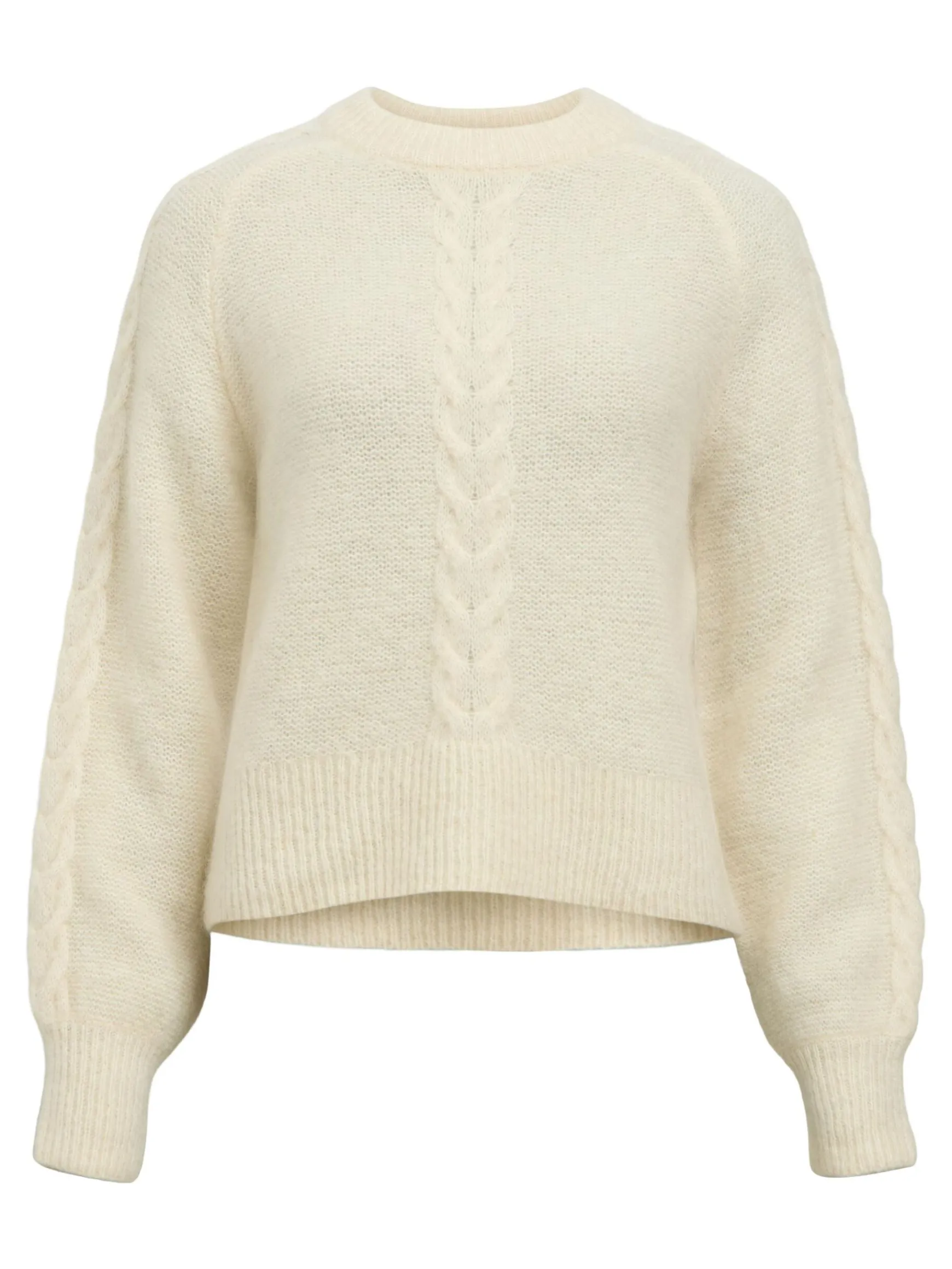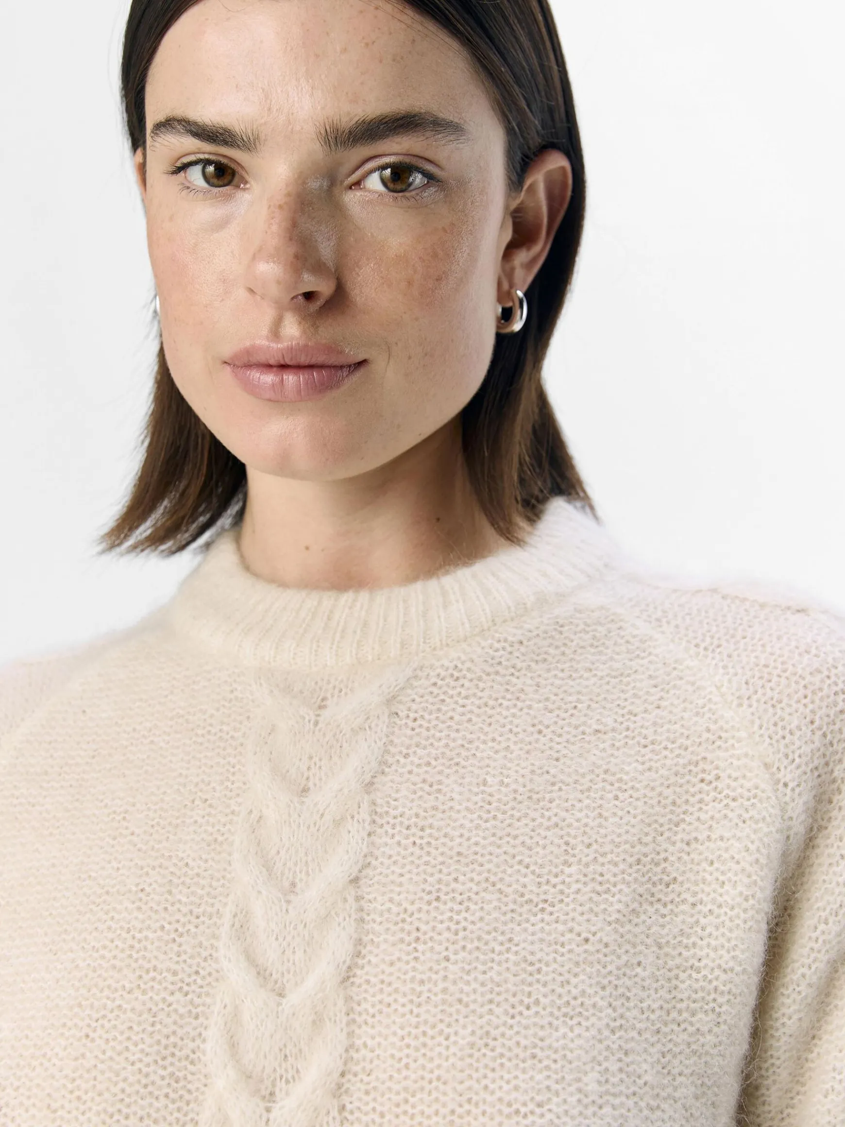– Kabelstrikket trøje- Uld- og mohairblanding- Rund hals- Raglan-skuldre- Lange voluminøse ærmer- Tætsiddende ærmek…