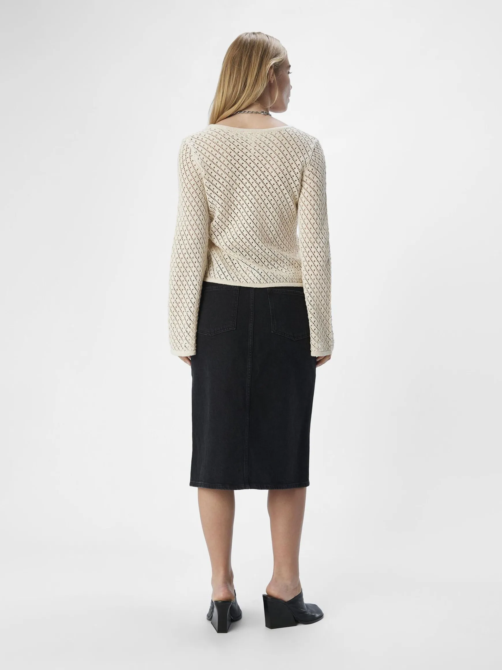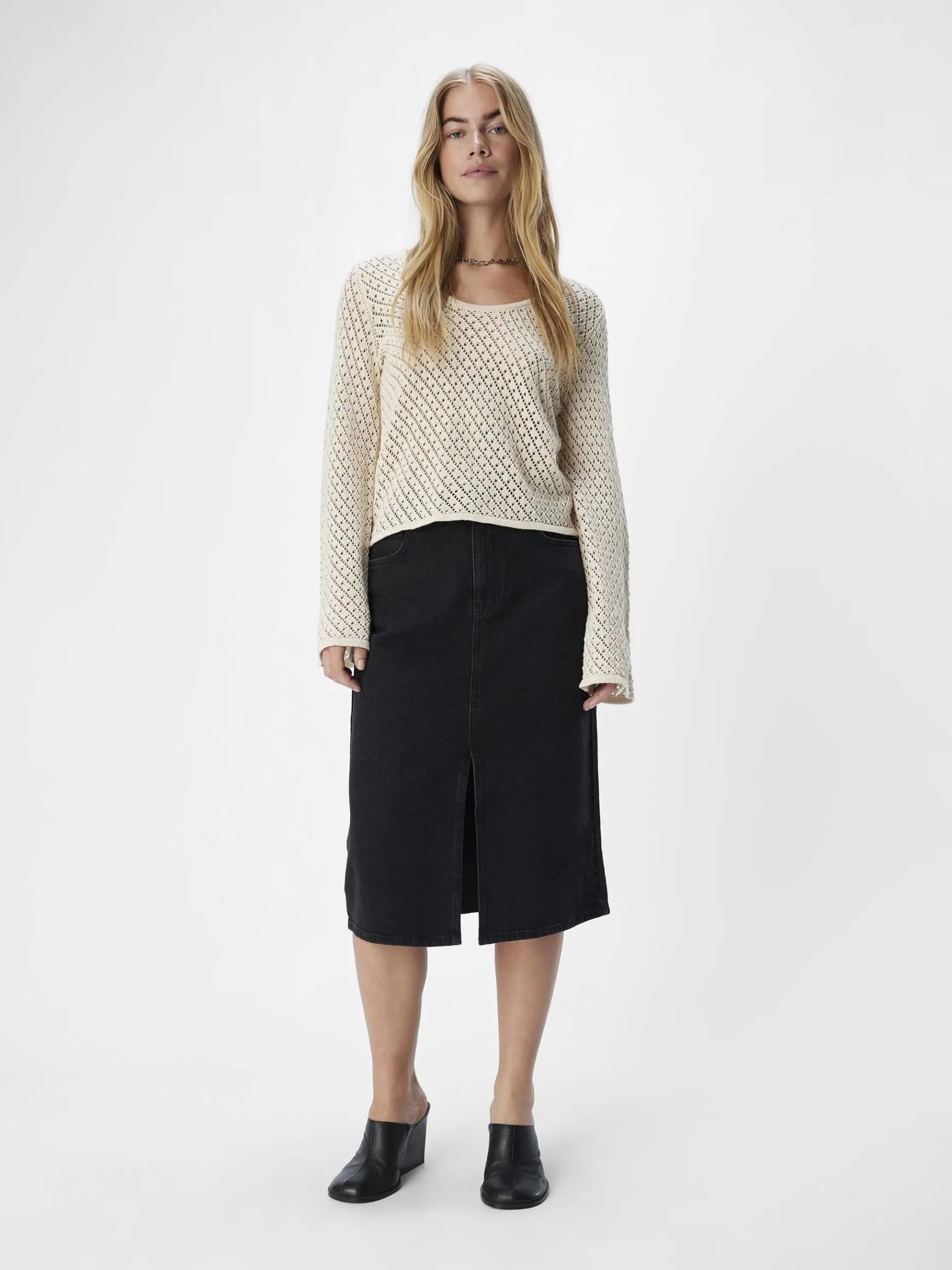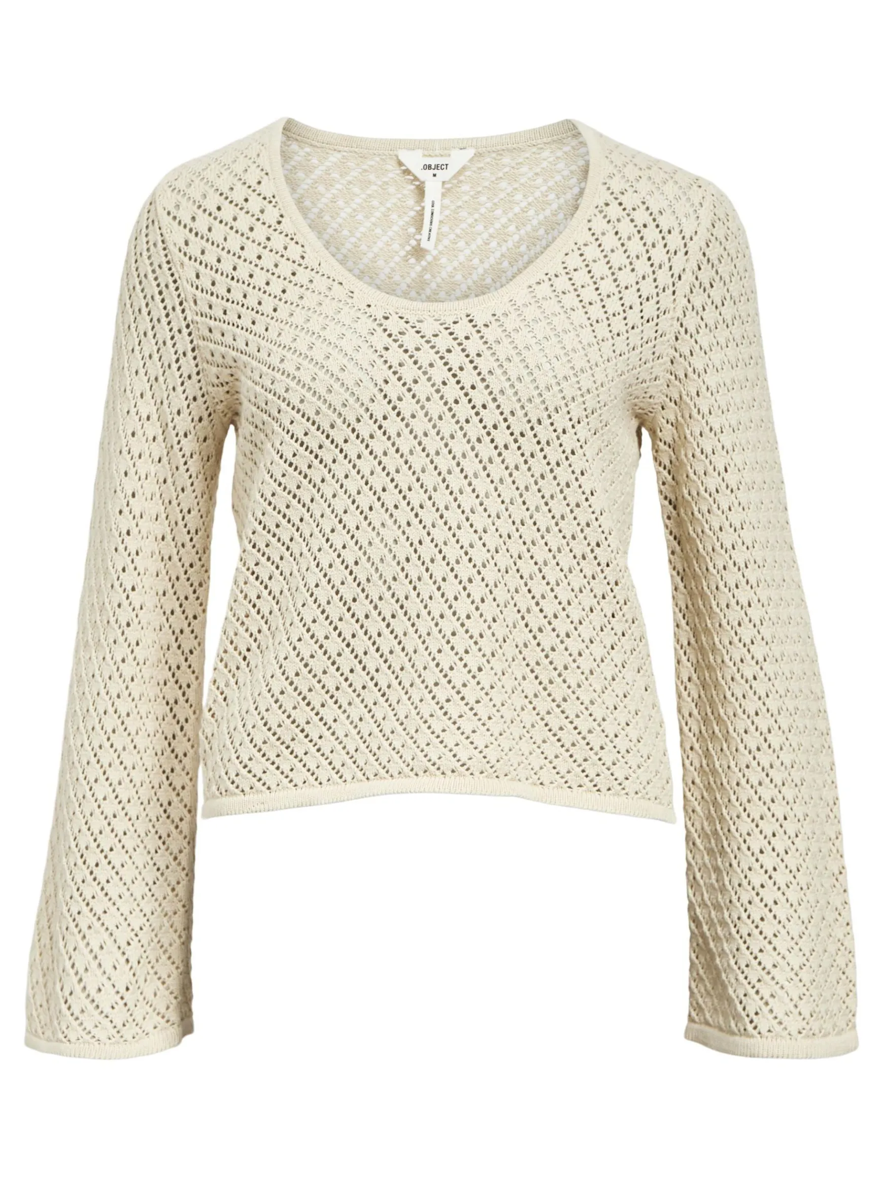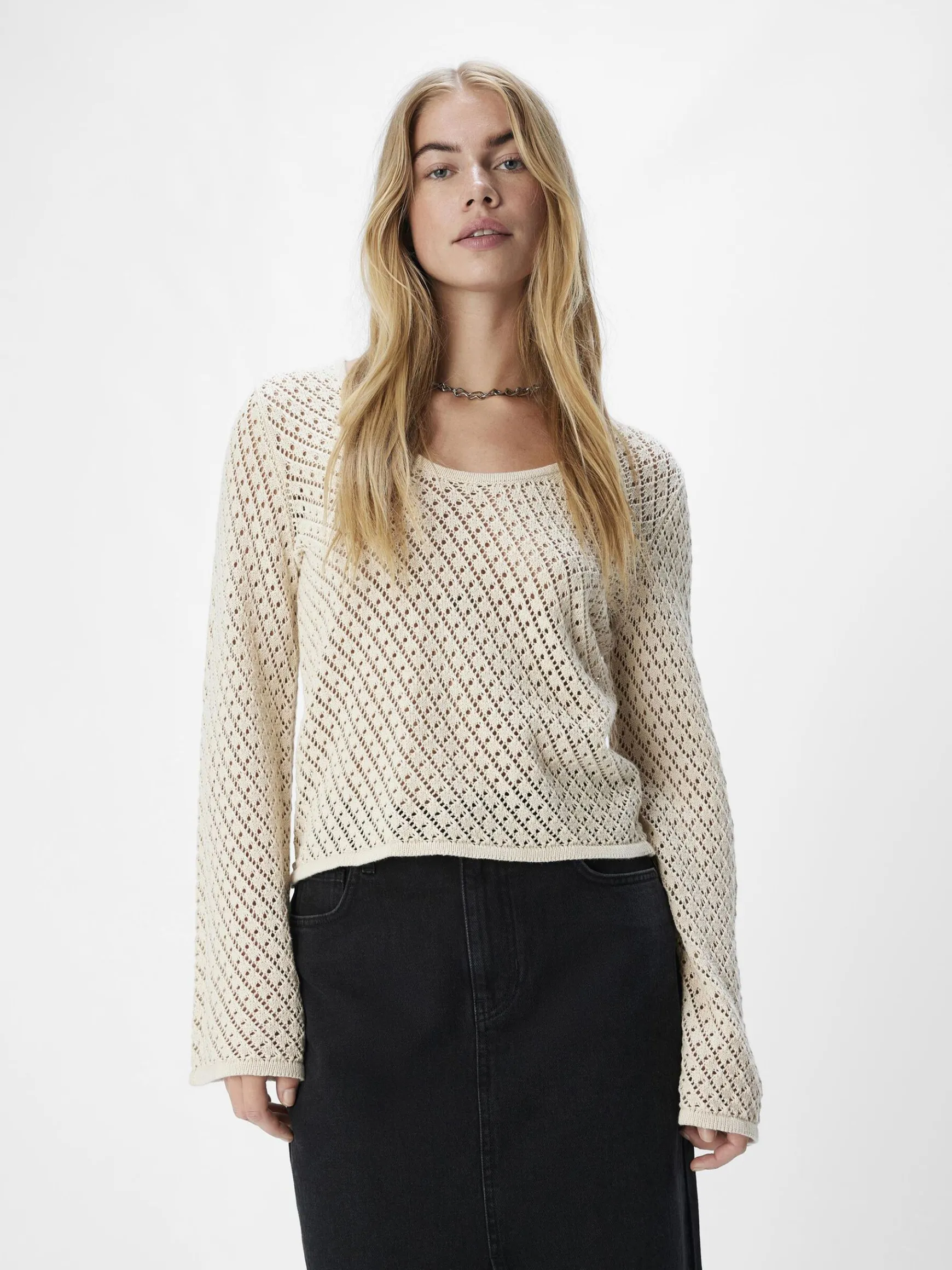 – Strikket trøje- Rund halsudskæring- Lange trumpetærmer- Gitterstrik- Uforet- Almindelig pasform