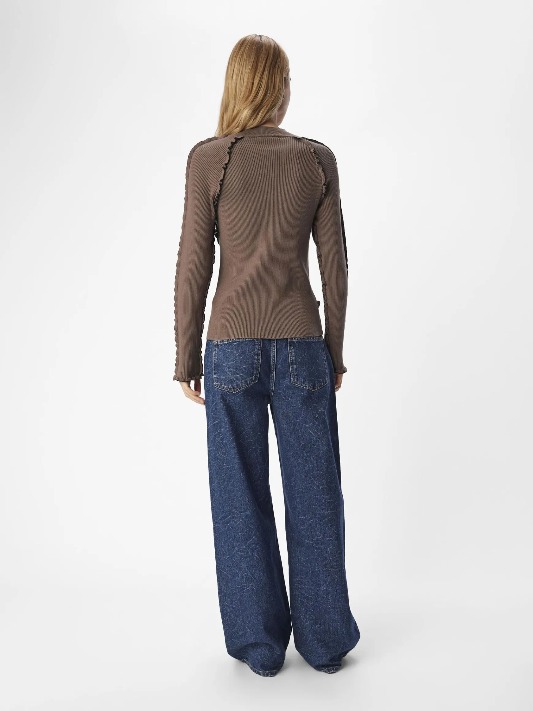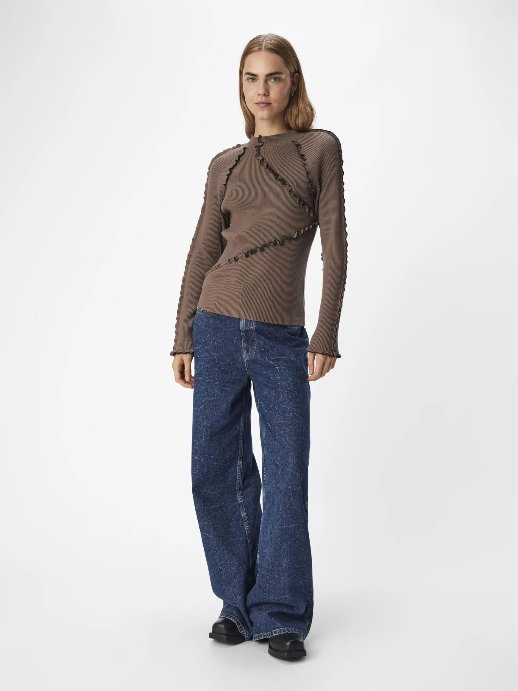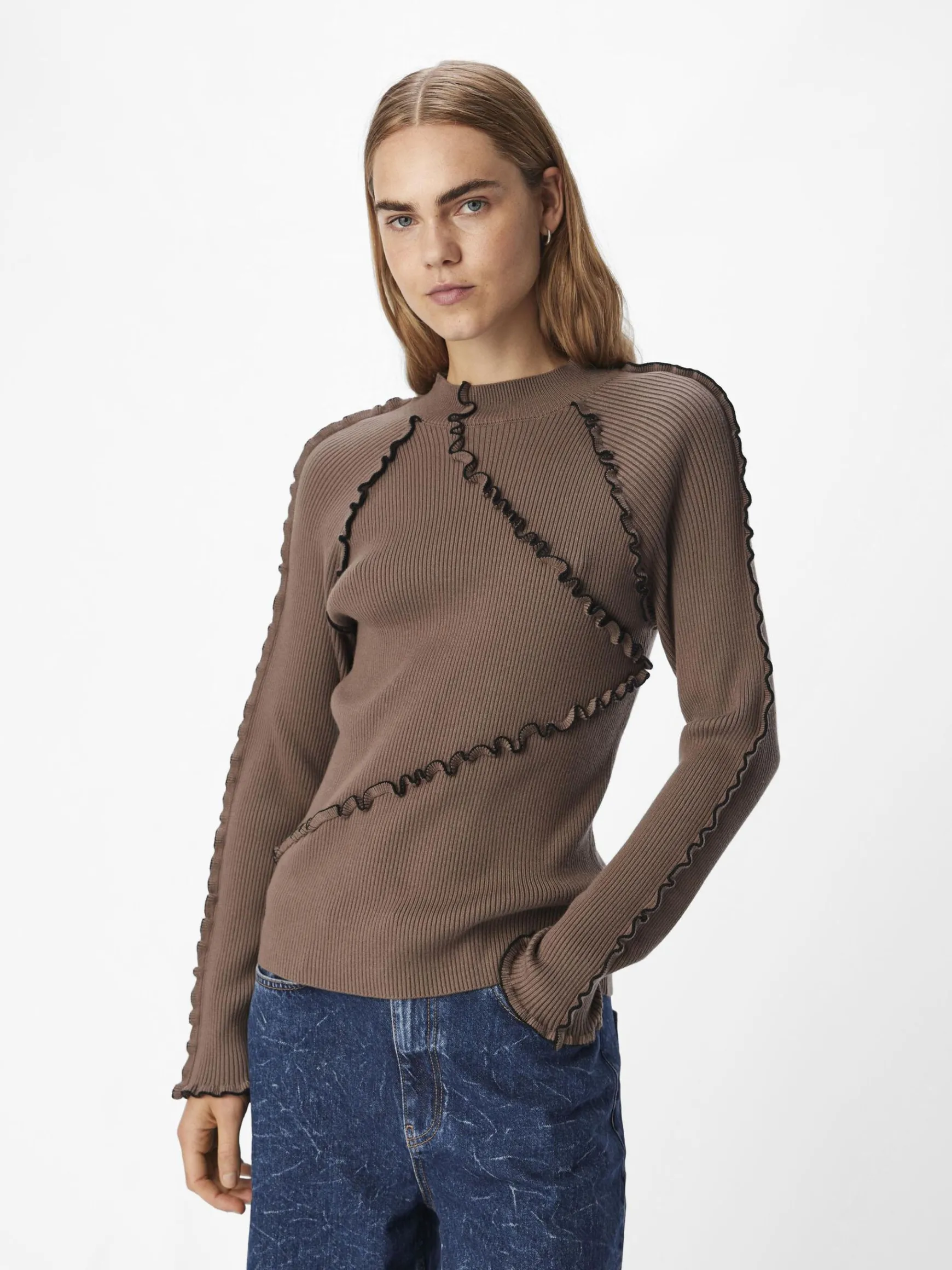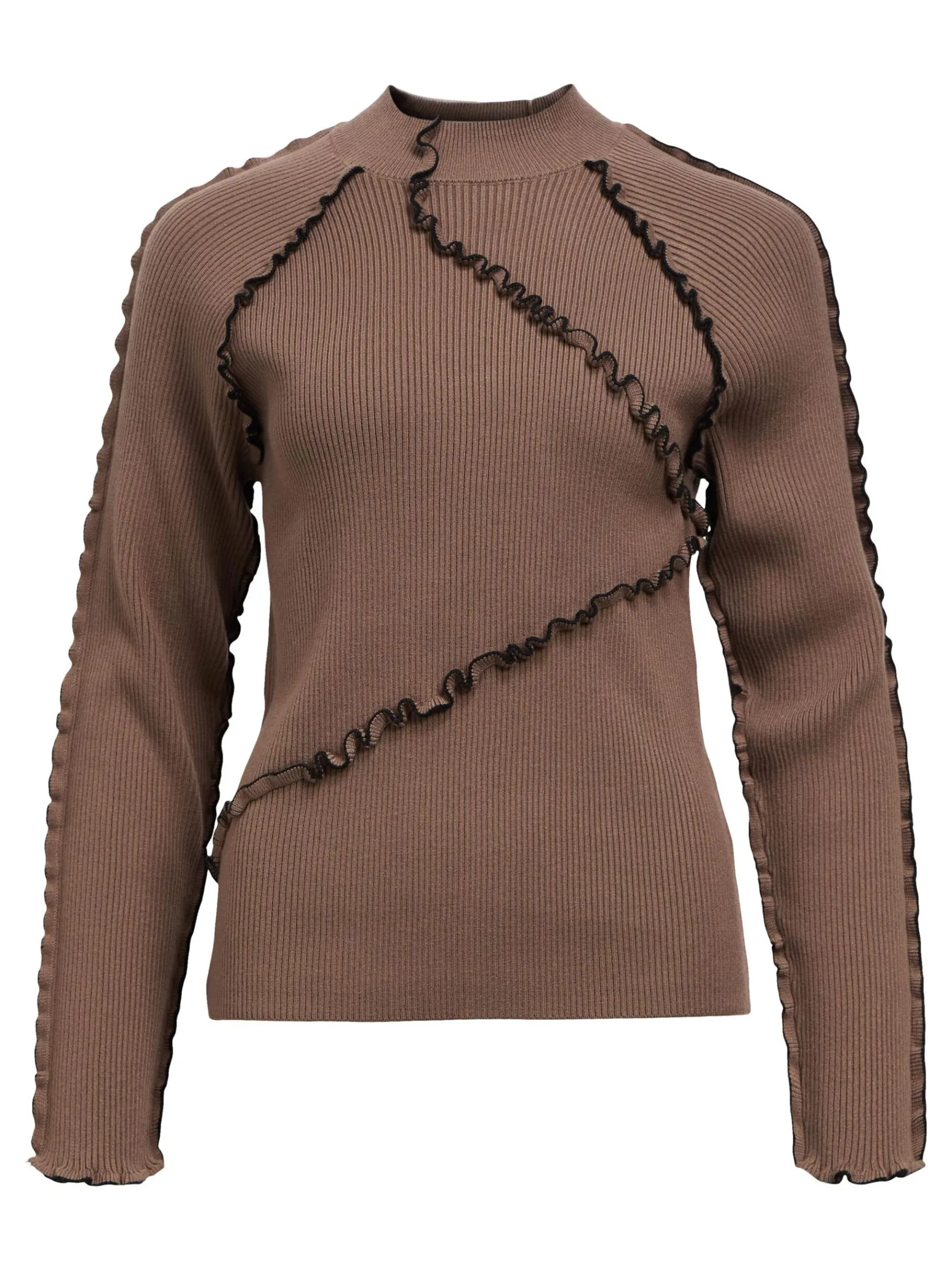 – Ribstrikket trøje- Høj hals- Raglan-skuldre- Lange ærmer- Dekorative babylock-syninger- Slim fit