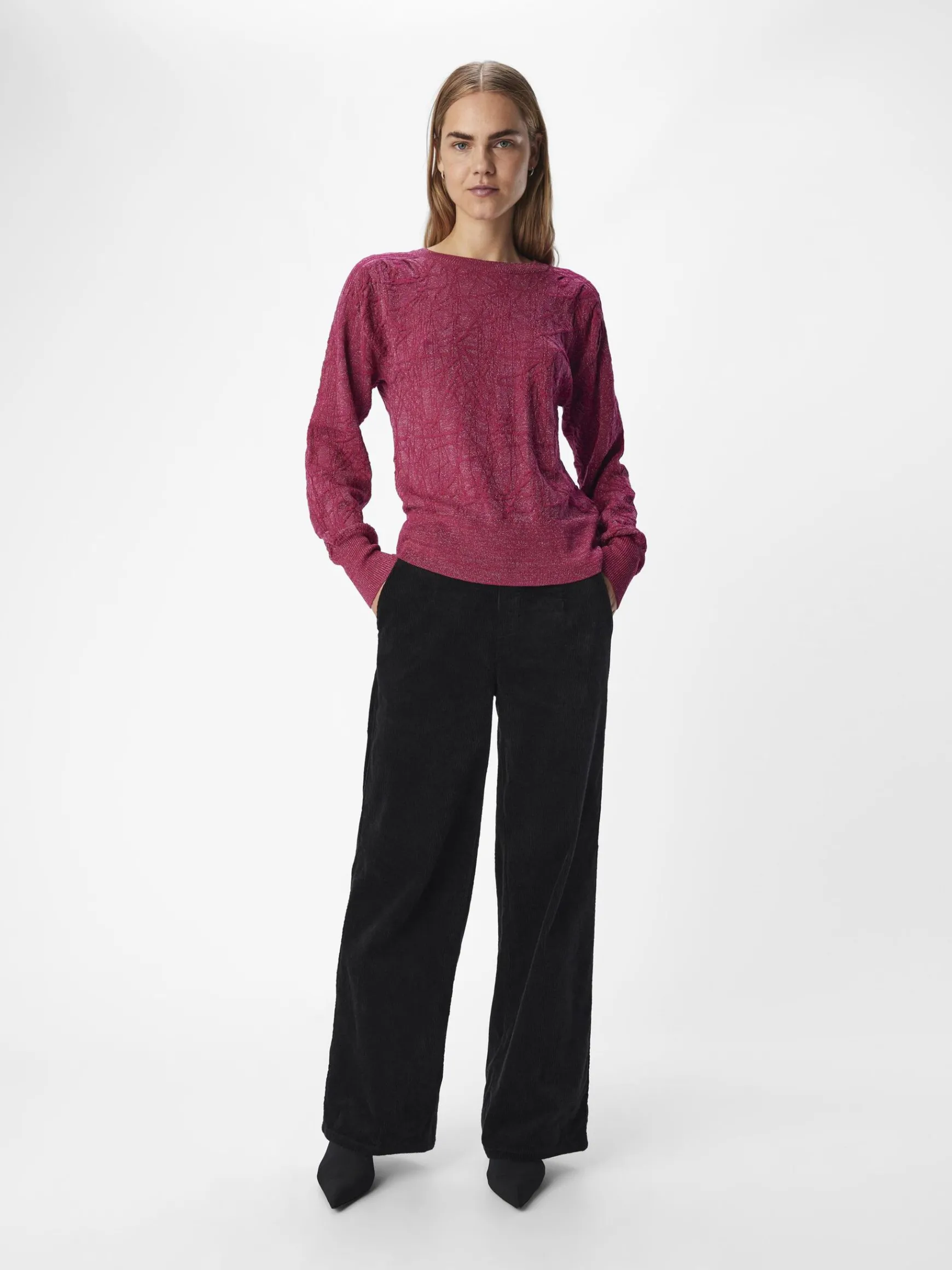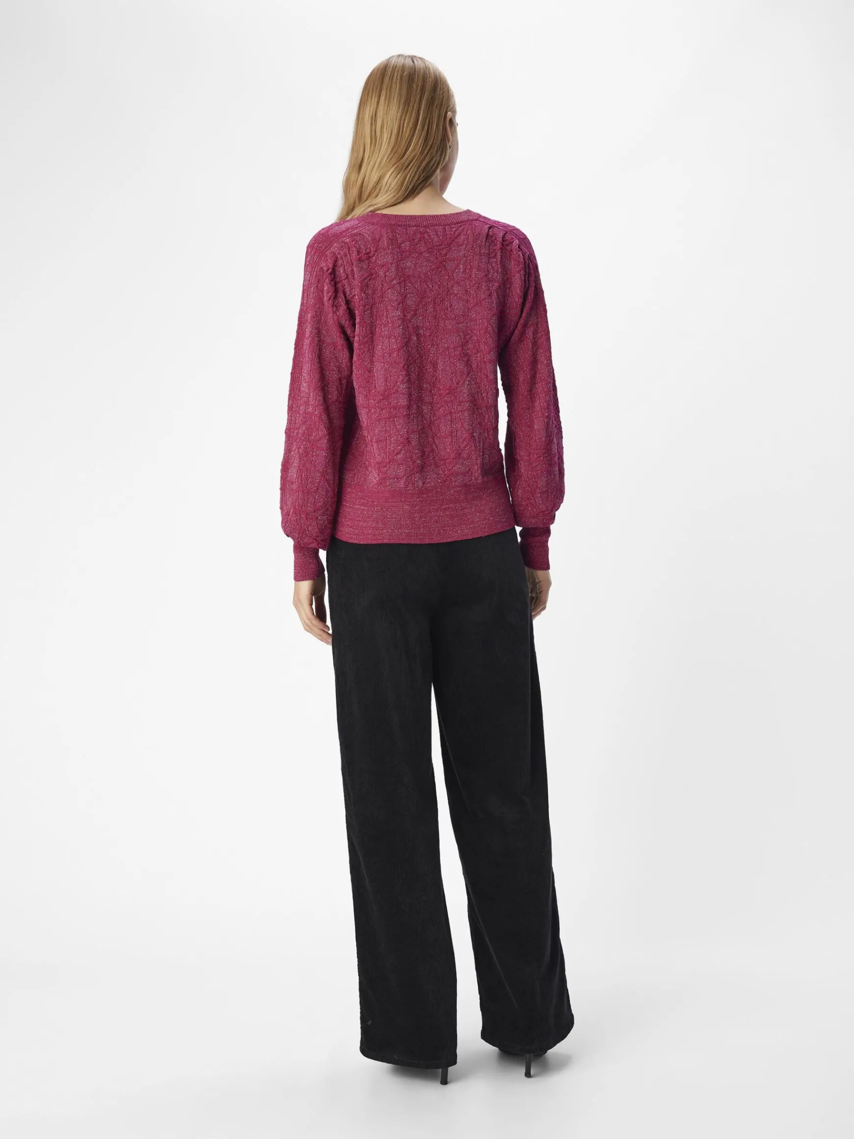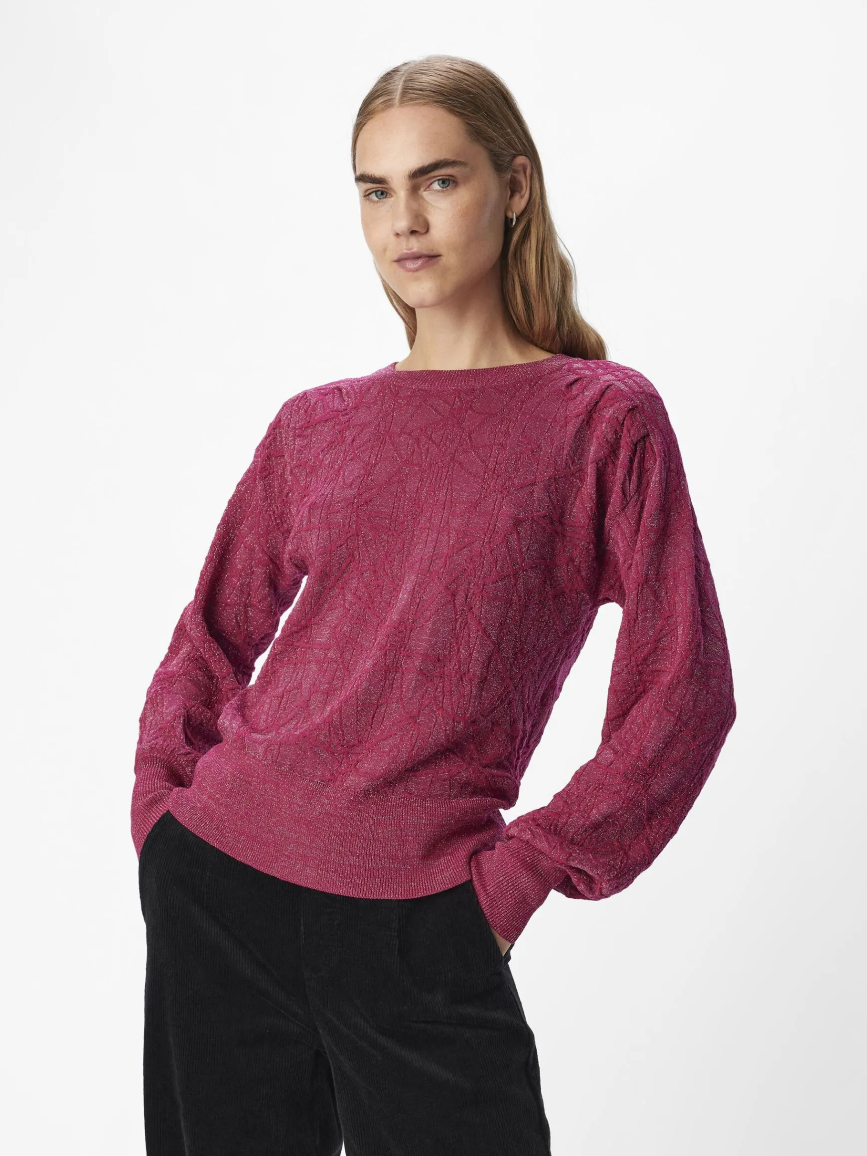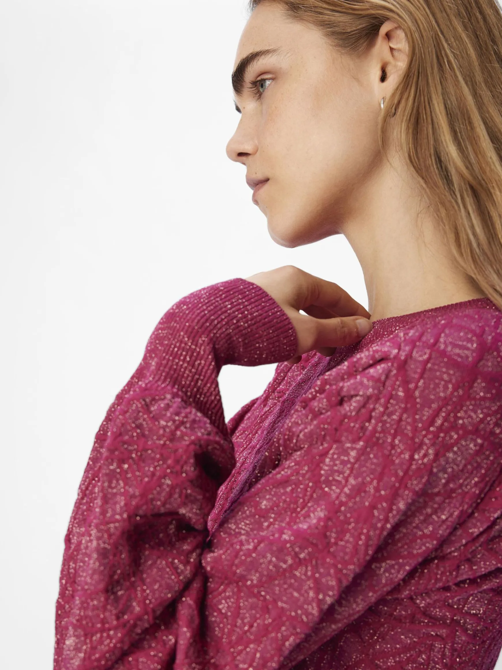 – Jacquard-strikket trøje- Rund halsudskæring- Lange ballonærmer- Lange tætsiddende ærmekanter- Fin ribstrikket kant- Almindelig pasform