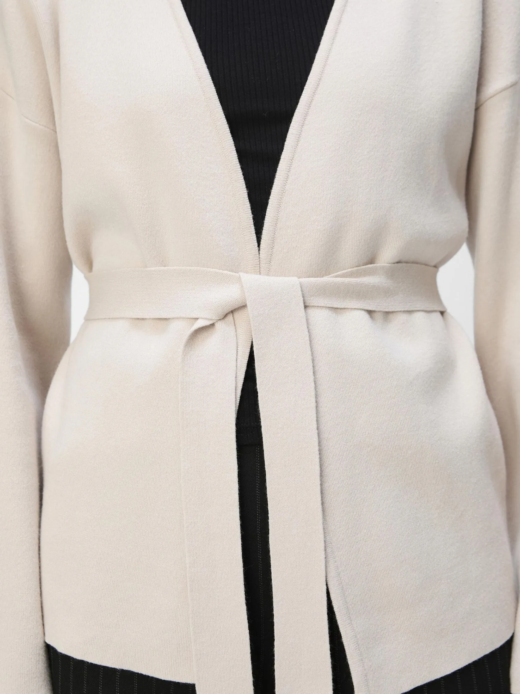 – Langærmet strikket slå-om-cardigan – V-hals- Bindebælte i taljen- Lave skuldre- Relaxed fit- Fremstillet med mere ansvarligt stof