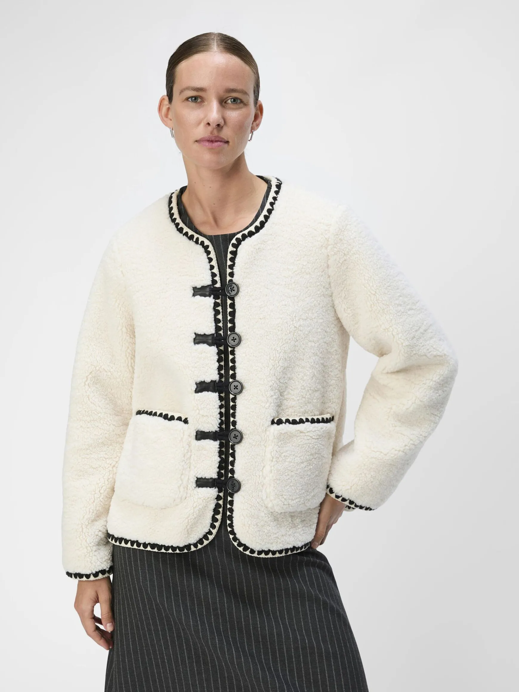 – Kort teddyjakke- Syninger i kontrast i kanterne- Rund hals- Lange ærmer- Knapper foran- Patch-lommer foran- Almindelig pasform