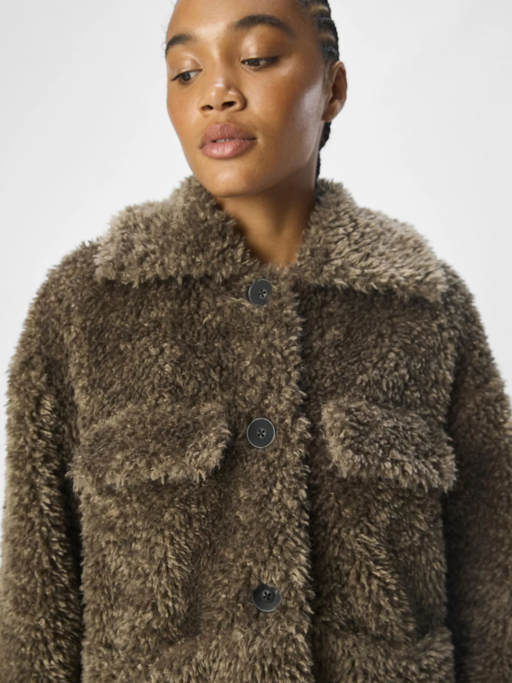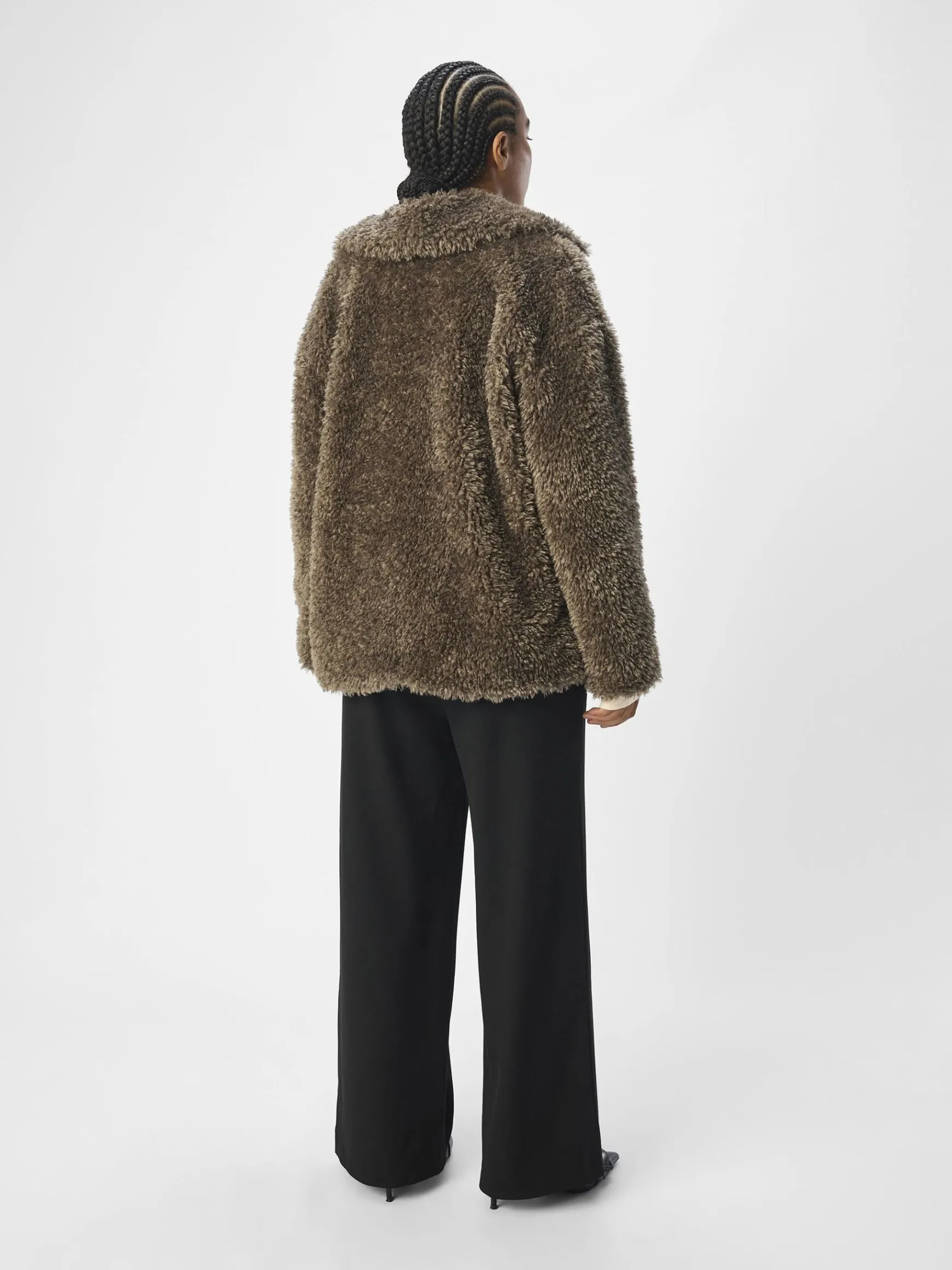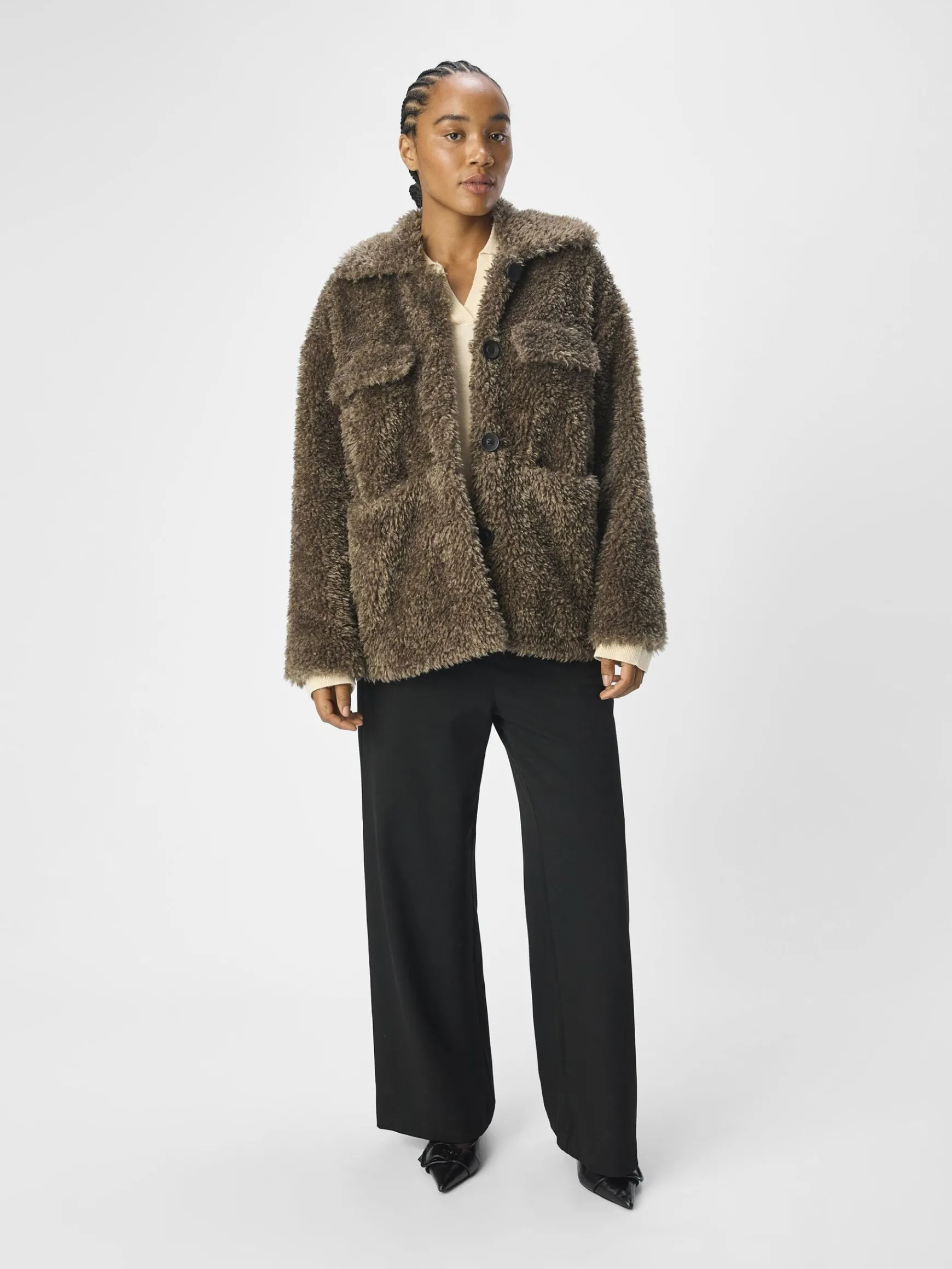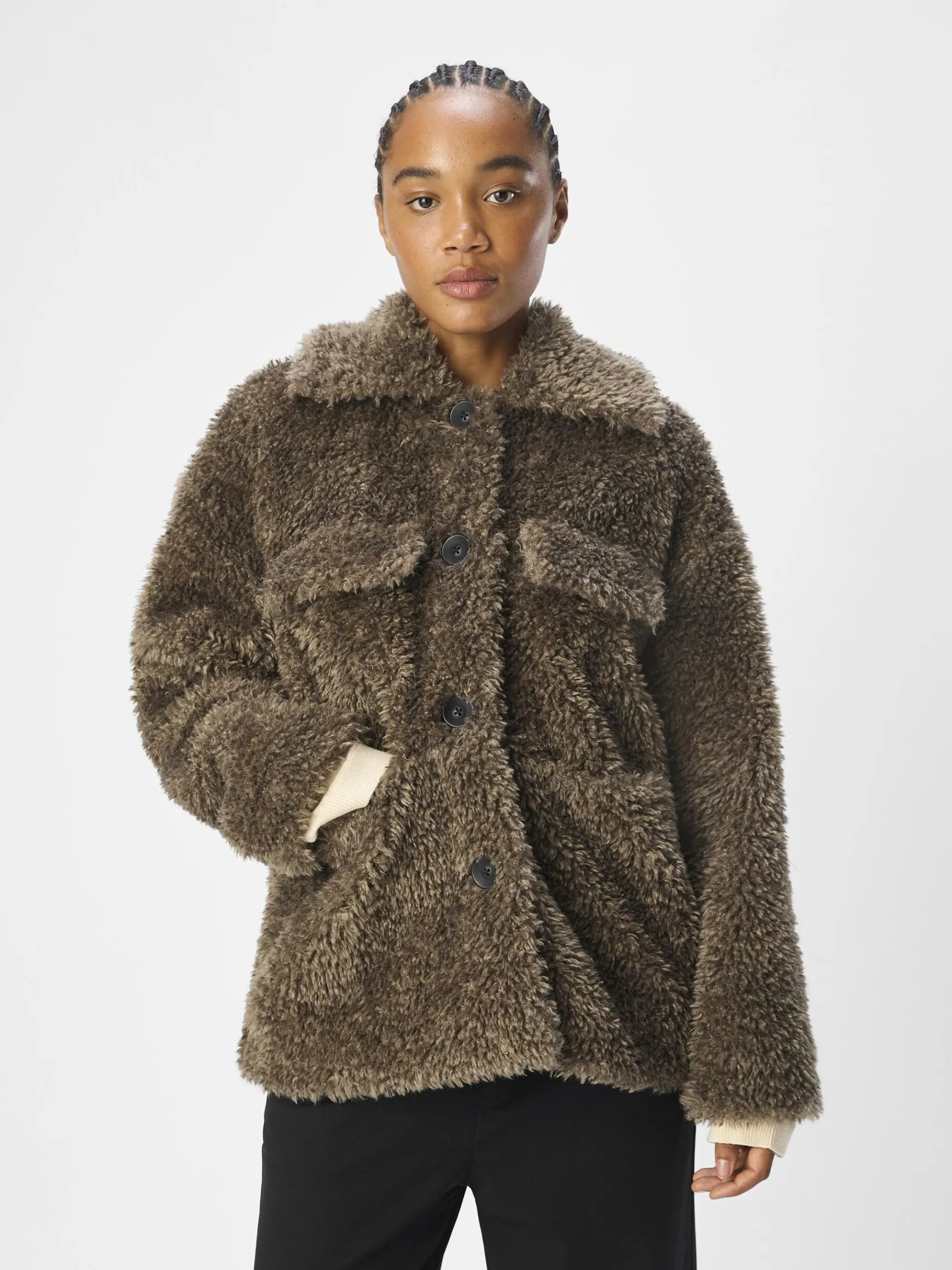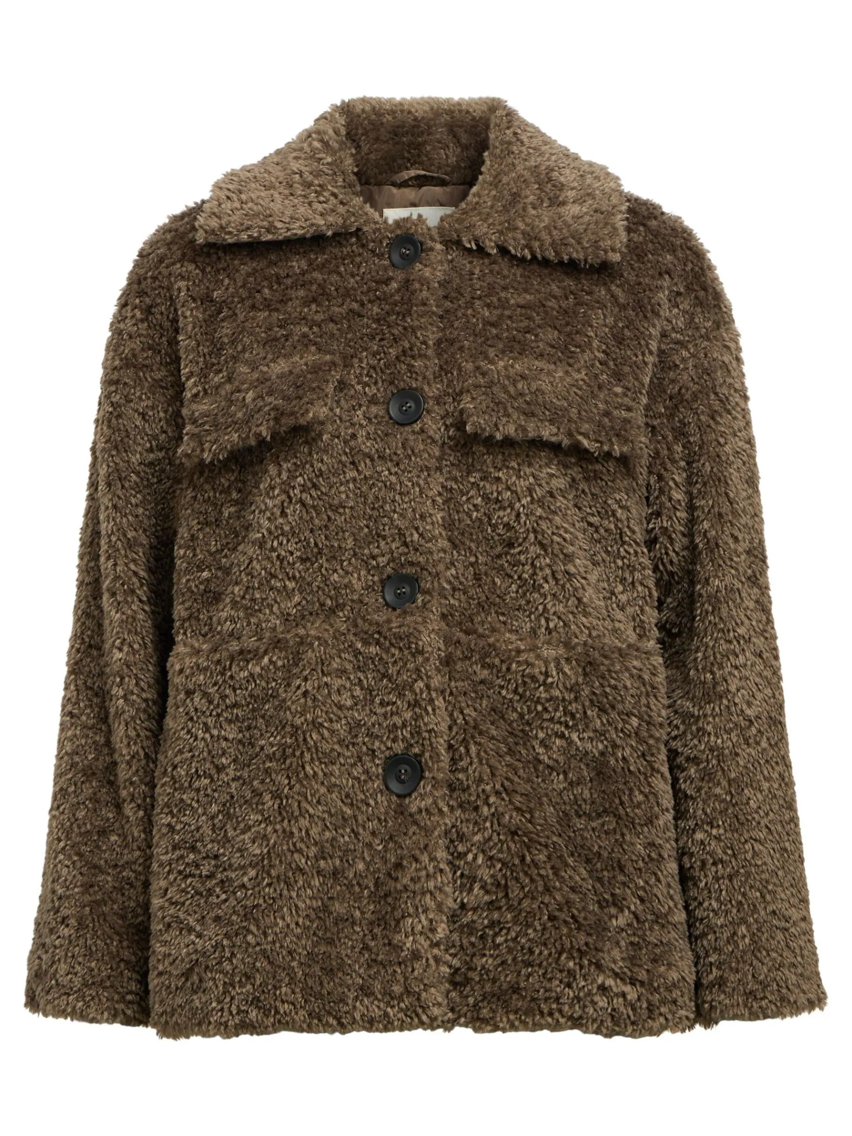 – Teddyjakke- Spredt krave- Lange ærmer- Knapper foran- Patch-lommer med flap på brystet- Løs pasform