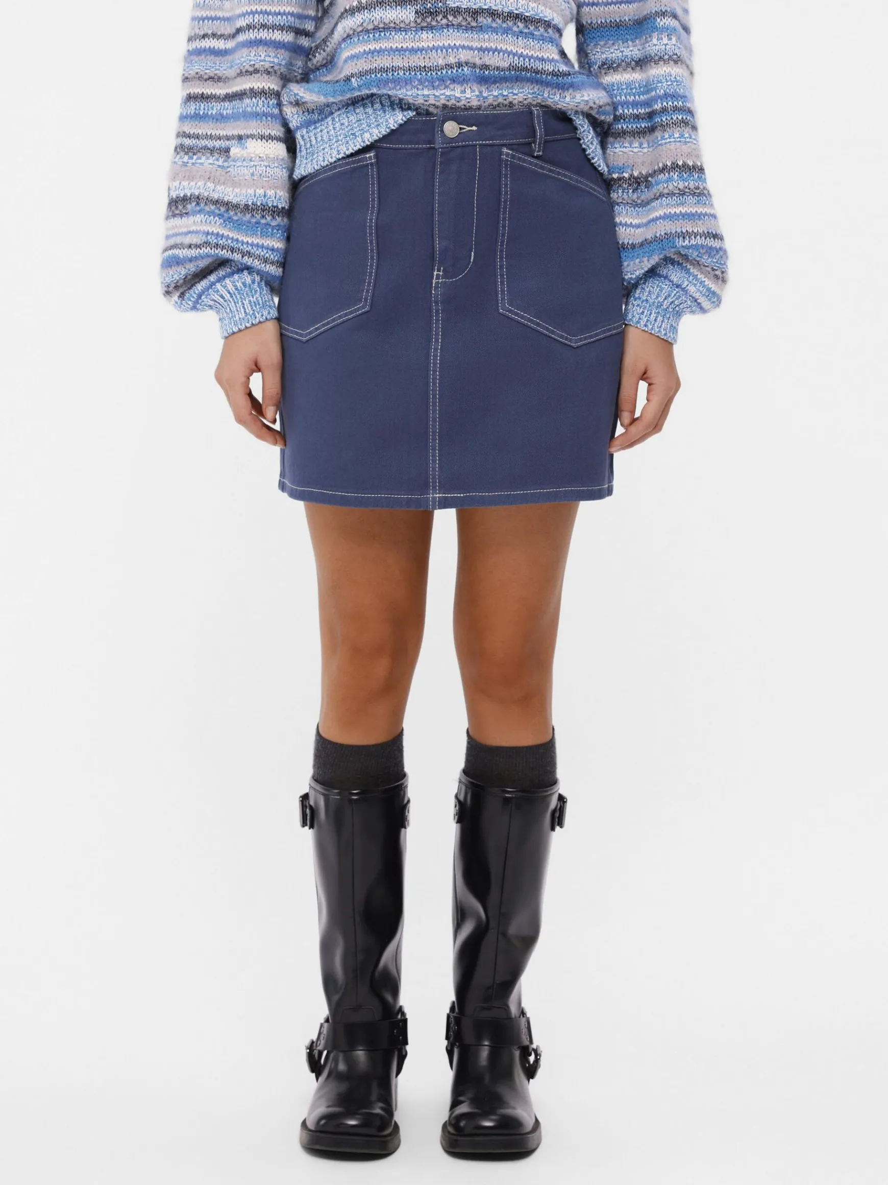 – Mininederdel med mellemhøj talje- Bæltestropper- Design med 5 lommer- Lynlåsgylp med nitteknaplukning- Almindelig pasform