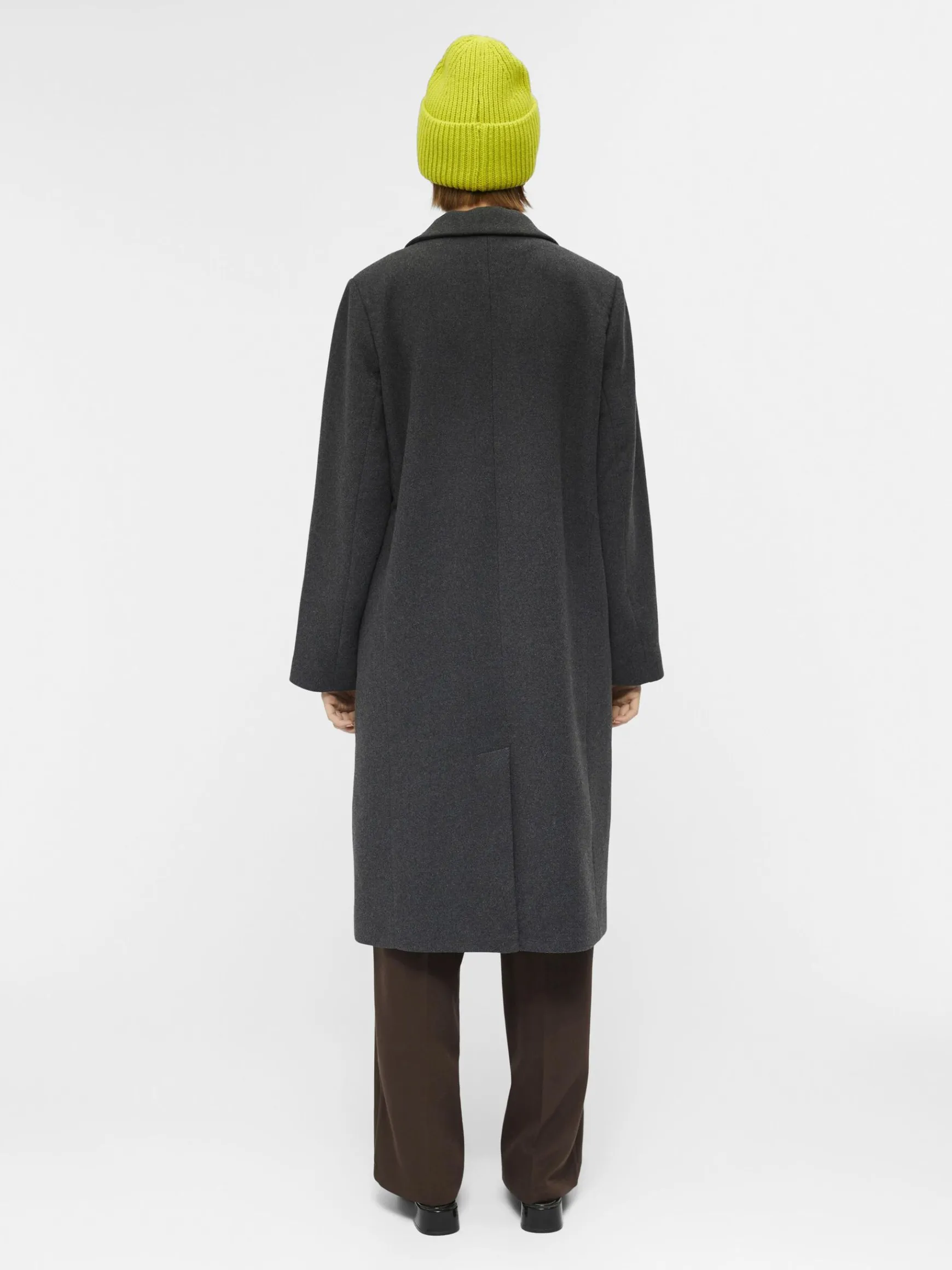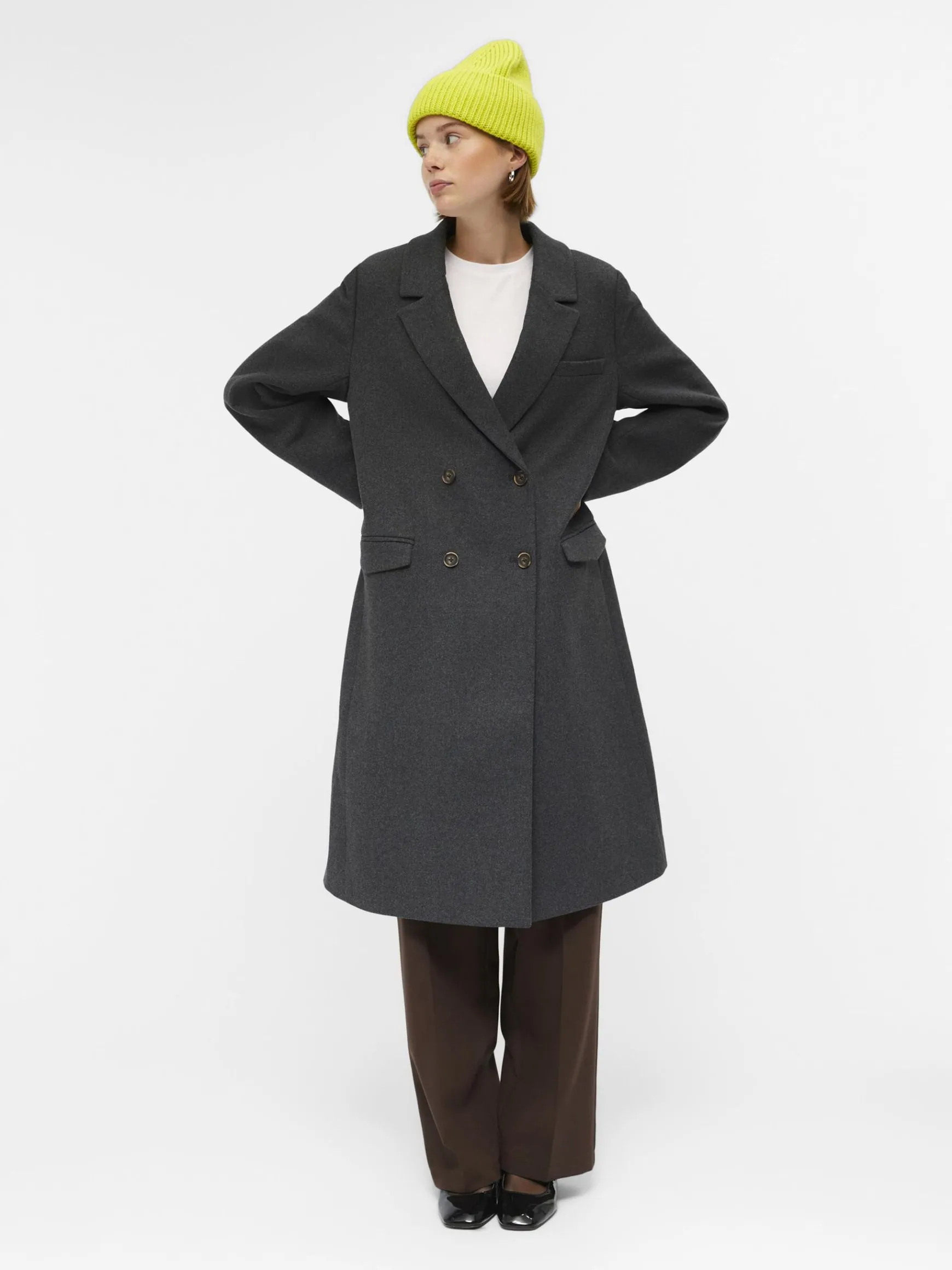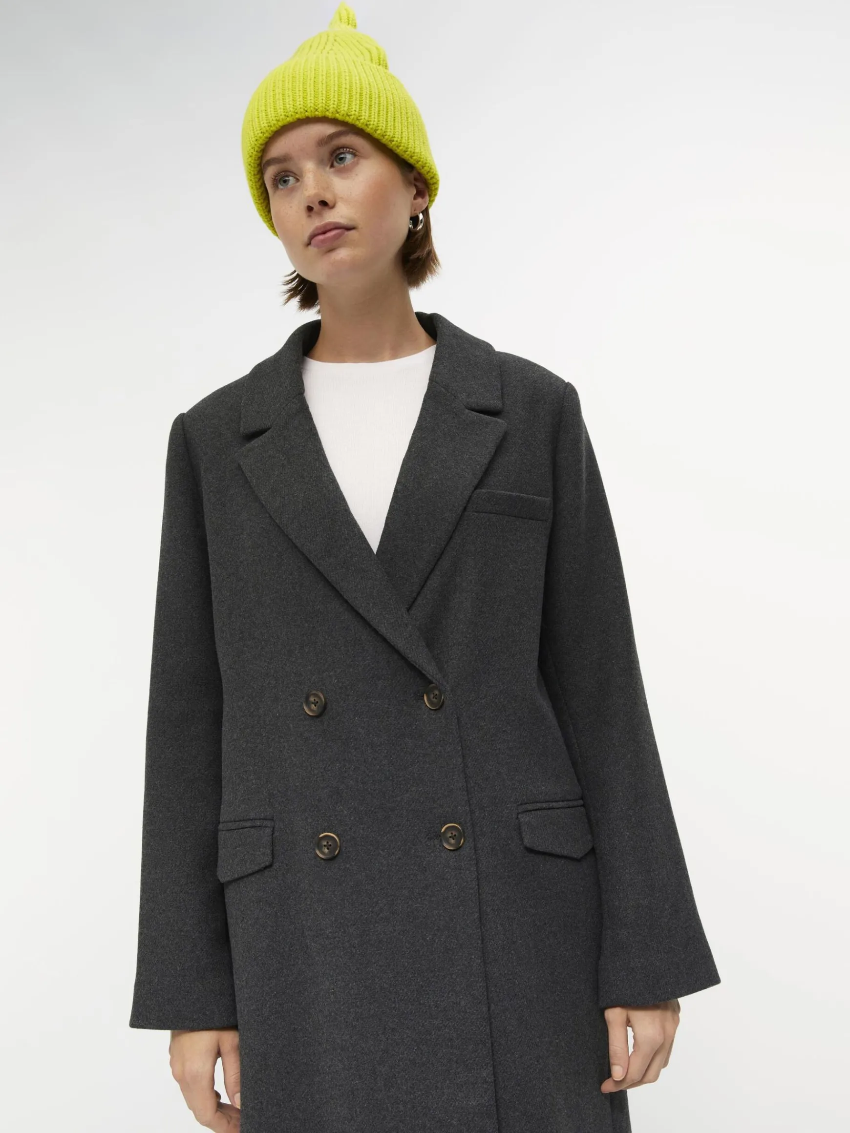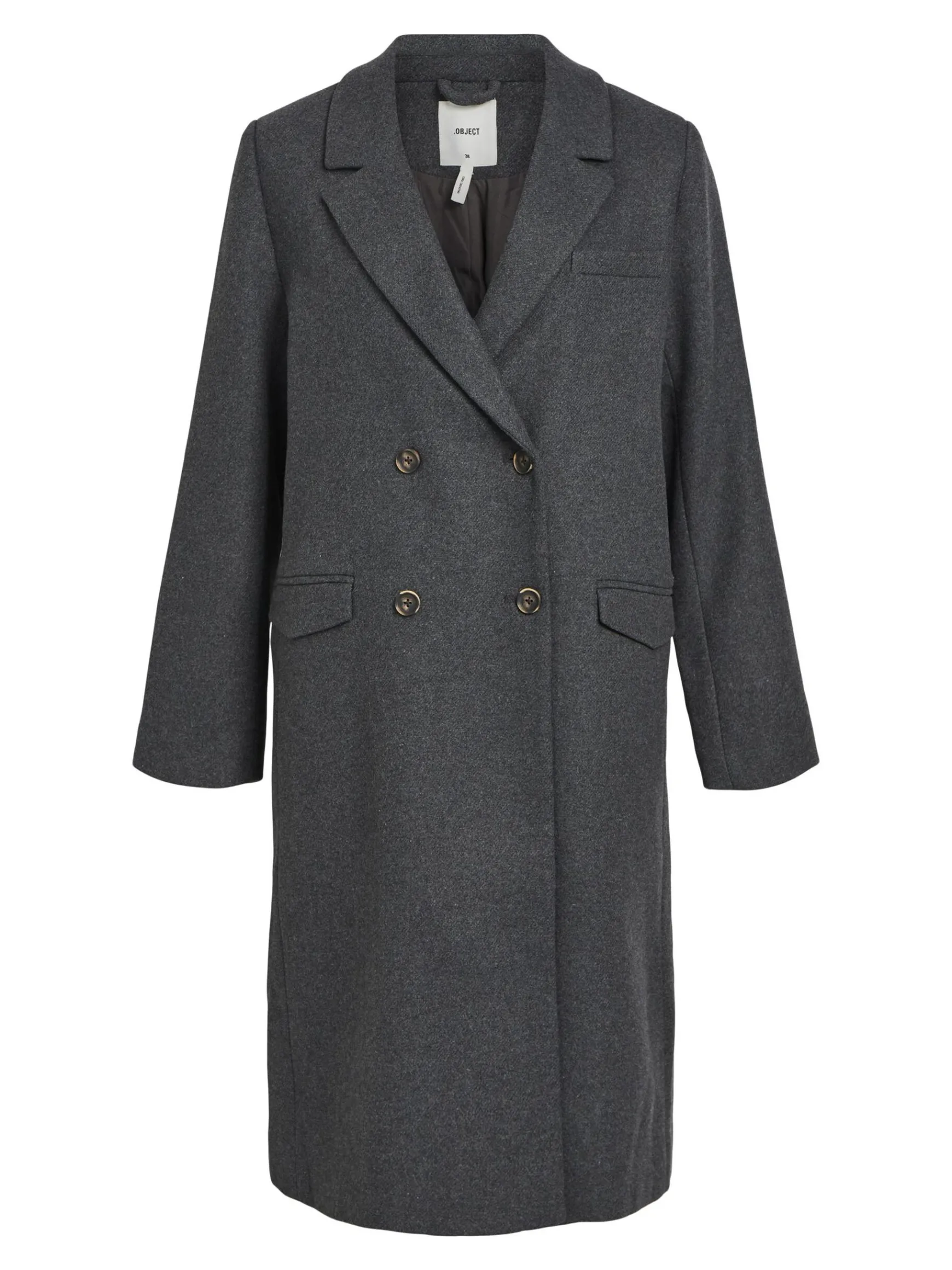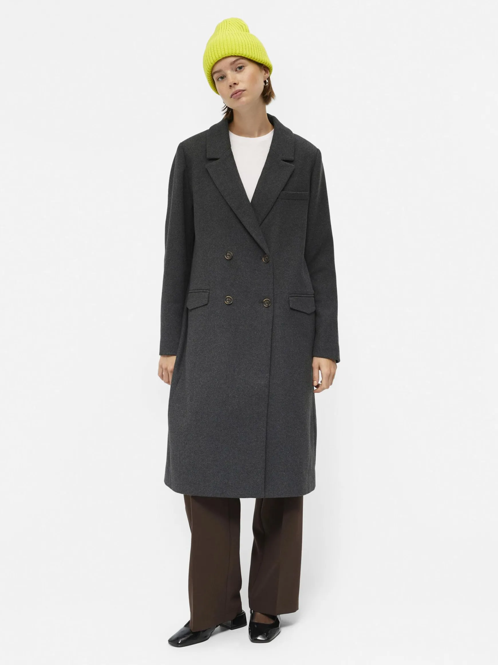 – Longline frakke i uldblanding- Dobbeltradet- Hakket revers- Lange ærmer- Knaplukning- Paspoleret brystlomme- Stolpelo…