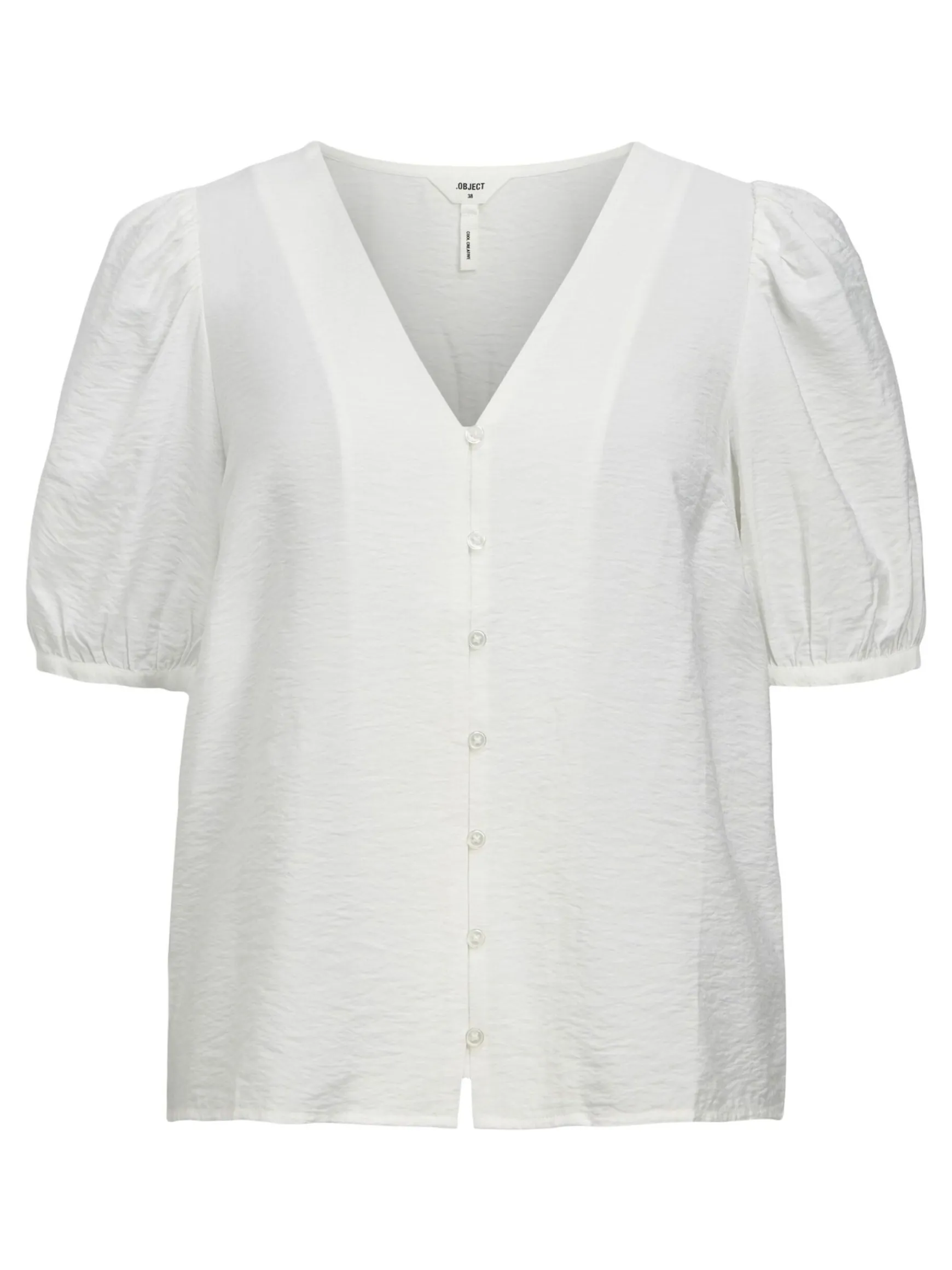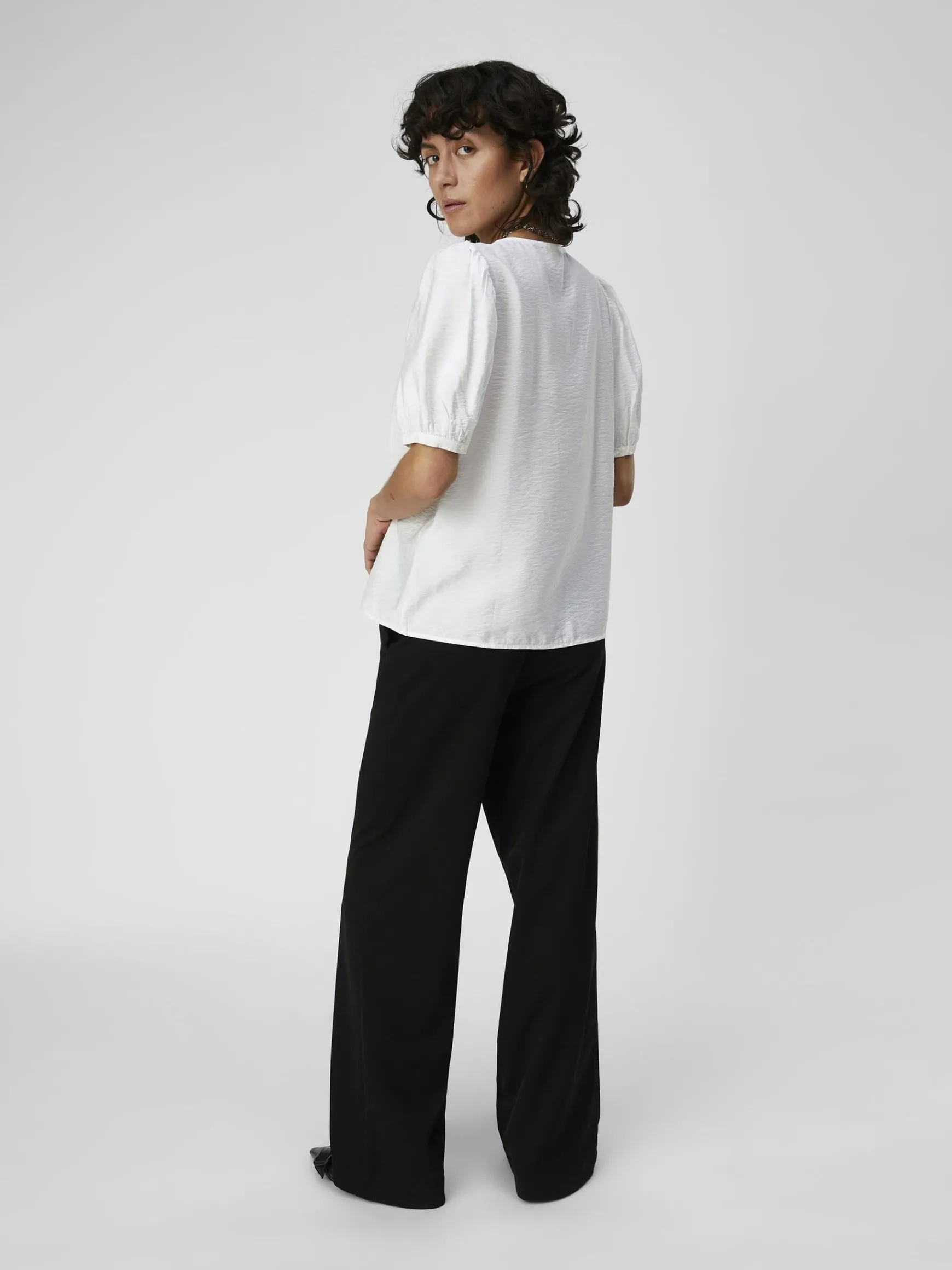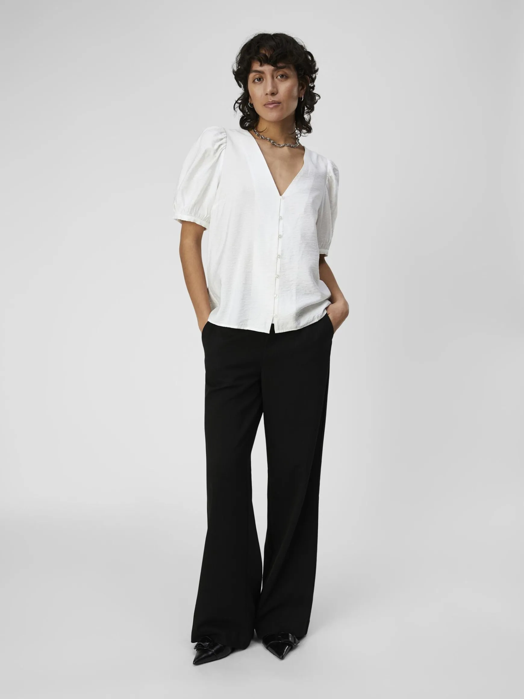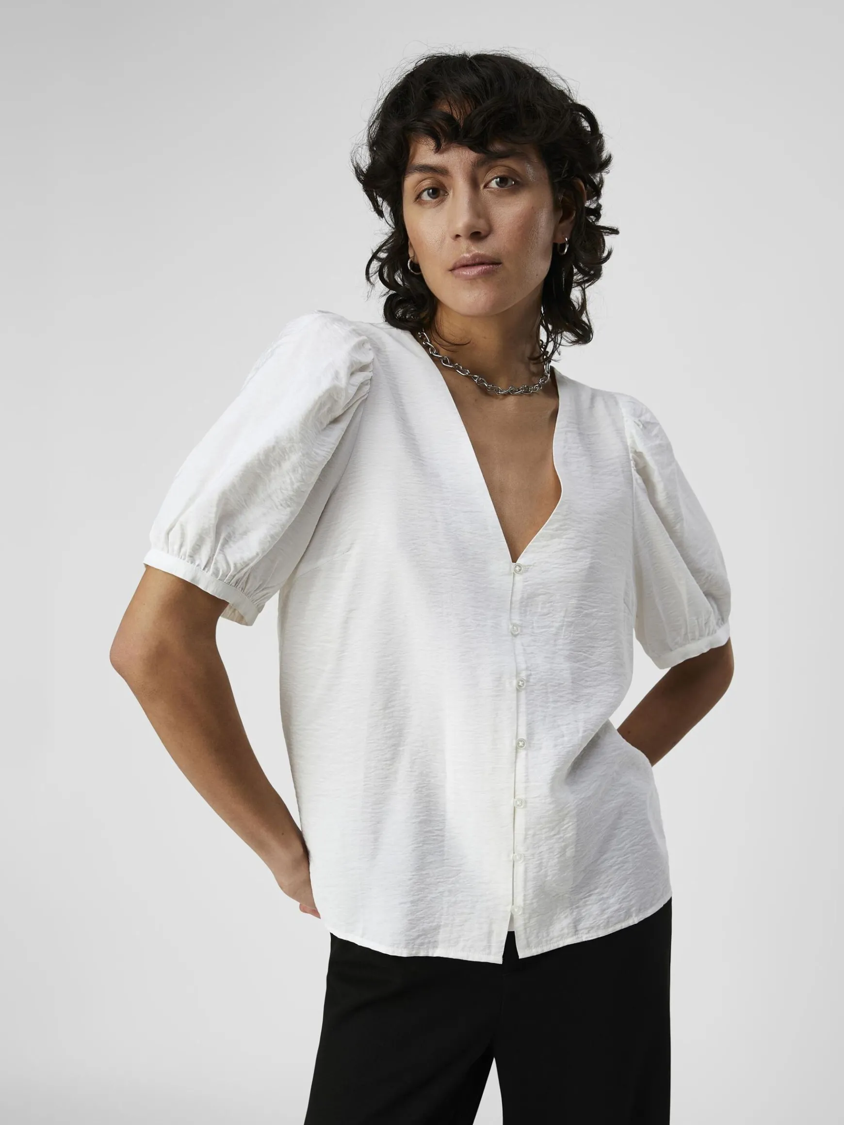 -Top med V-udskæring-Korte pufærmer-Båndede ærmekanter-Knappet foran-Regular fit-Lavet med mere ansvarlige materialer
