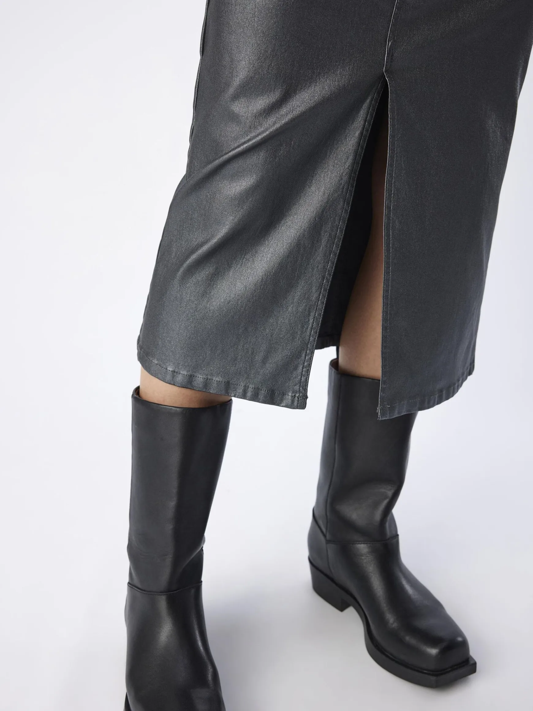 – Midinederdel med mellemhøjtalje og skinnende belægning- Bæltestropper- Design med 5 lommer- Skjult ynlåsgylp med nitteknaplukning- Slim fit