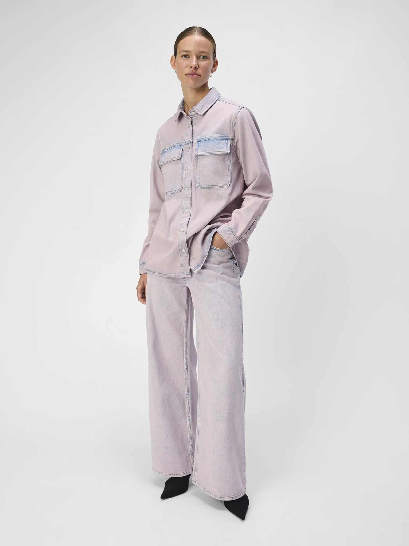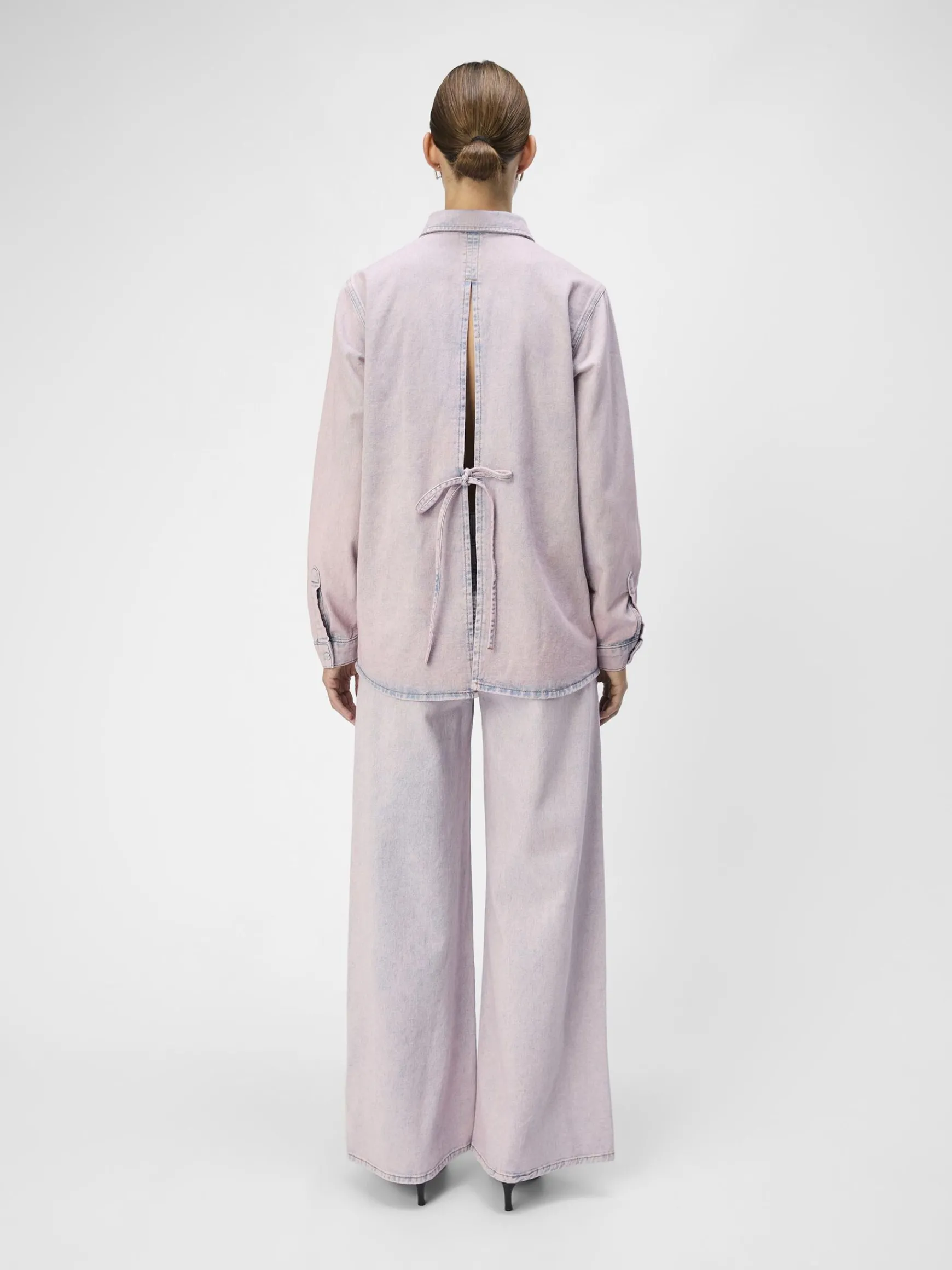– Denim-overskjorte med åben ryg- En del af et matchende sæt- Bindedetalje bagpå- Kort krave- Lange ærmer- Faner ved ærmekanter- Patch-lommer på brystet- Knapper foran- Falmet pink vask- Almindelig pasform- Modellen er iført størrelse 36