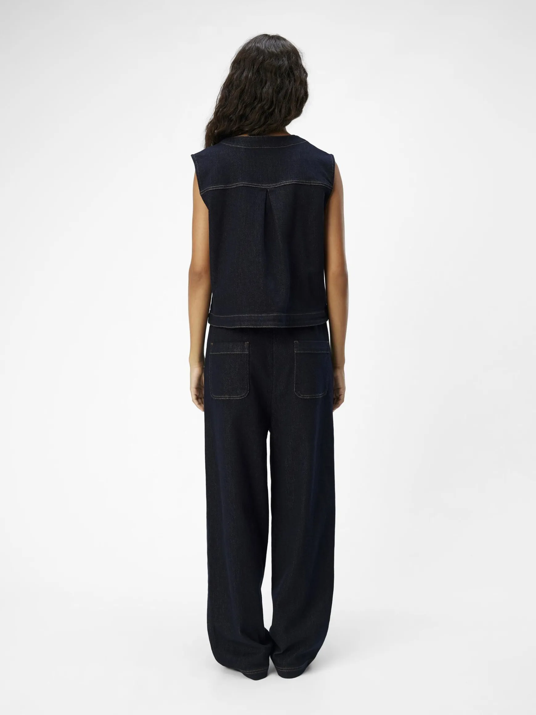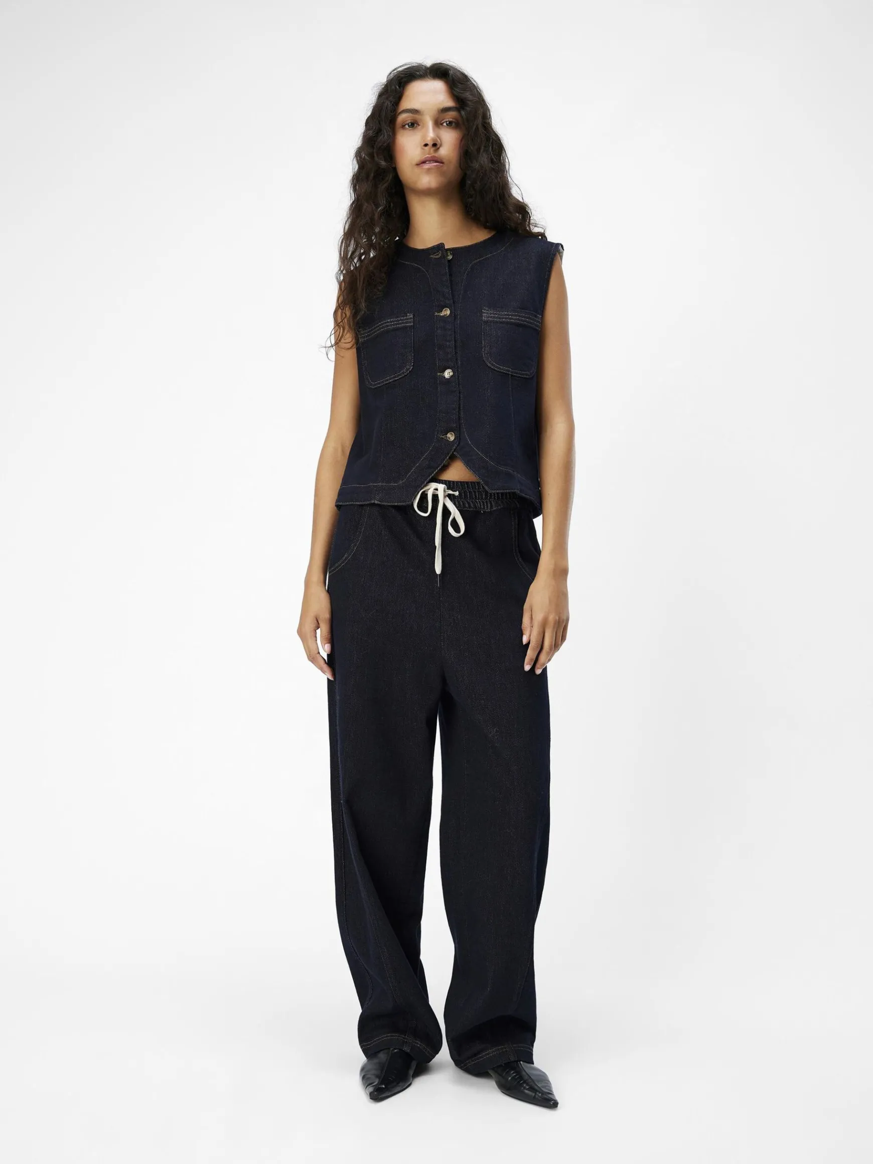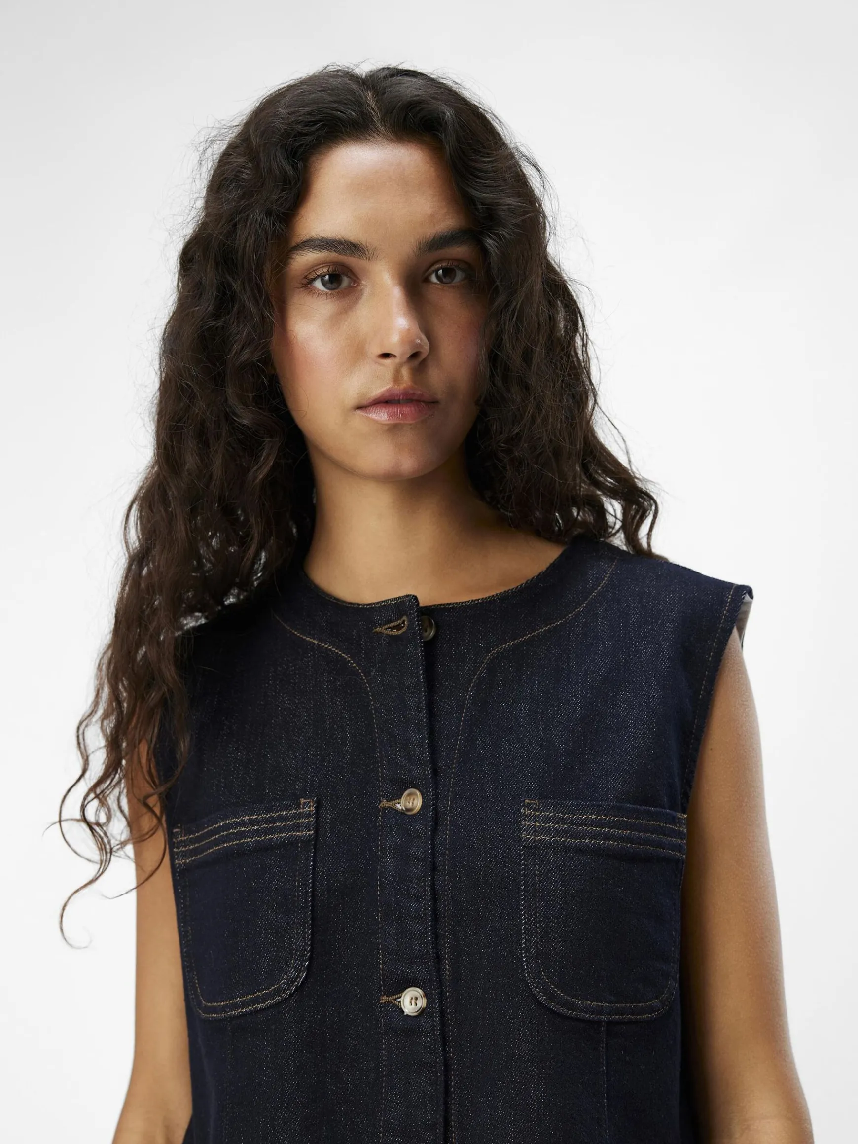– Denimvest- En del af et matchende sæt- Rund hals- Patch-lommer på brystet- Knapper foran- Almindelig pasform