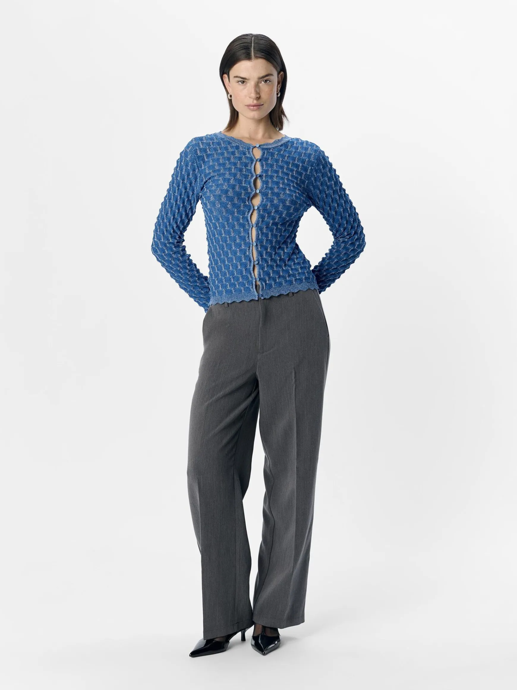 – Tekstureret detaljeret cardigan- Rund halsudskæring- Lange ærmer- Fine ribstrikkede ærmekanter med bølgekant- Slim…