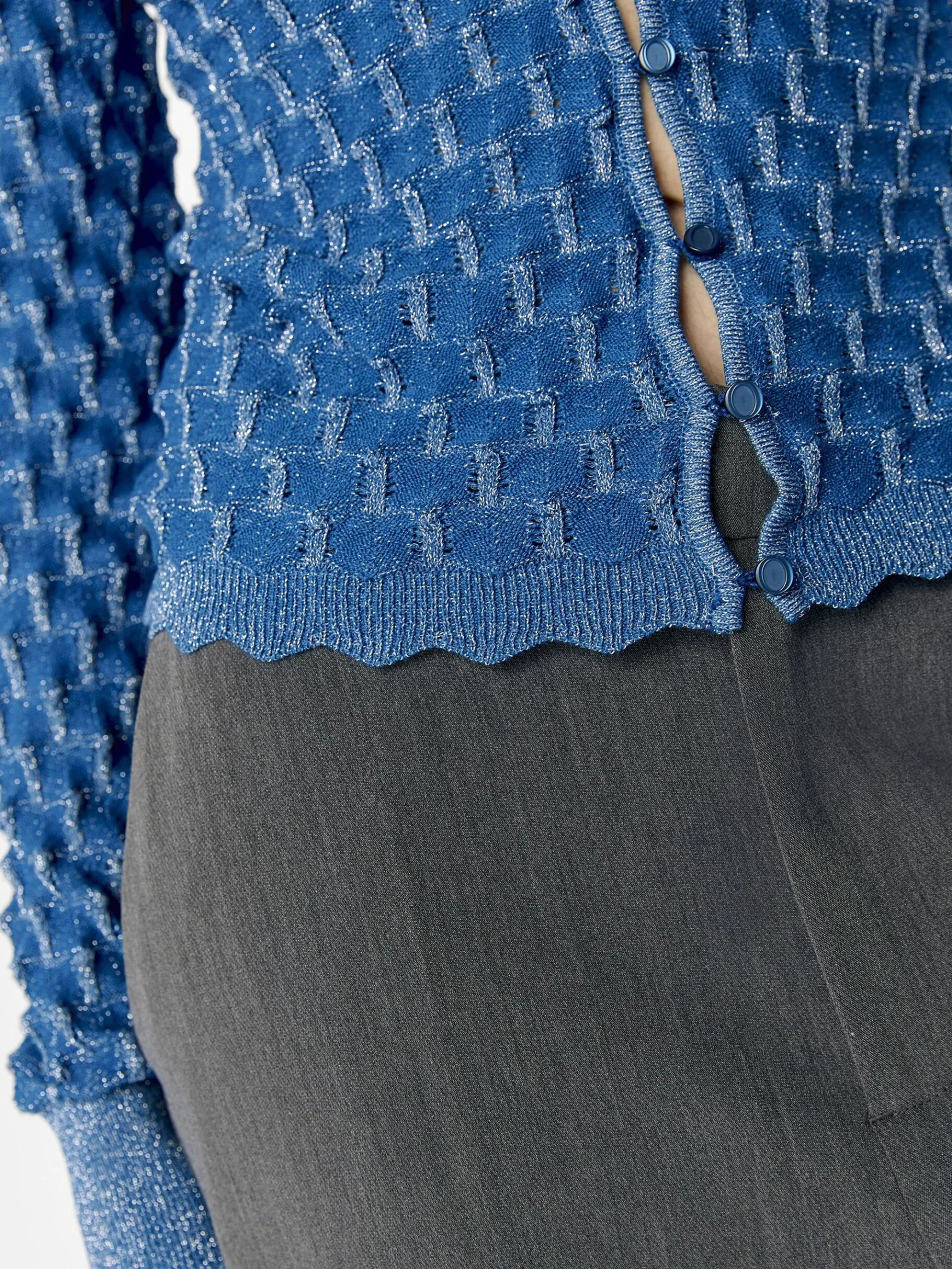 – Tekstureret detaljeret cardigan- Rund halsudskæring- Lange ærmer- Fine ribstrikkede ærmekanter med bølgekant- Slim fit