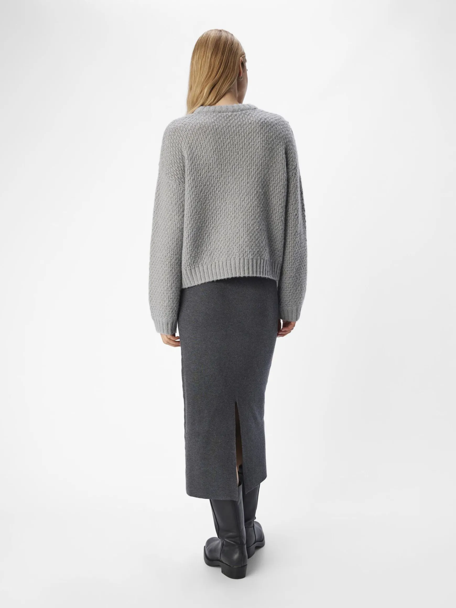 – Strikket trøje med chunky detalje- Rund halsudskæring- Sænkede skuldre- Lange ærmer- Tætsiddende ærmekanter- Rib…