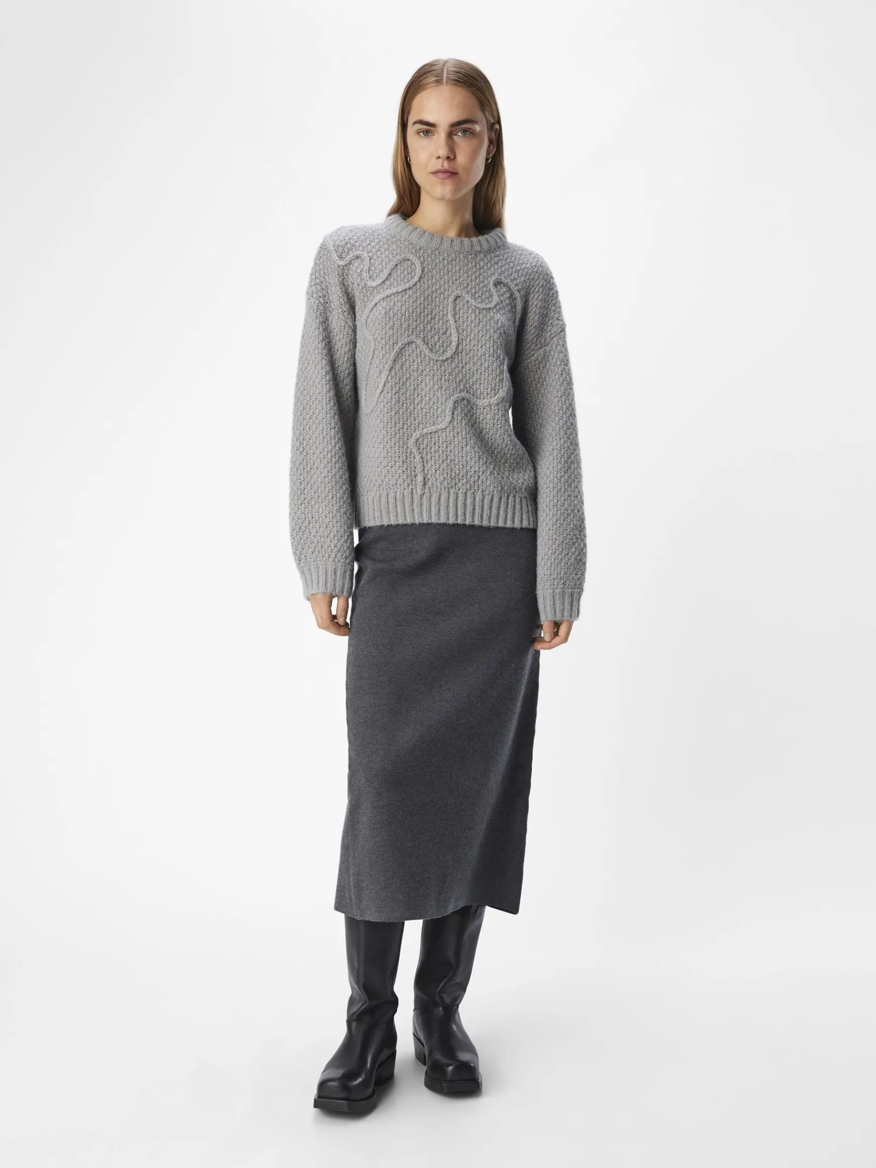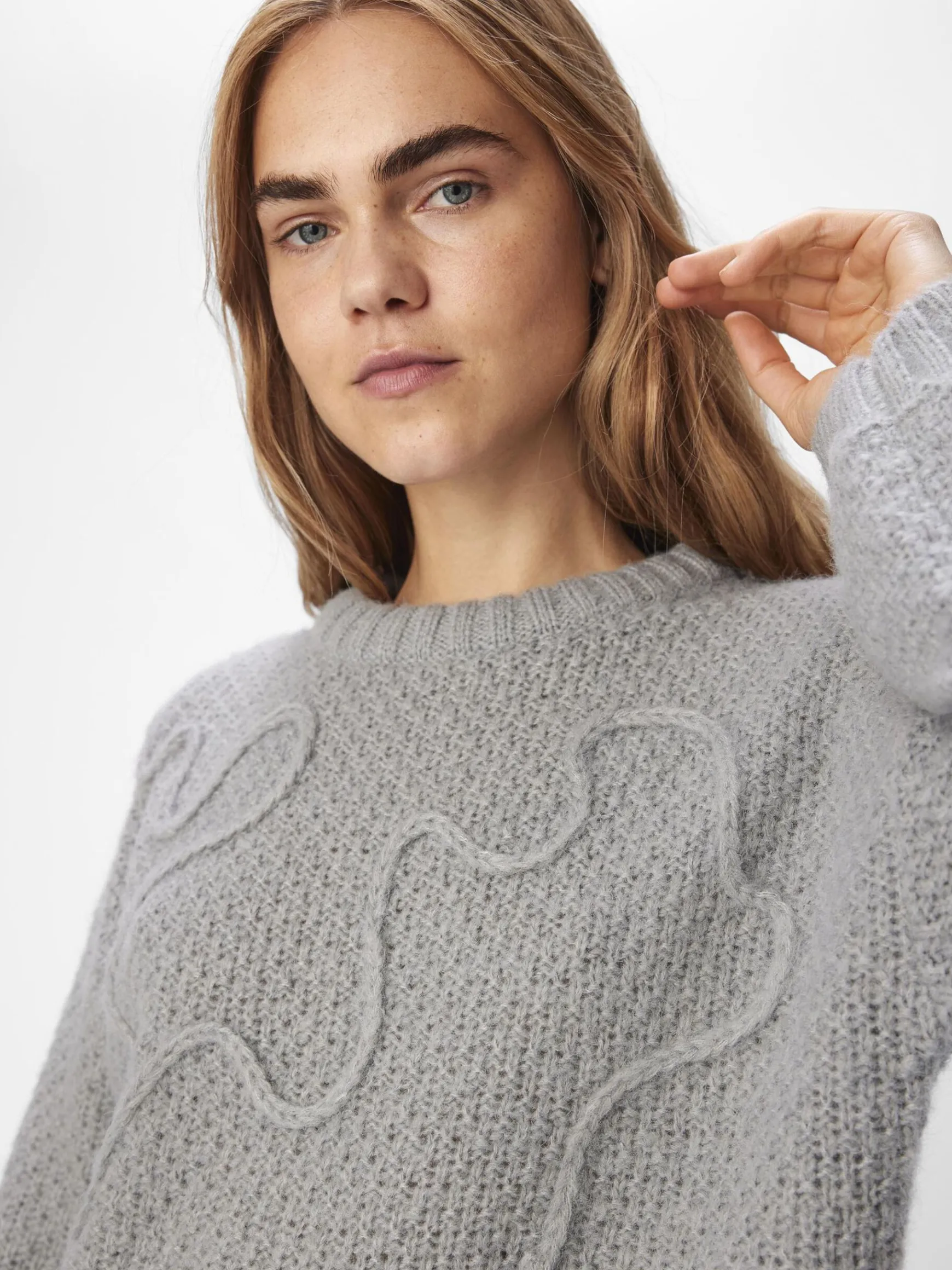– Strikket trøje med chunky detalje- Rund halsudskæring- Sænkede skuldre- Lange ærmer- Tætsiddende ærmekanter- Ribbede kanter- Regular fit