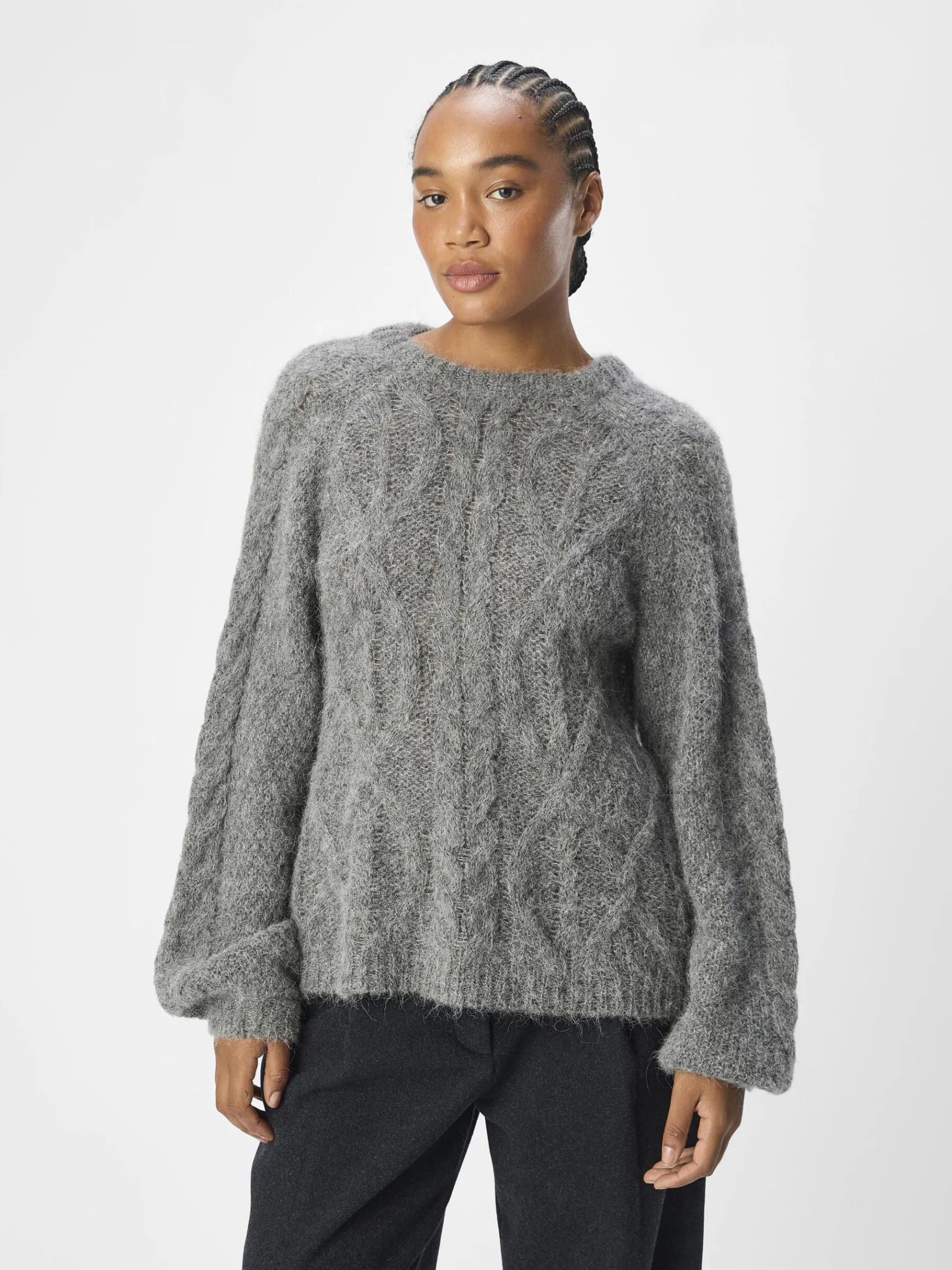 – Kabelstrikket trøje med åben ryg- Sløjfelukning- Rund halsudskæring- Lange voluminøse ærmer- Ribbede kanter- Almindelig pasform