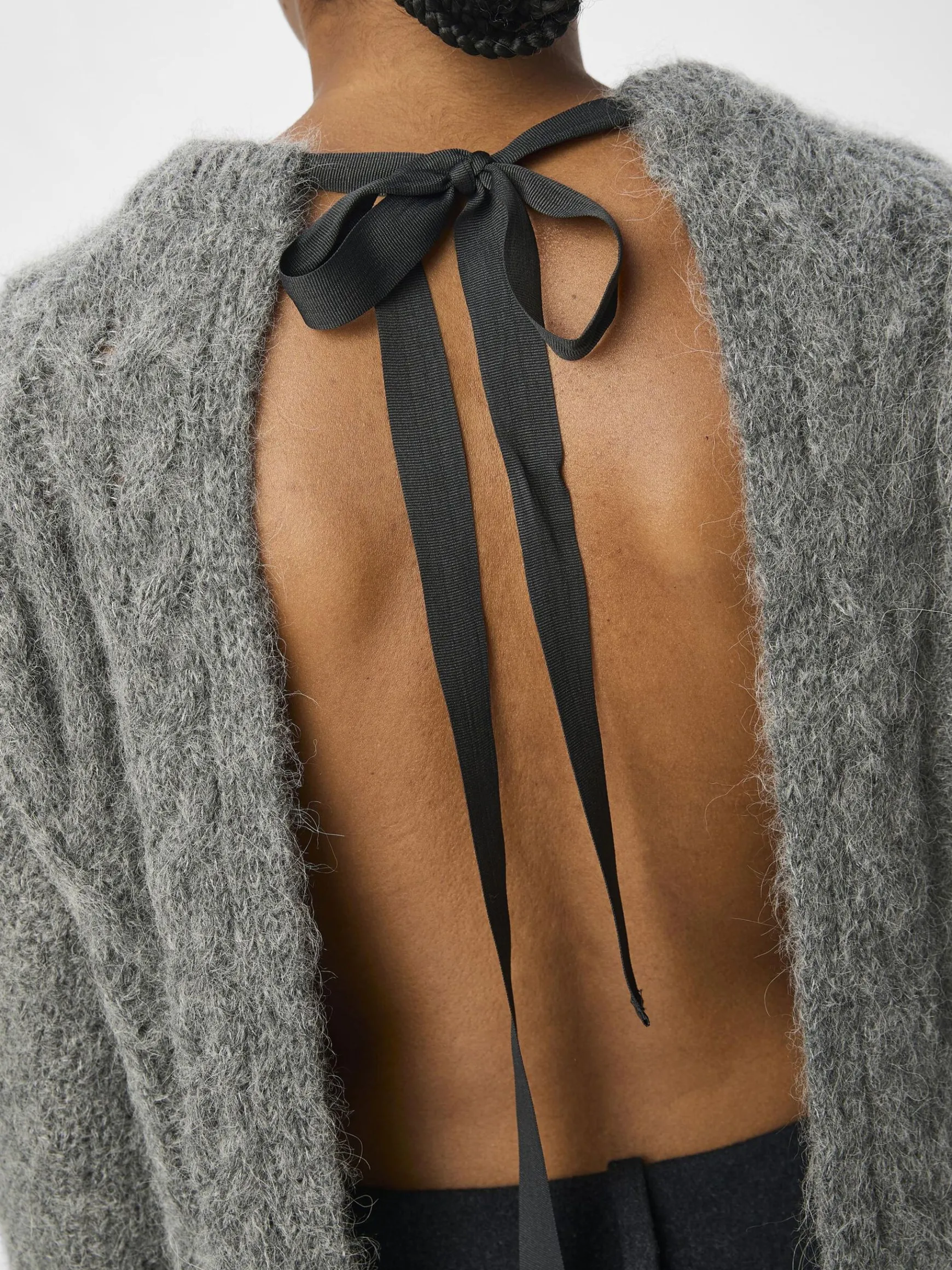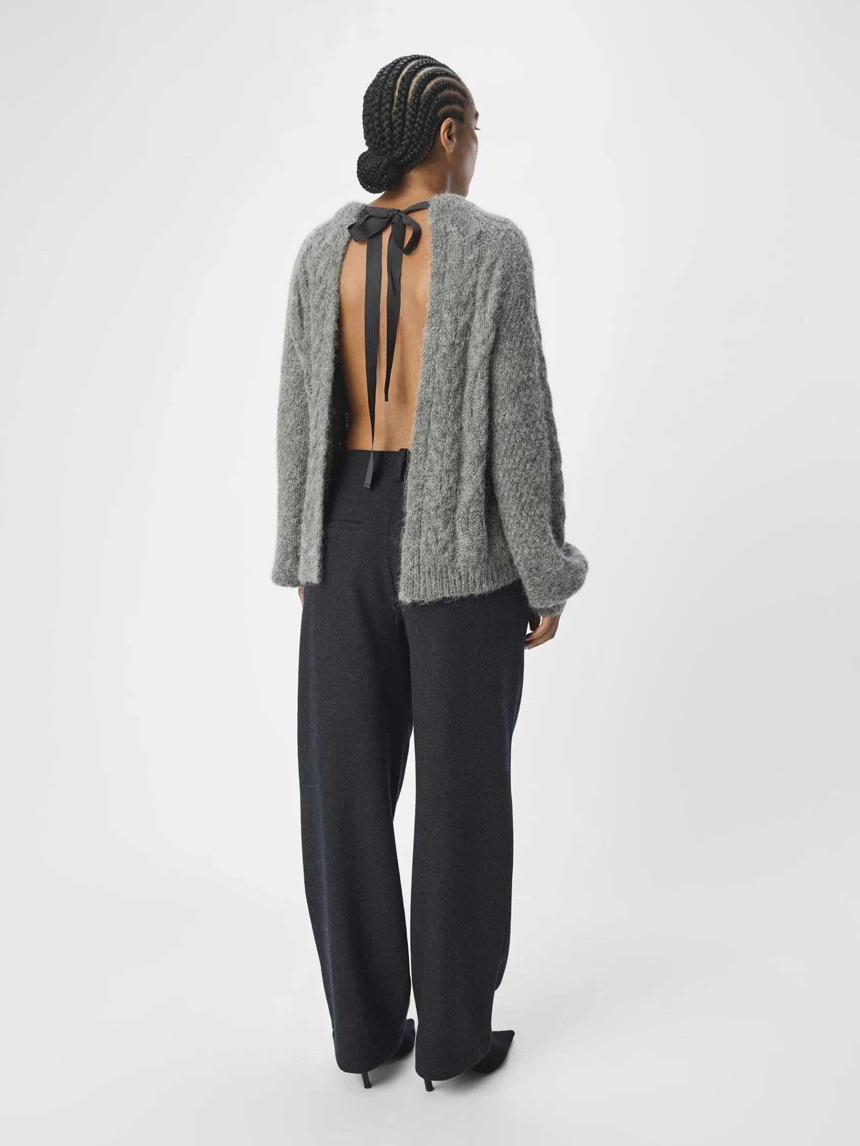 – Kabelstrikket trøje med åben ryg- Sløjfelukning- Rund halsudskæring- Lange voluminøse ærmer- Ribbede kanter- Alm…