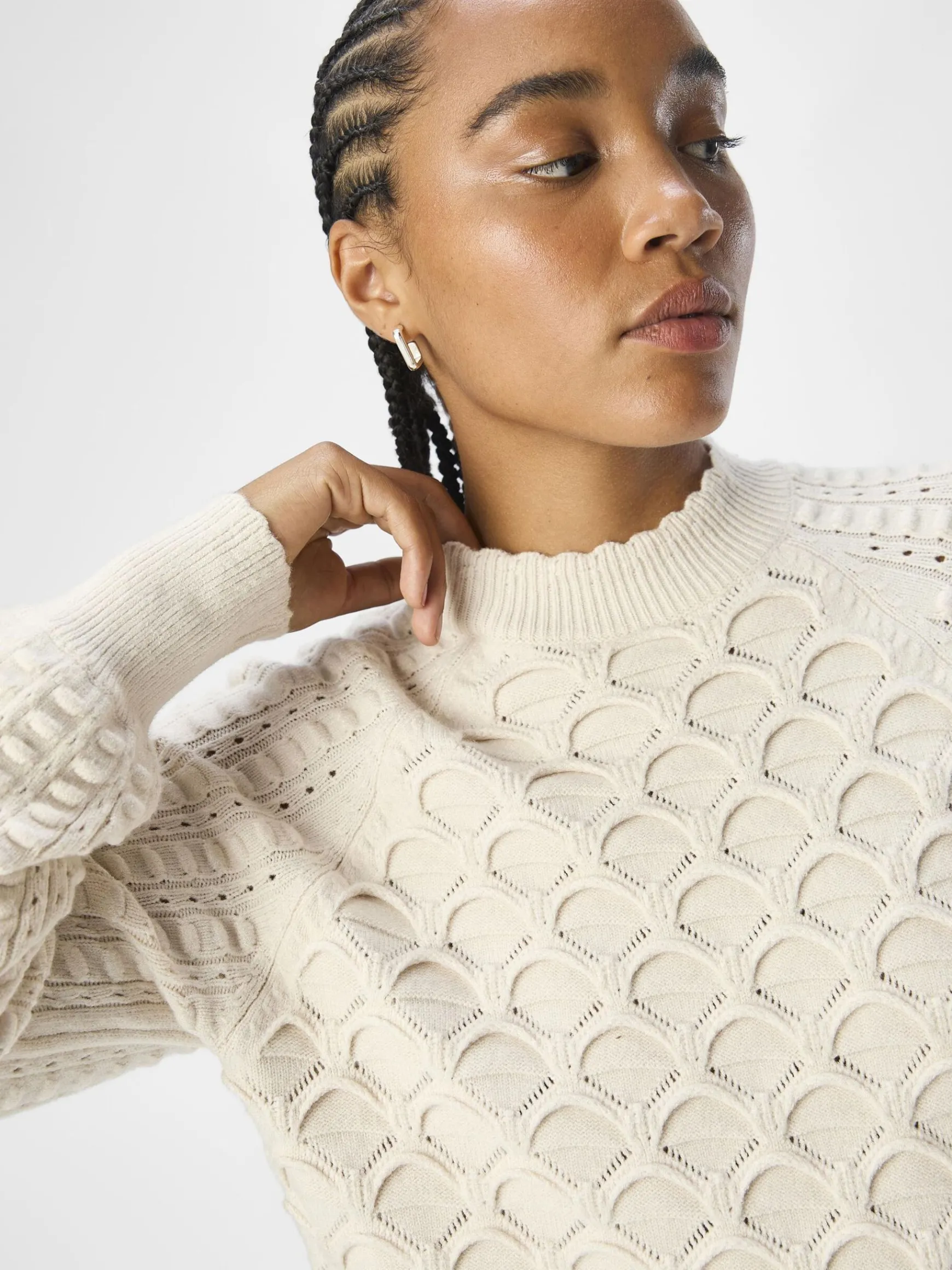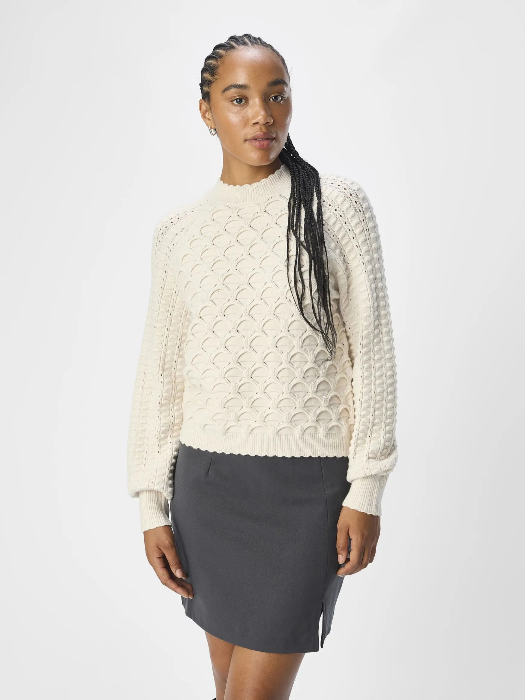 – Strikket trøje med tekstureret detalje- Høj hals- Raglan-skulder- Lange voluminøse ærmer- Finribbede tætsiddende ærmekanter- Bølgekant- Regular fit