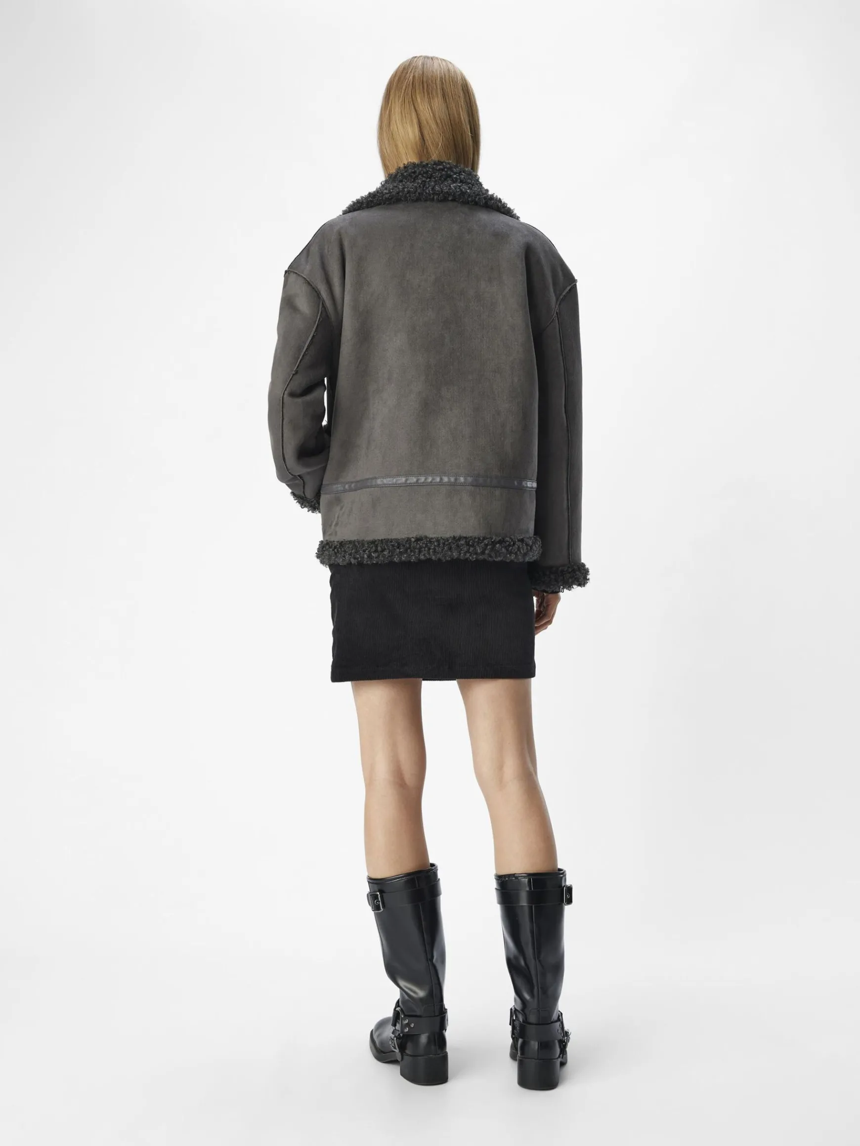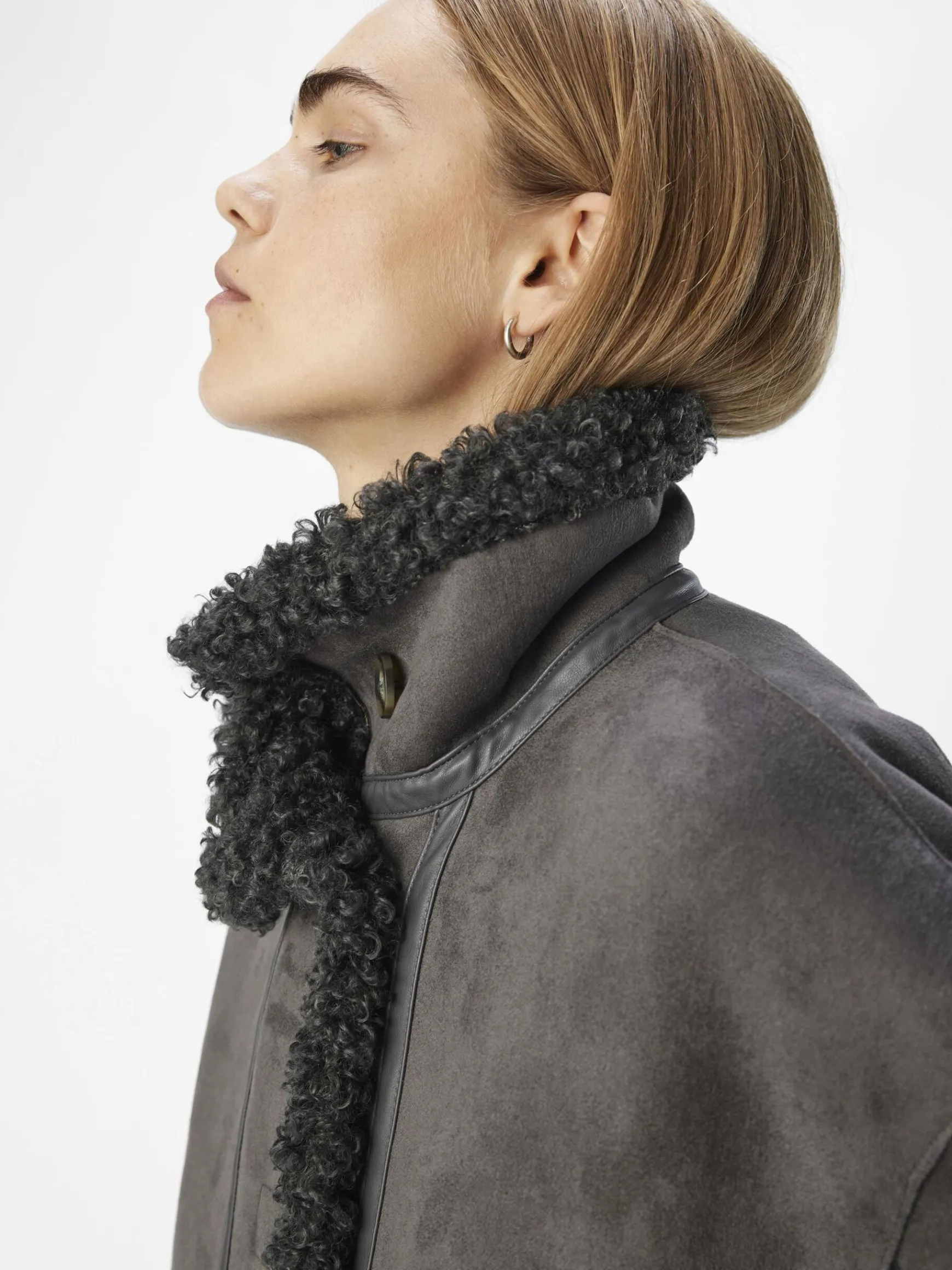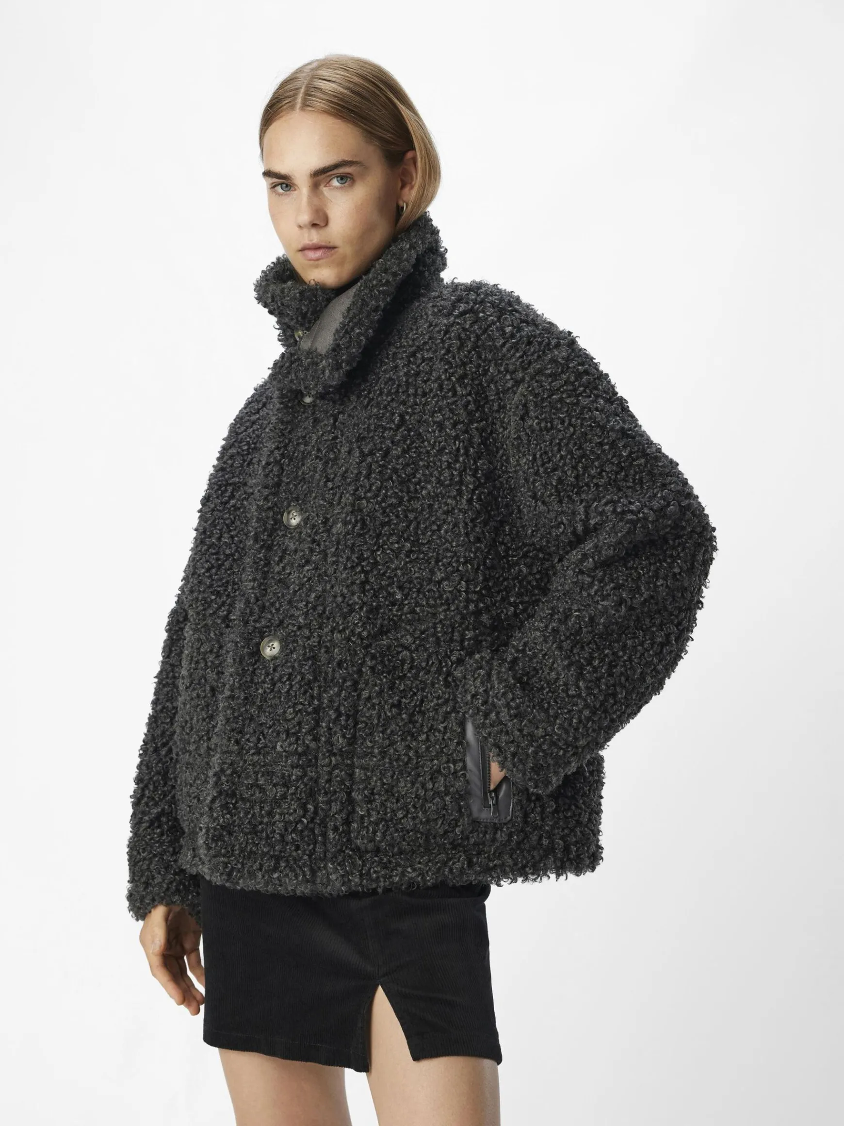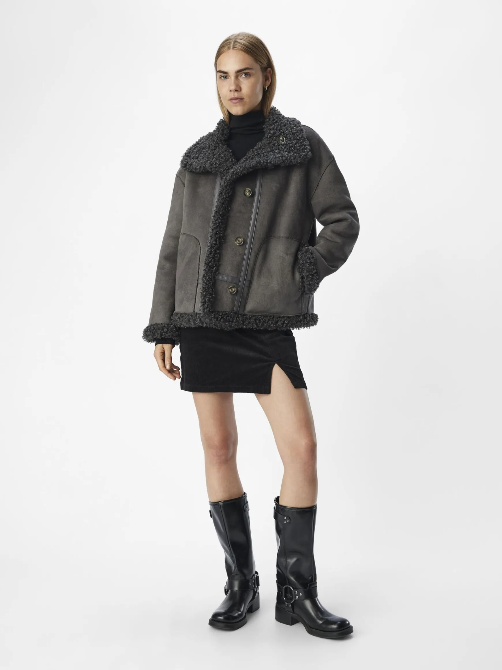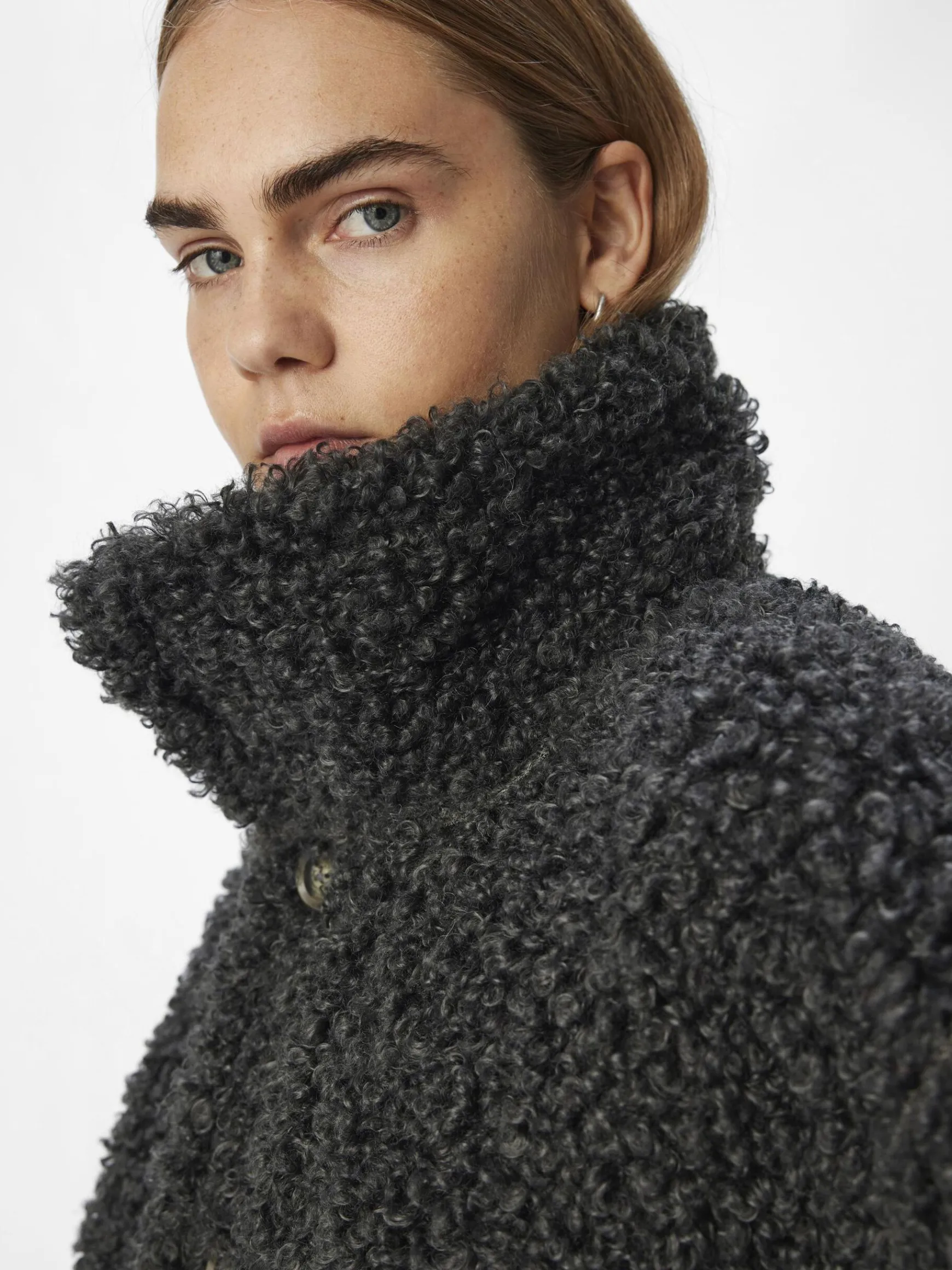 – Jakke med imiteret fåreuld- Asymmetrisk krave- Lange ærmer- Knapper foran- Forlommer- Kanter med synlig imiteret få…