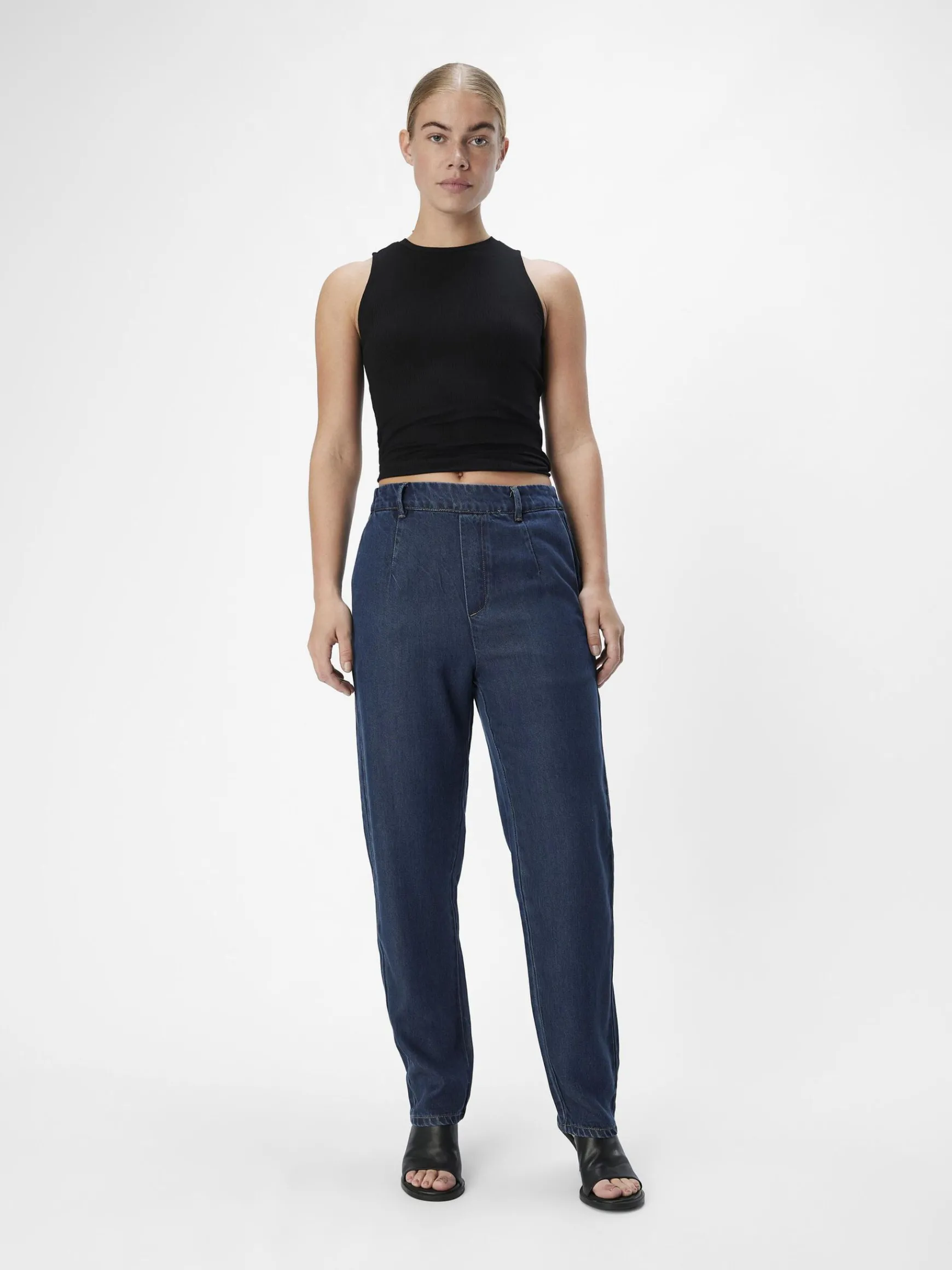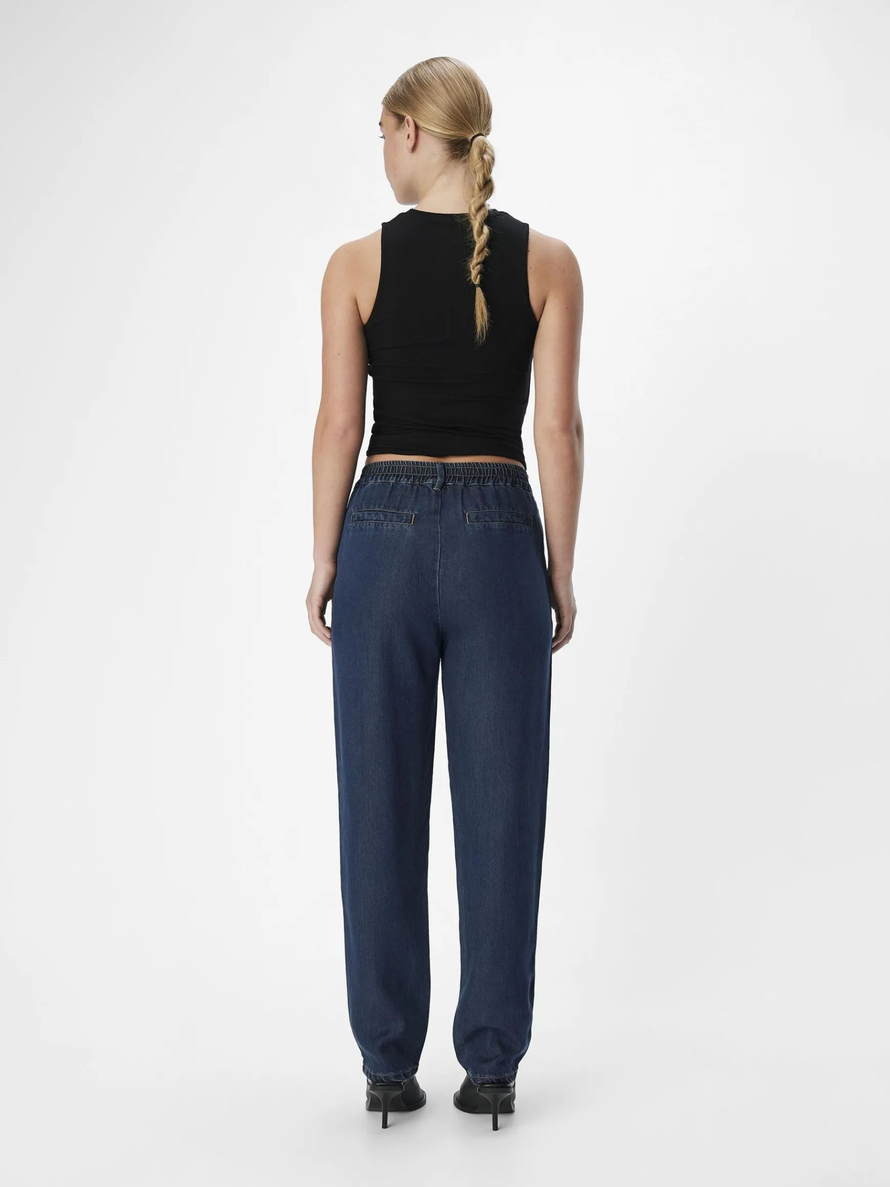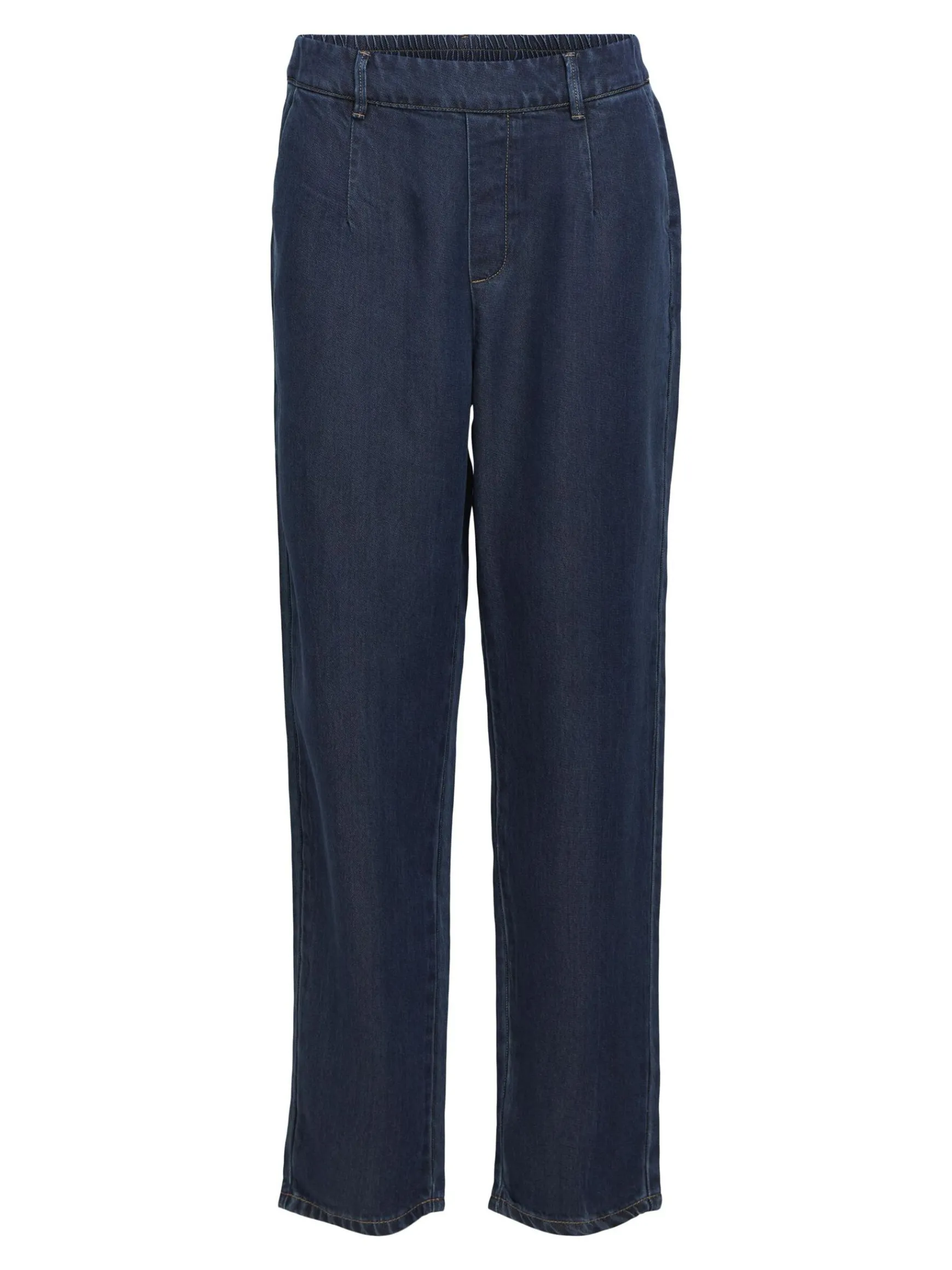 – Løse bukser med denim-look- Mellemhøj elastisk talje med bæltestroppper- Lommer i siden- Stolpe-lommer bagpå- Straight leg fit